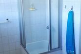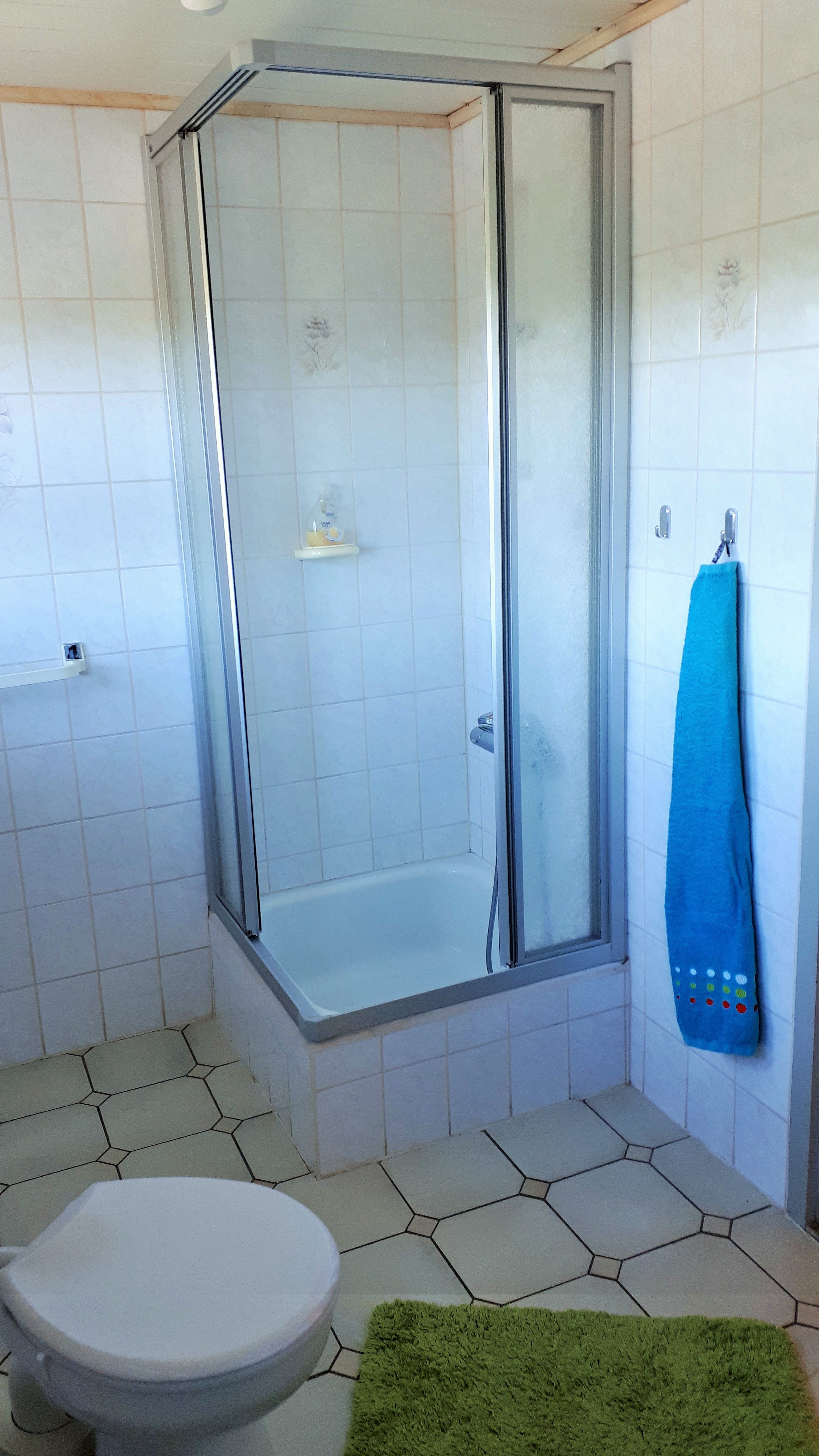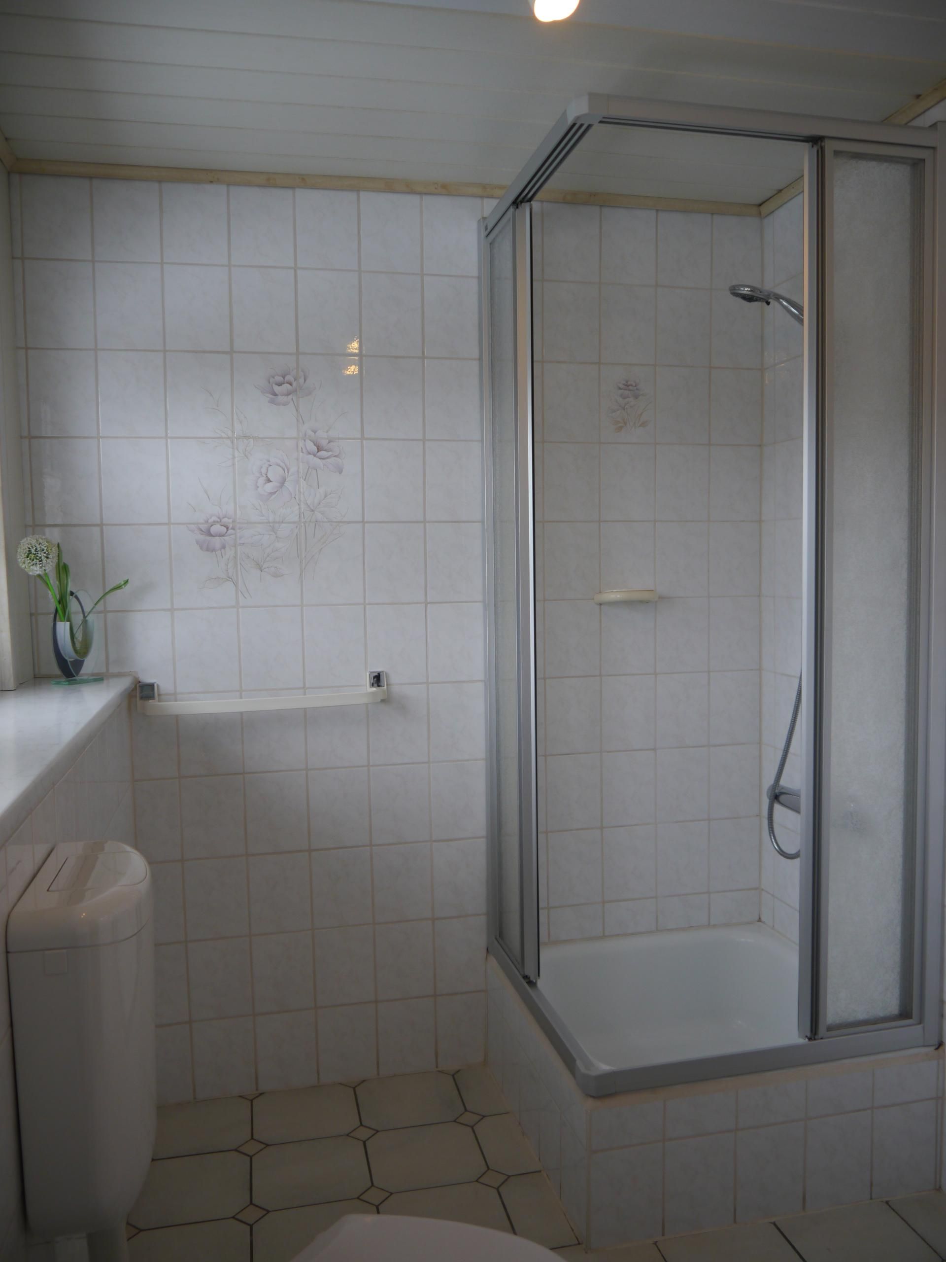 Das moderne Bad verfügt über eine Dusche mit Einstieg, ein Waschbecken mit Spiegelschrank, einen Handtuchhalter und einen Hochschrank mit Toilettenpapier.
