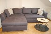 Im Wohnzimmer erwartet Sie ein einladendes L-förmiges Schlafsofa (ausziehbar auf Anfrage gegen Aufpreis), ein Couchtisch sowie ein TV auf einem Lowboard – ideal zum Entspannen nach einem erlebnisreichen Tag.