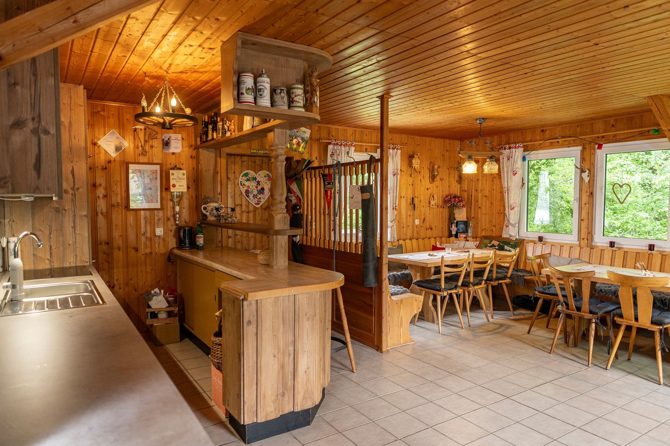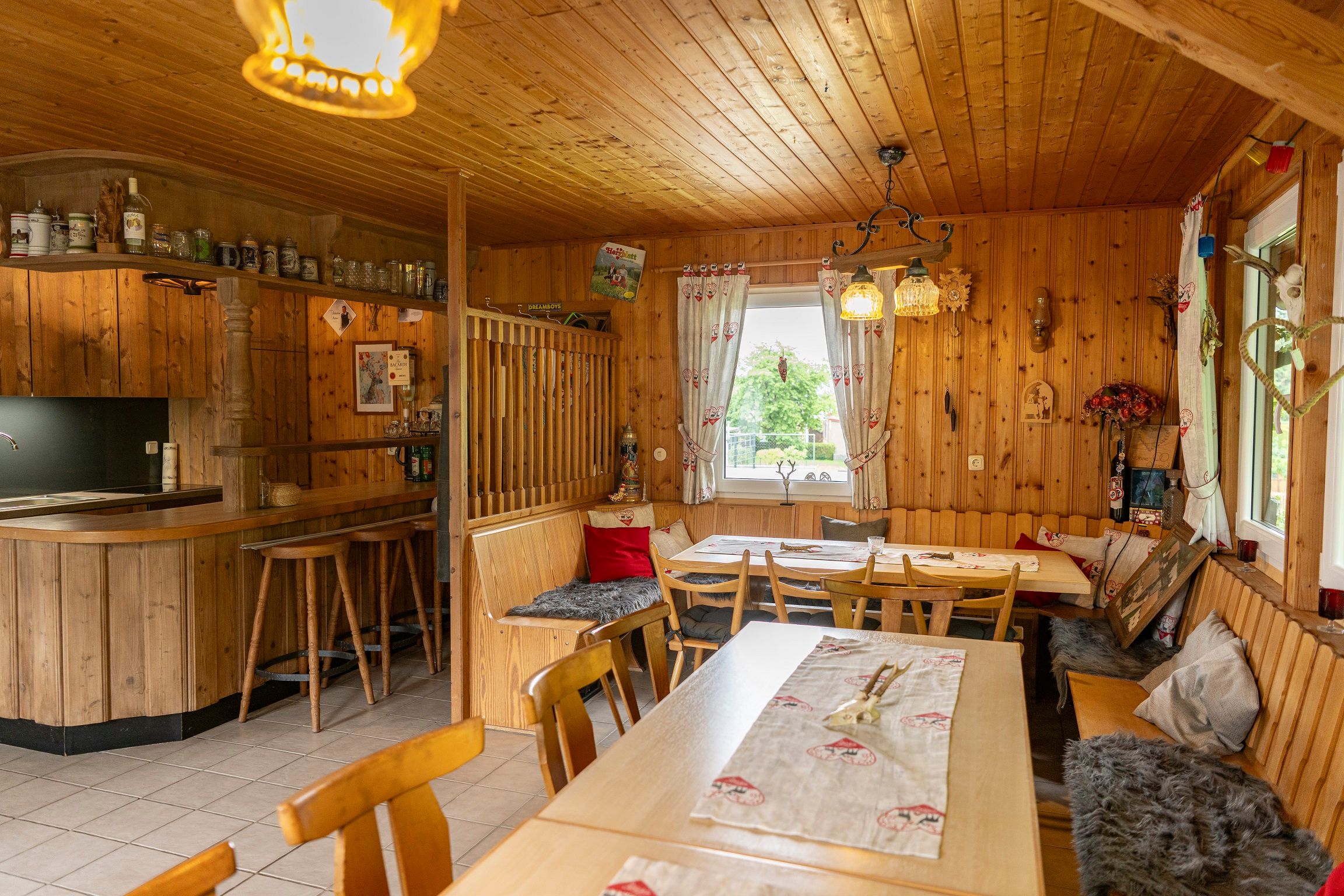 Die Küche ist bestens ausgestattet: Neben einer gemütlichen Sitzgruppe mit Eckbank, ausziehbarem Tisch und Sessel finden Sie alle nötigen Geräte und Utensilien für Ihre Mahlzeiten – darunter Kaffeemaschine, Wasserkocher, Backofen mit Kochfeld, Toaster, Eierkocher, Brotmaschine und Spüle. Geschirr, Besteck und Gläser für vier Personen sowie viele praktische Küchenhelfer stehen Ihnen zur Verfügung. Auch ein DAB-Radio und Amazon Alexa sorgen für Unterhaltung.