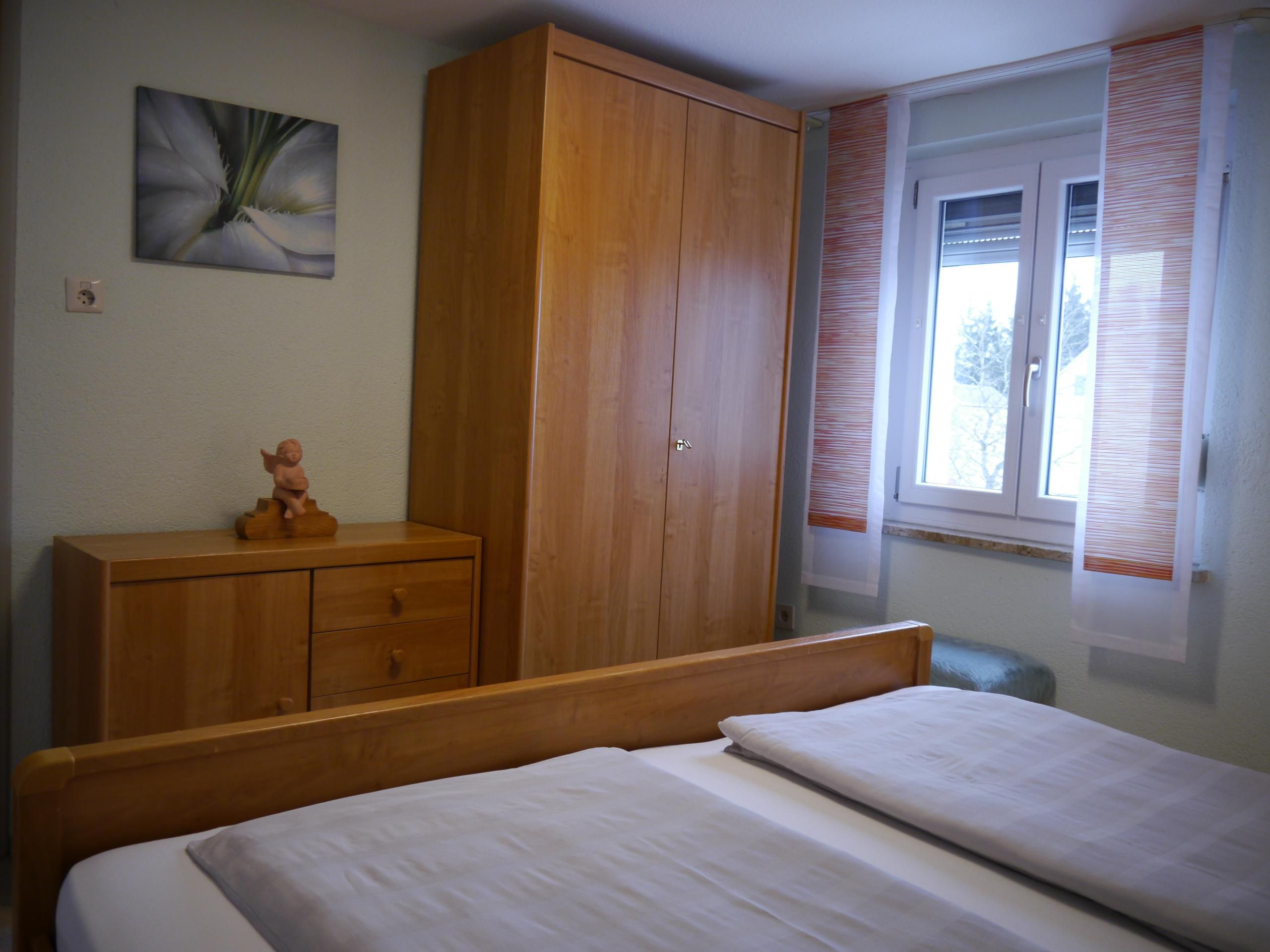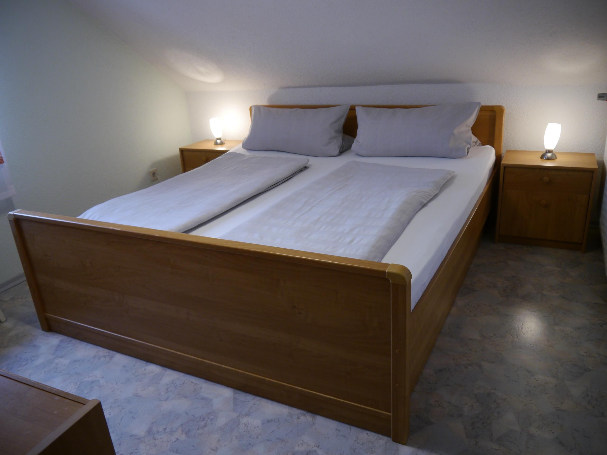 Das Schlafzimmer ist mit einem komfortablen Doppelbett (1,80 x 2,00 m) und verstellbaren Lattenrosten ausgestattet. Nachttische mit Lampen und Steckdosen, ein geräumiger Kleiderschrank sowie eine Kommode sorgen für ausreichend Stauraum. Für gesellige Abende stehen verschiedene Gesellschaftsspiele bereit.