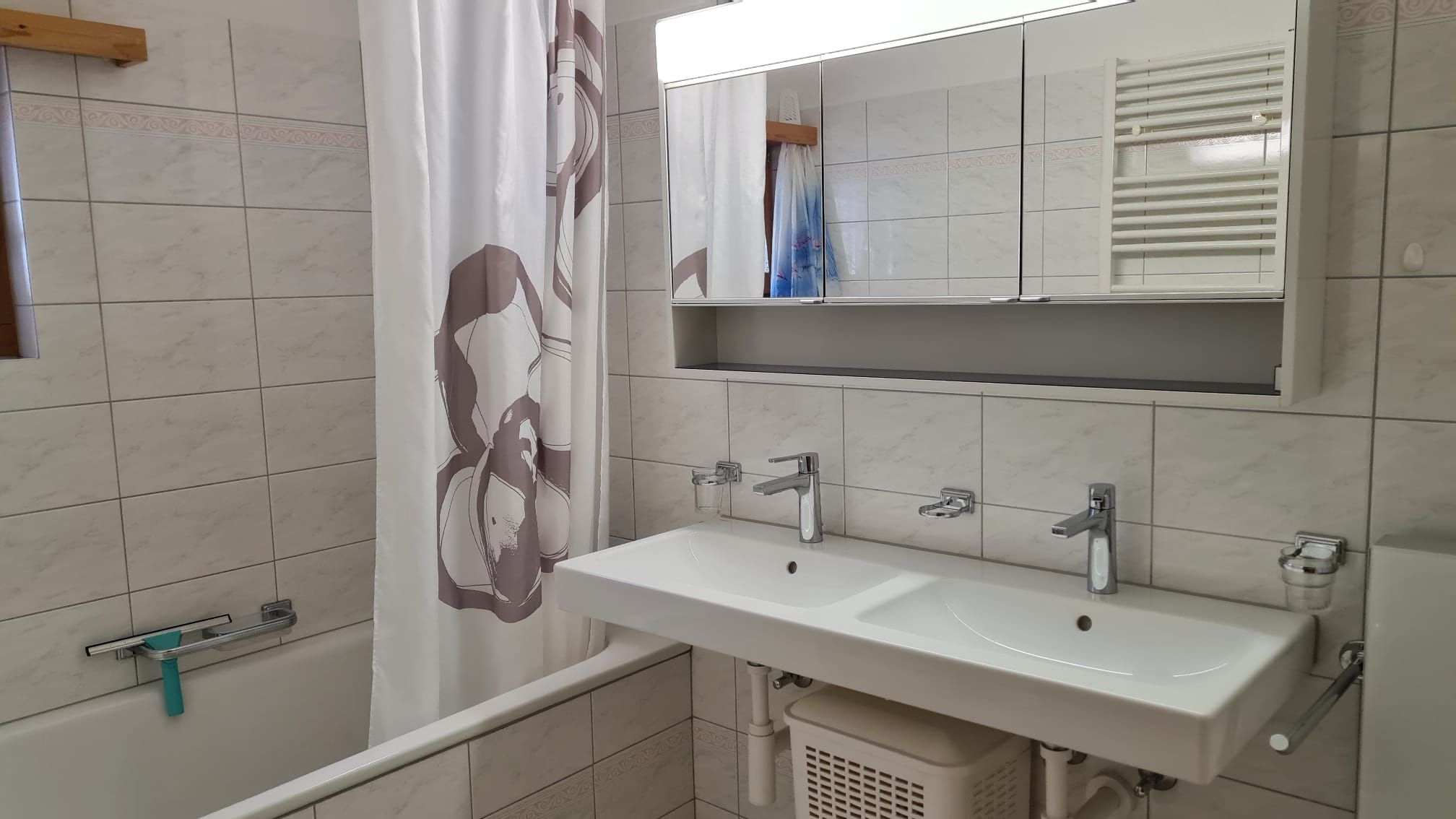 Das Badezimmer ist mit einem Doppelwaschbecken, einer Badewanne (auch zum Duschen) und einem WC ausgestattet. Die Frottewäsche muss mitgebracht werden.