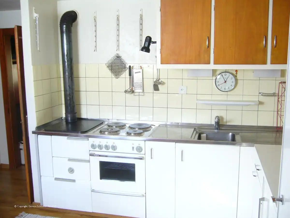 Grosszügiges Bad mit Badewanne. Wohnküche mit Elektroherd mit Ofen (4 Kochplatten) & Holzofen (eine Kochplatte).