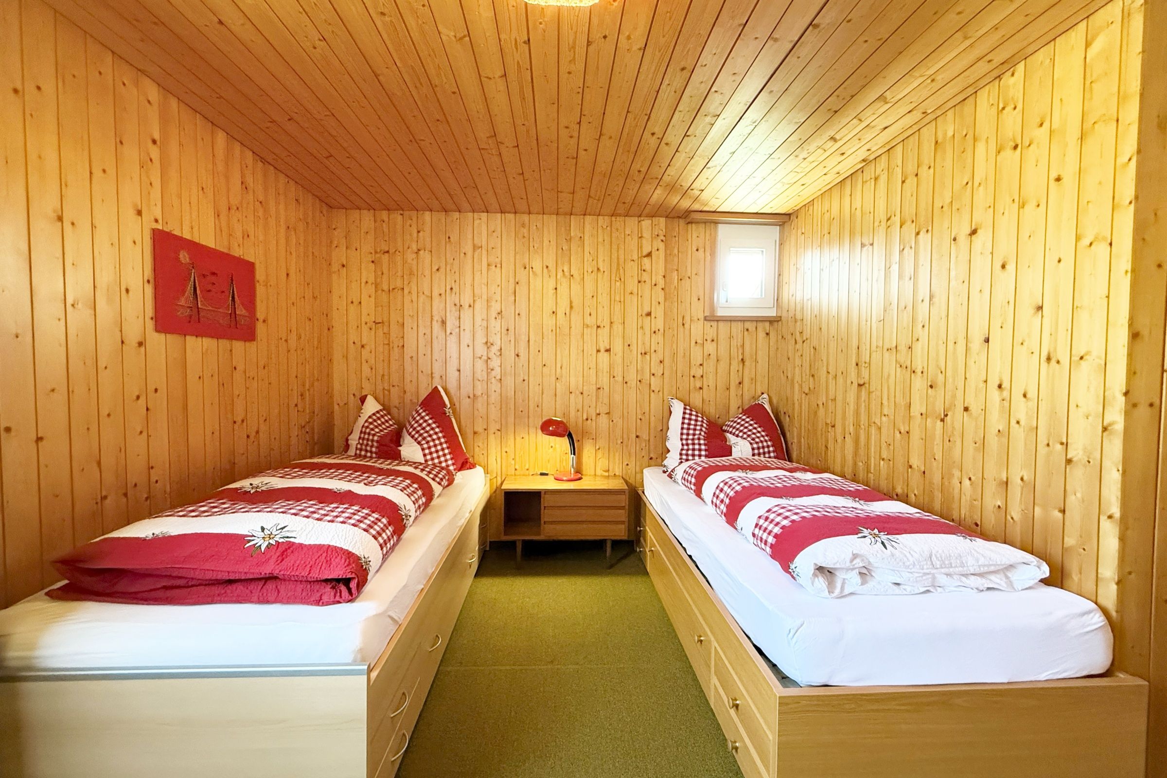 Die 3.5-Zimmerwohnung im Erdgeschoss verfügt über ein Schlafzimmer mit einem Doppelbett ein Schlafzimmer mit zwei Einzelbetten und zusätzlicher Schlafgelegenheit ein Badezimmer mit Dusche und WC ein geräumiges Wohnzimmer mit Essbereich, Sofa, Fernsehstuhl und zwei Sitzsäcken eine voll ausgestattete Küche mit Backofen, Geschirrspüler und Kaffeemaschine Inneneinrichtung & Technik