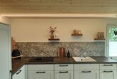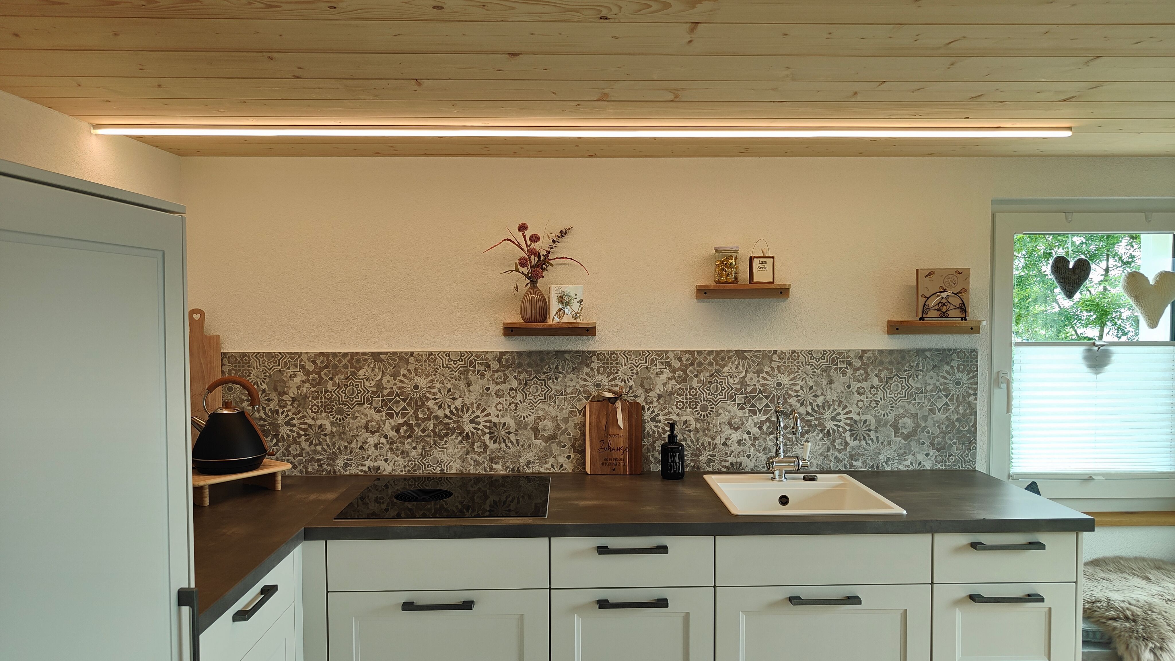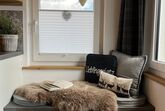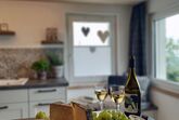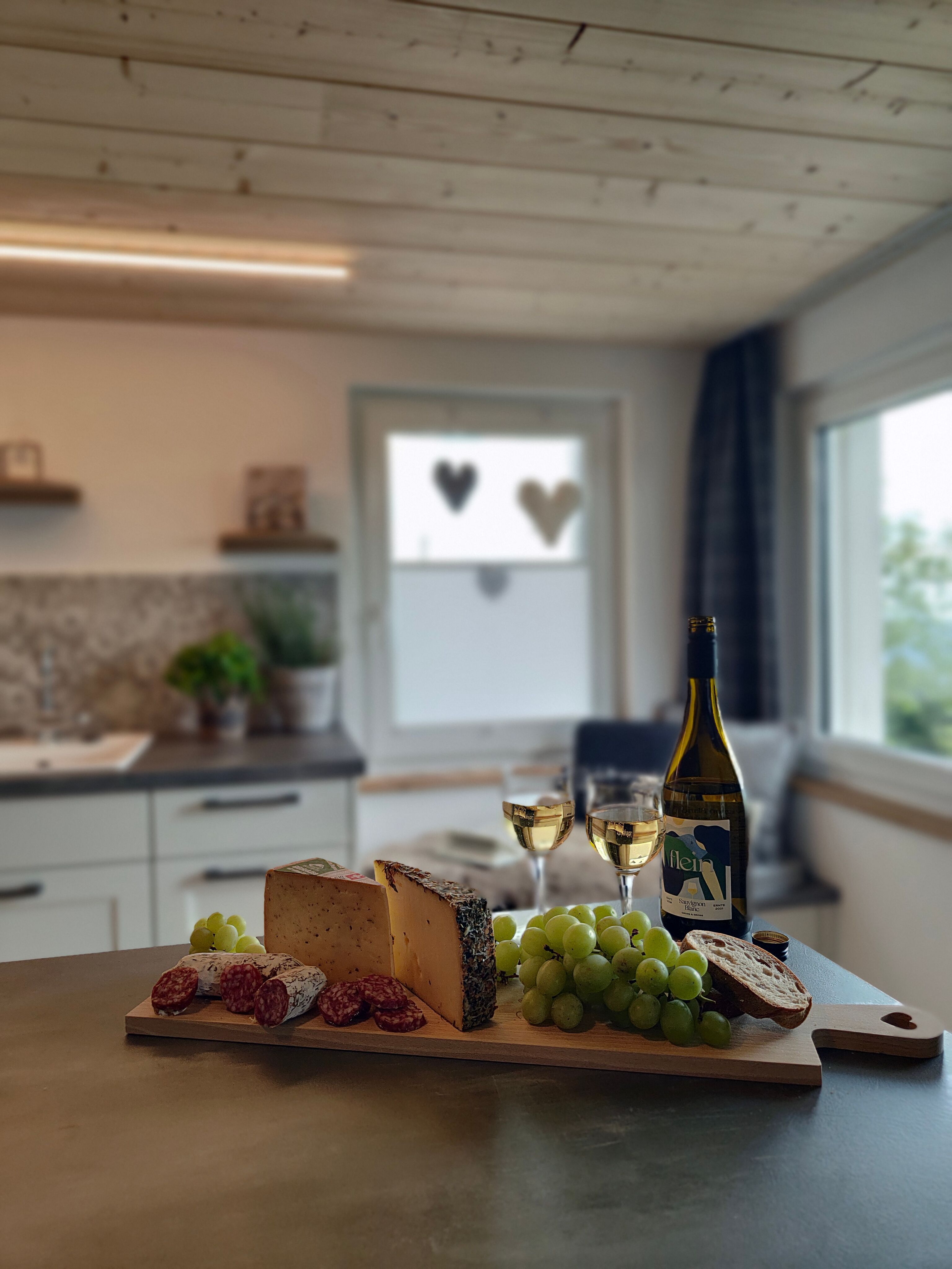 Im Inneren erwartet Sie ein gemütliches Ambiente mit einer voll ausgestatteten Küche, die einen Induktionsherd, eine Kapsel-Kaffeemaschine und einen Wasserkocher umfasst. Für Gemütlichkeit an kühleren Abenden sorgt der Cheminéeofen, während die Fußbodenheizung in allen Räumen für angenehme Wärme sorgt. Das Ferienhaus bietet drei Schlafzimmer und ein Badezimmer mit Dusche, ideal für einen komfortablen Aufenthalt.