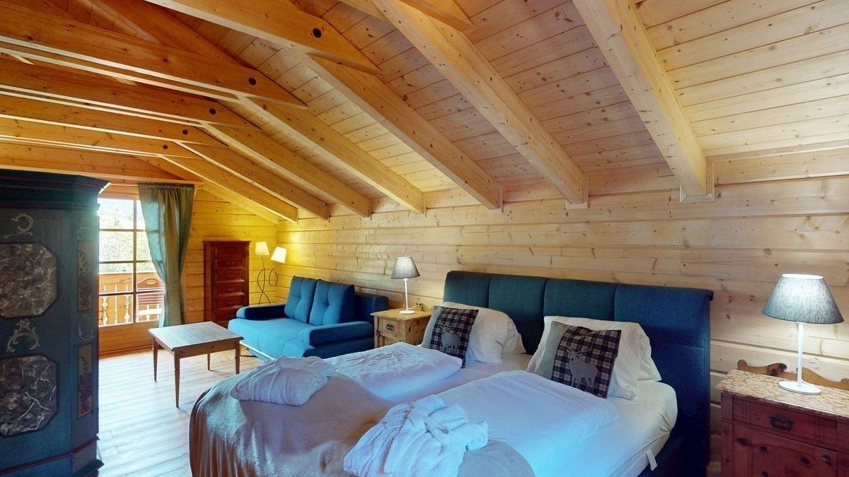 1 Schlafzimmer mit Doppelbett, ausziehbarem Schlafsofa und Zugang zum Balkon im Obergeschoss