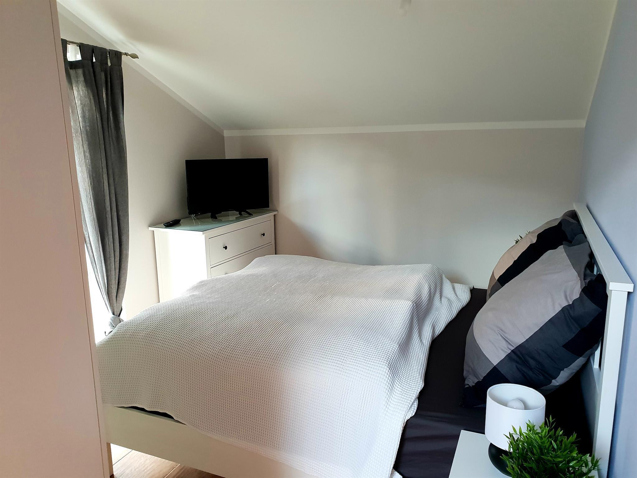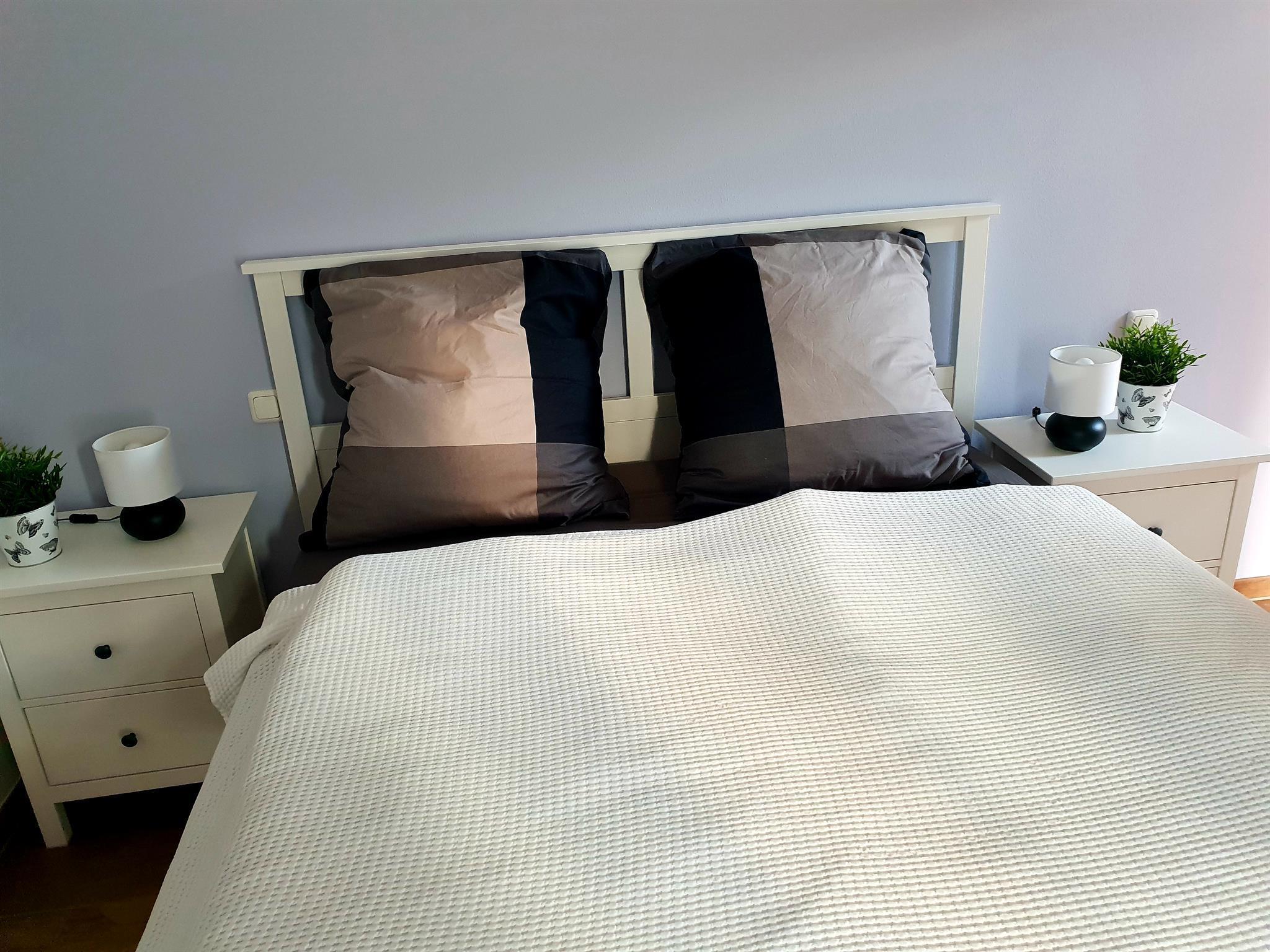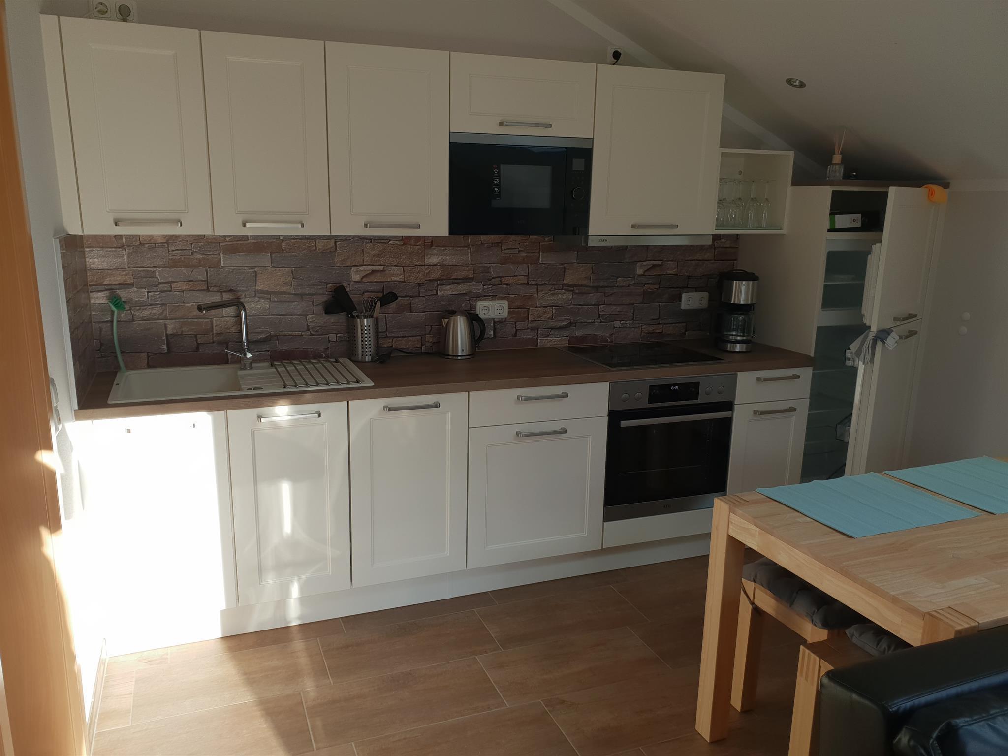 • Küche mit Mikrowelle, Zerankochfeld, Ofen, Kühlschrank, Eisfach, Geschirrspühlmaschine, Kochgeschirr, Teller, Besteck