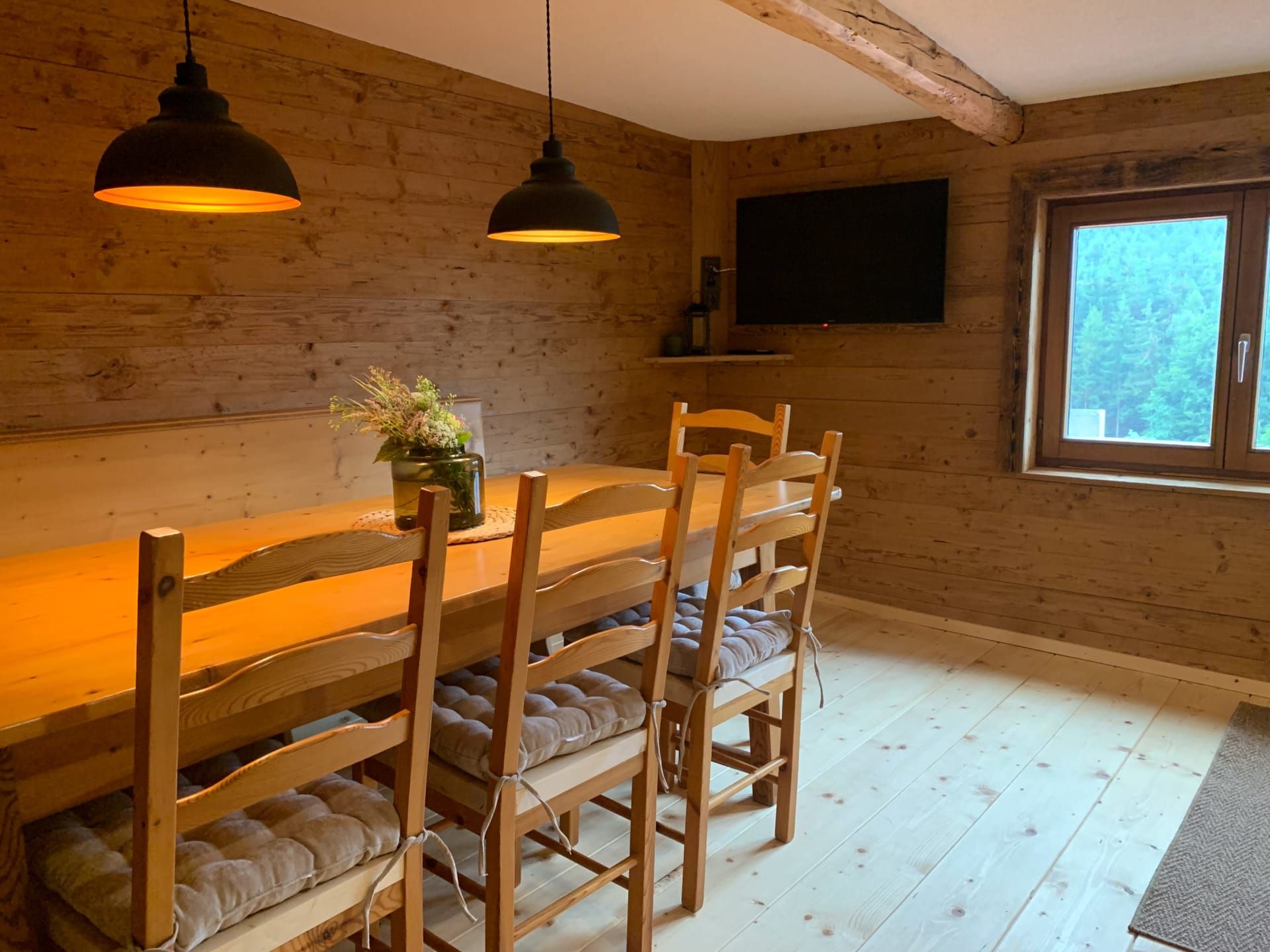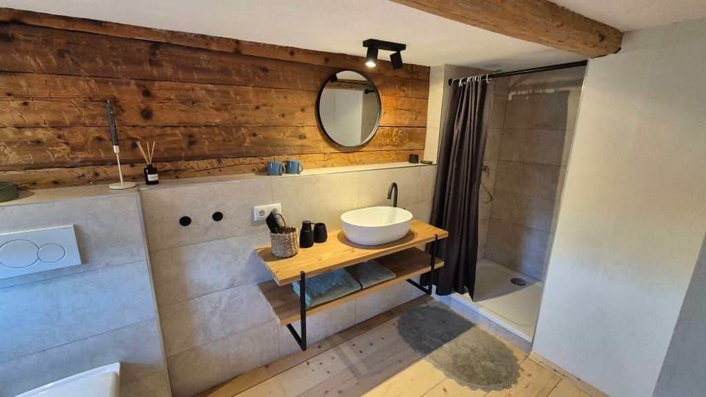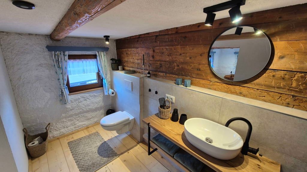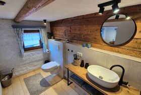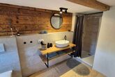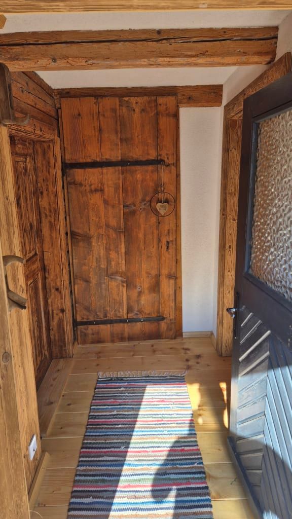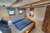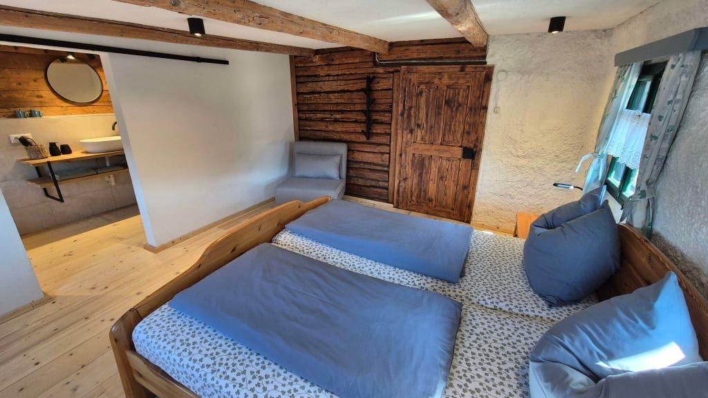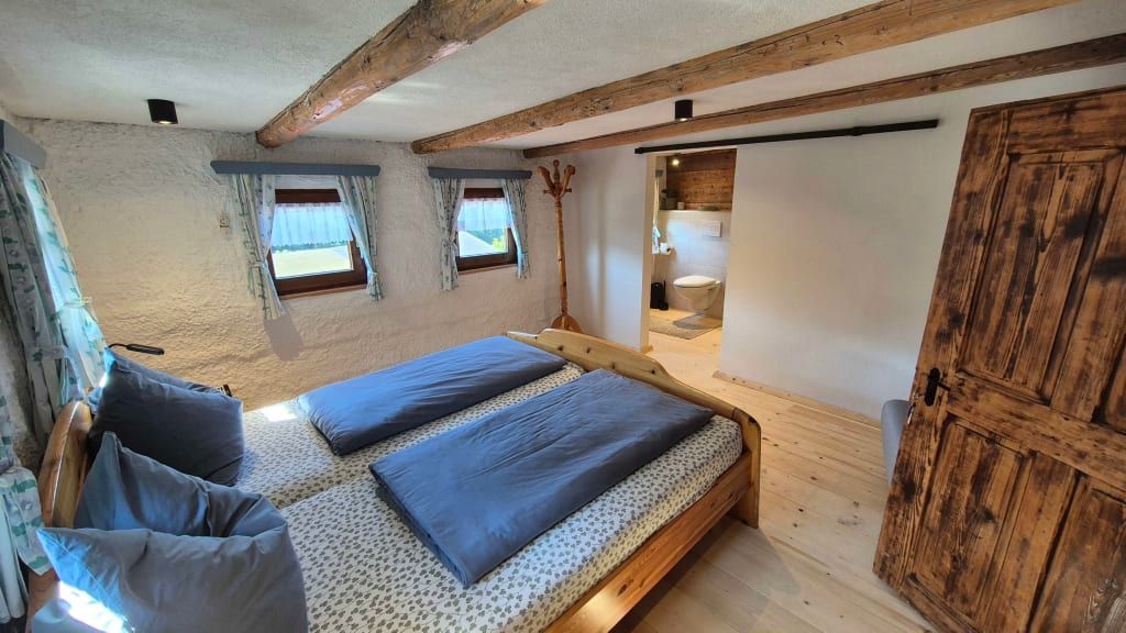 Das Doppelzimmer befindet sich im renovierten Obergeschoss des historischen Bauernhauses. Es ist mit einem komfortablen Doppelbett ausgestattet.