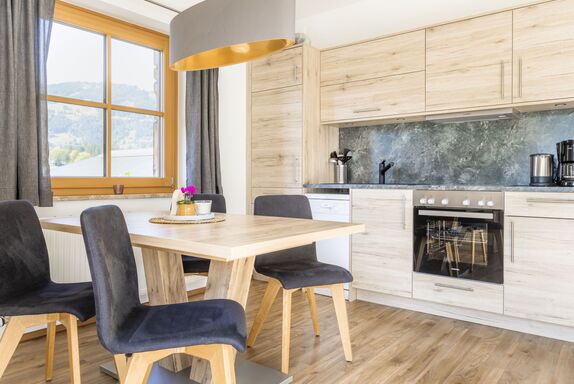 Kitzblick, 3-Zimmer-Wohnung 70 m2. Modern und gemütlich eingerichtet: Eingang. Wohn-/Esszimmer mit Esstisch, Essecke, Sat-TV und E-Heizung. 2 Doppelzimmer. Offene Küche (Backofen, Geschirrspüler, 4 Induktionskochplatten, Toaster, Wasserkocher, Mikrowelle, Tiefkühler). 2 Duschen, sep. WC. Parkettboden. Grosser Balkon. Balkonmöbel. Schöne Sicht auf die Landschaft. Bitte beachten: Nichtraucher-Unterkunft. 50619-005911-2020