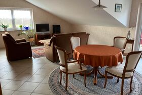 Unsere gemütliche Ferienwohnung ist 82m² groß und verfügt über 2 Schlafräume, ein großes Wohn- und Esszimmer mit Zugang zum Balkon, einer komplett eingerichteten Küche mit Backofen, Geschirrspüler, Kaffeemaschine, Toaster, usw. Großes Tageslichtbad mit Badewanne, Dusche und WC und ein zusätzliches WC.