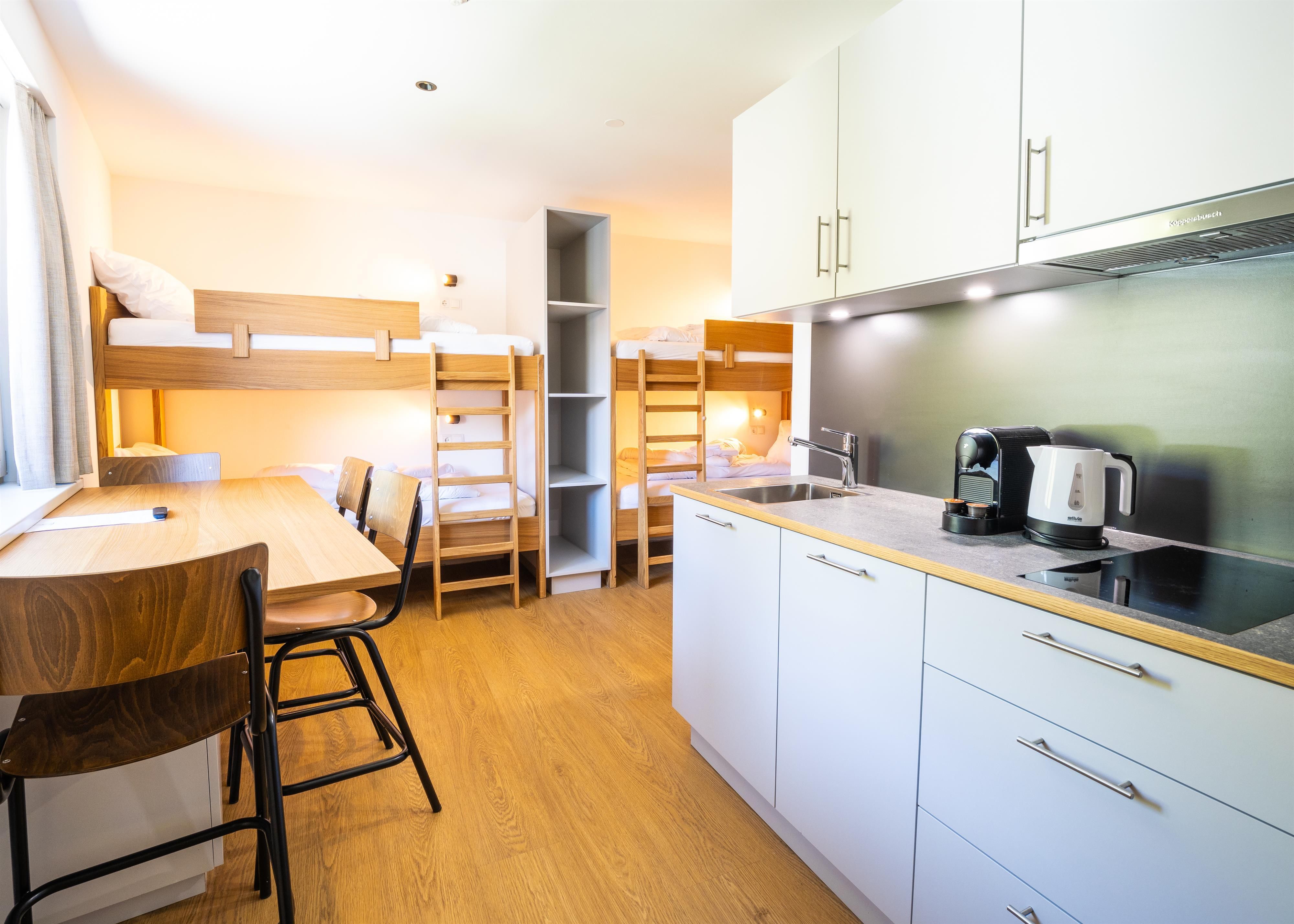 Doppelzimmer für 2 Personen mit Naturfliesenboden im Badezimmer und Antiallergischen Boden im Wohnbereich, Möbel aus Eichenholz, komplett ausgestattete Küchenzeile, Kaffeemaschine, Wasserkocher, Badezimmer, Dusche, WC, TV, Radio, WLAN