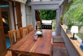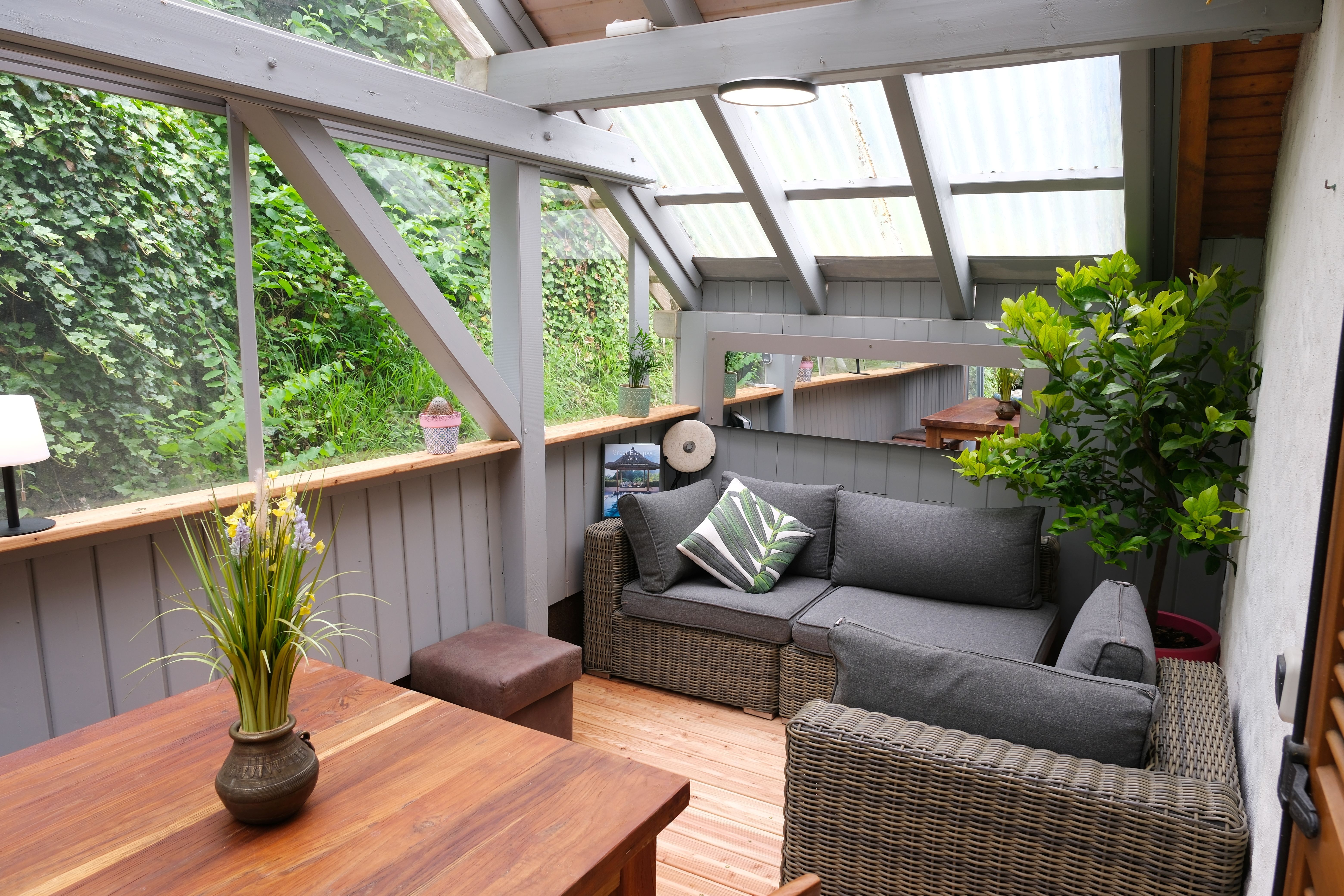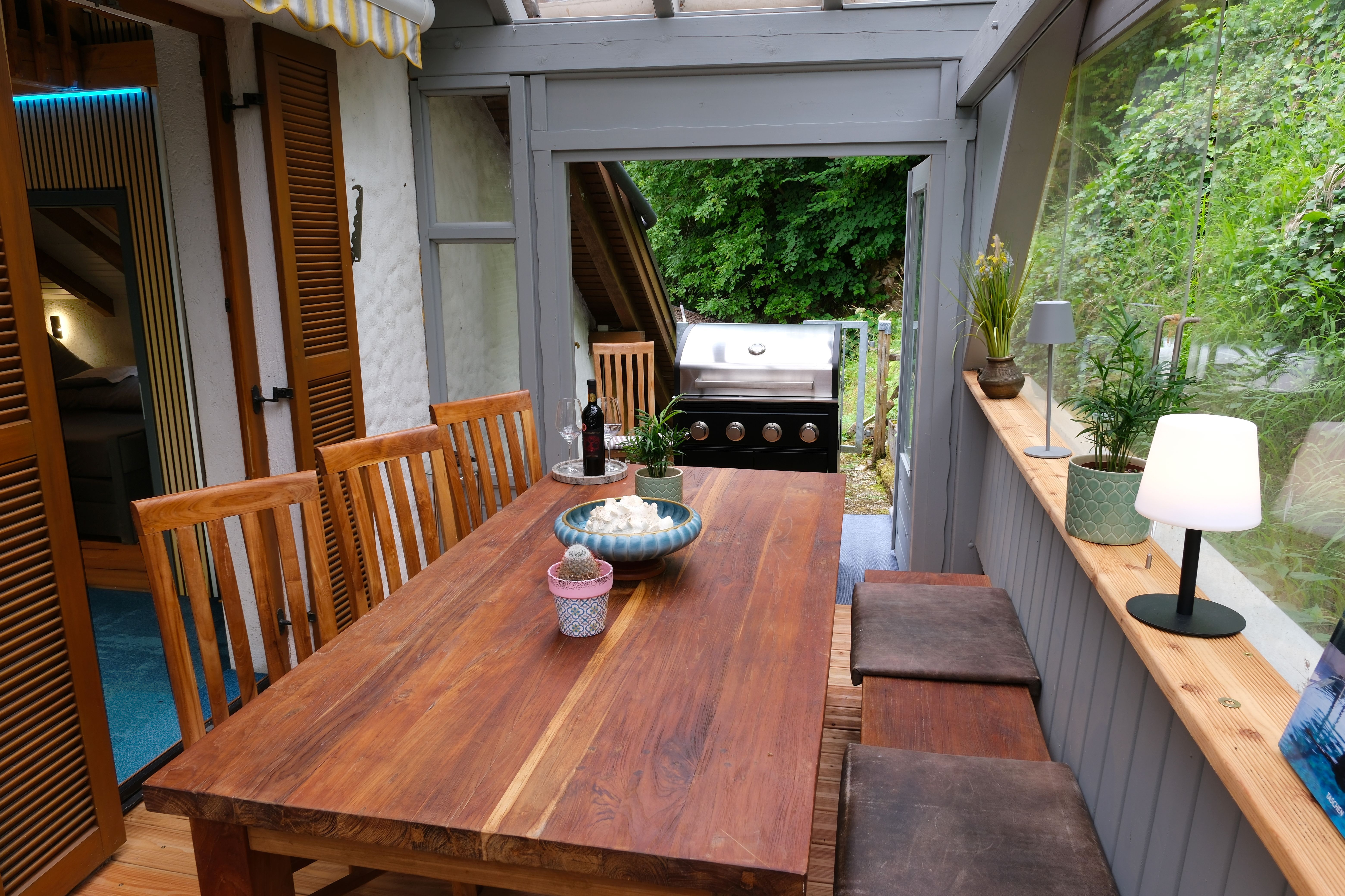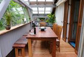 Zur Gebäuderückseite führt eine Türe in einen Wintergarten. Dieser bietet neben einem großen Teakholz Esstisch mit 4 Stühlen und einer Teakholzbank genügend Platz für Sie!
