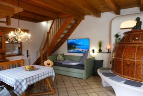 Ein sehr gemütlicher holzbeheizbarer Kachelofen sorgt bei kühleren Temperaturen für ein behagliches Raumklima.