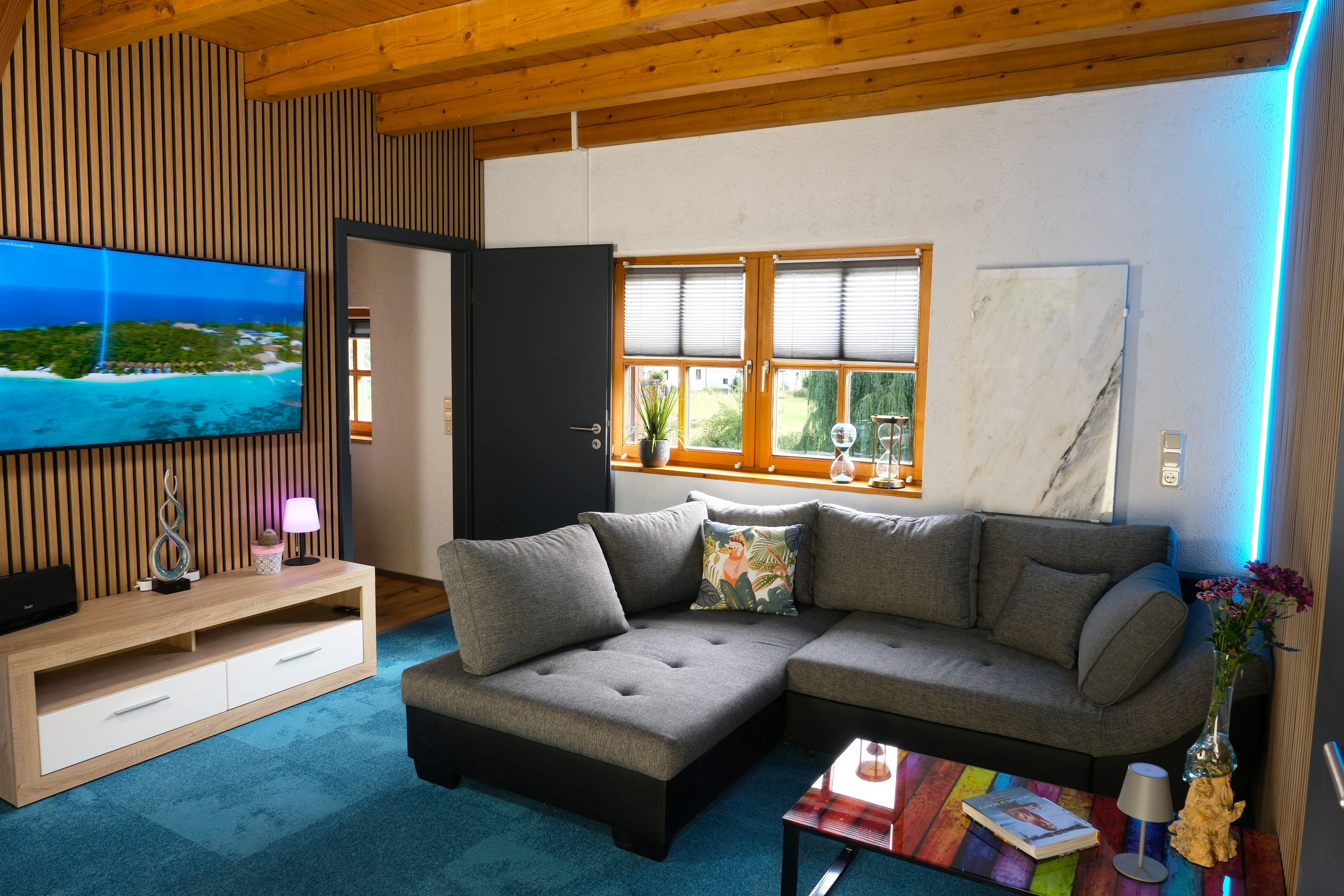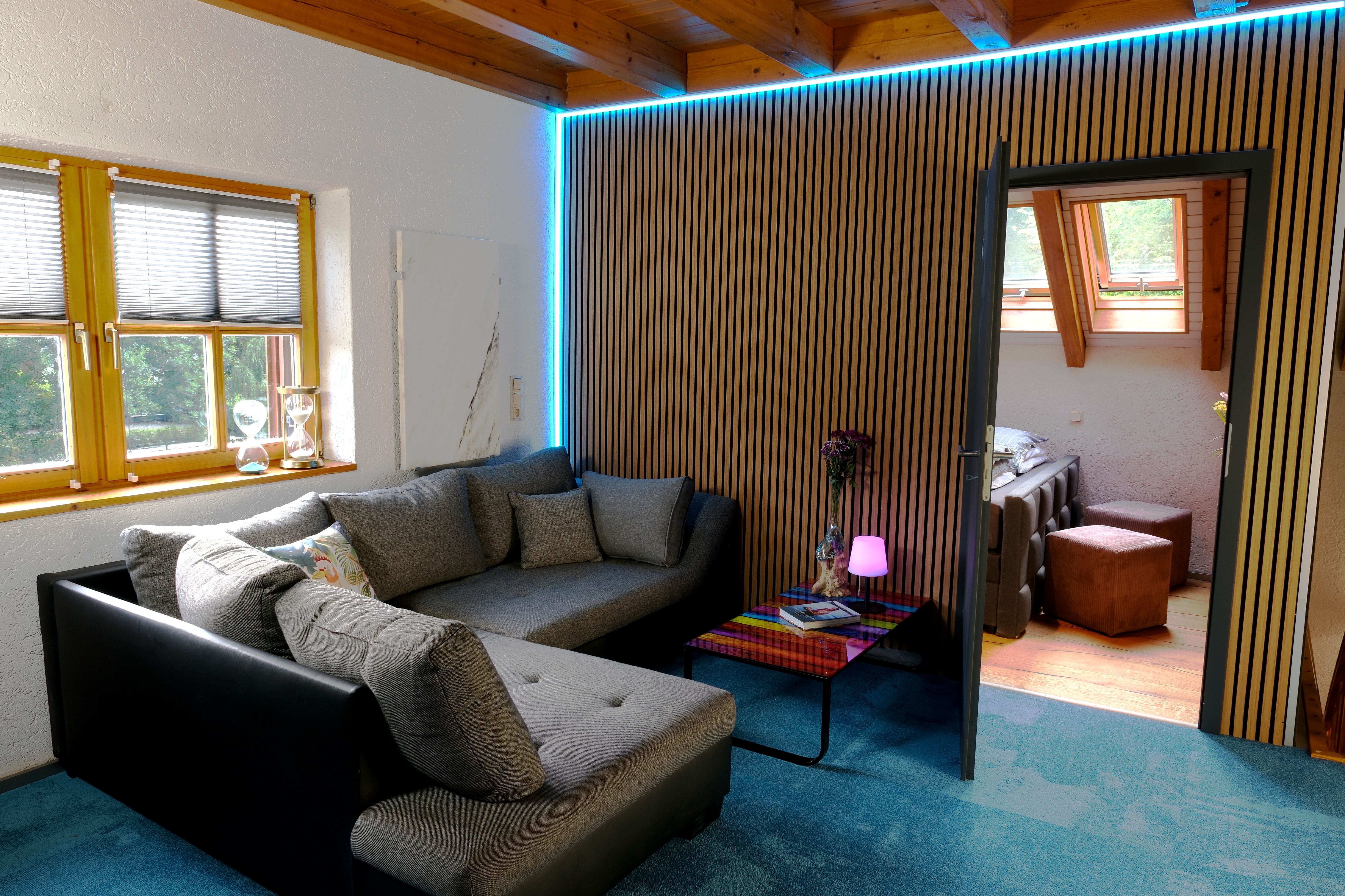 Über eine Holztreppe gelangt man ins 1. OG. Es erwartet Sie ein zentraler Wohn- und Aufenthaltsraum mit Sofa- und Sitzecke sowie einem großzügigen 55-Zoll Flatscreen-TV. Vom Wohnraum gelangt man in die beiden Schlafzimmer.