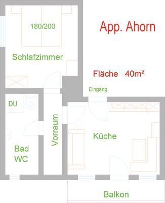 Gemütliche Ferienwohnung für 2 Personen, 40m², Wohnküche, Schlafzimmer, Dusche/WC, Sat-TV, Südbalkon.