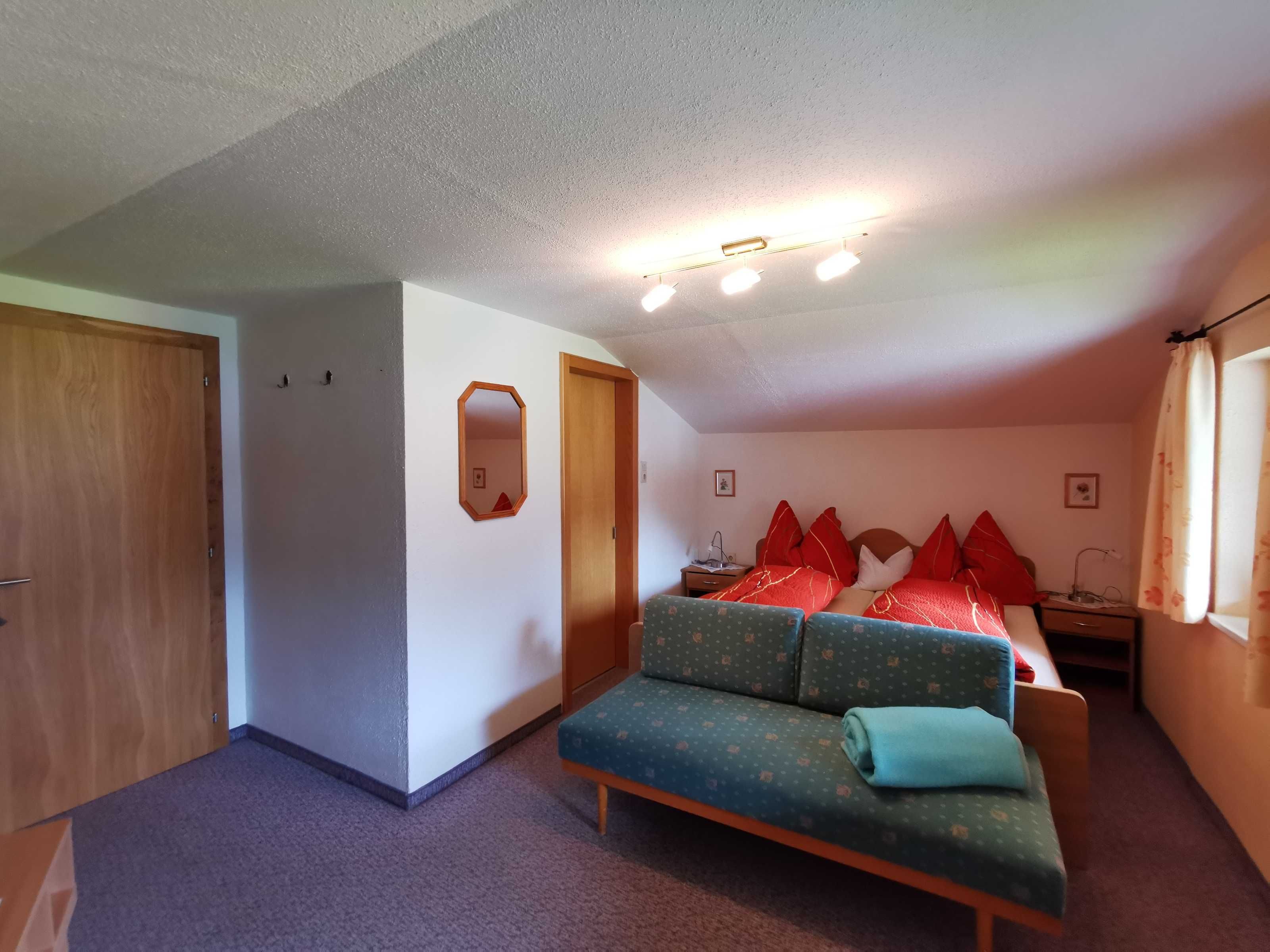 Unser geräumiges, südseitiges Doppelzimmer ohne Balkon befindet sich im 2. Stock mit weitem Blick auf die Tannheimer Berge.