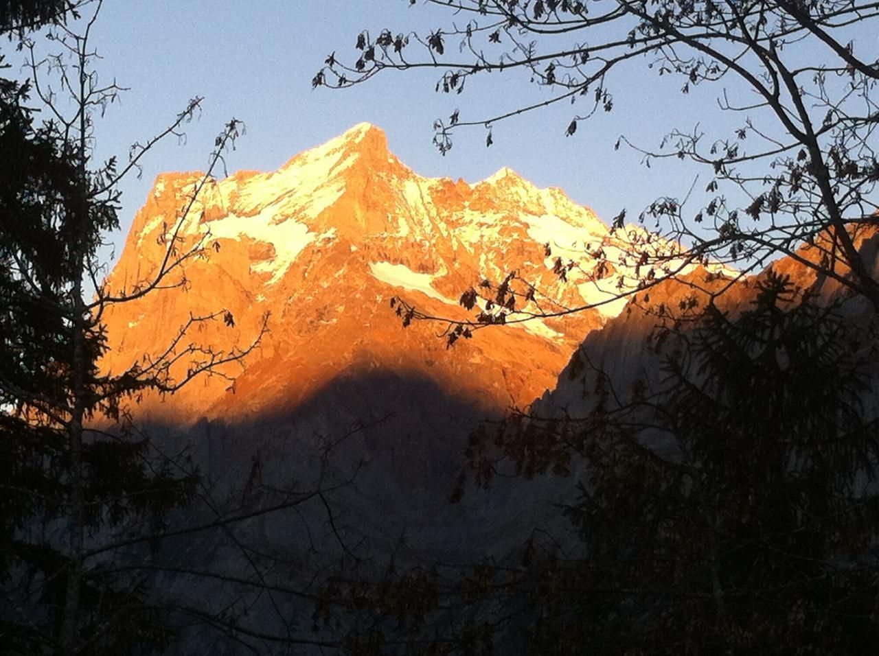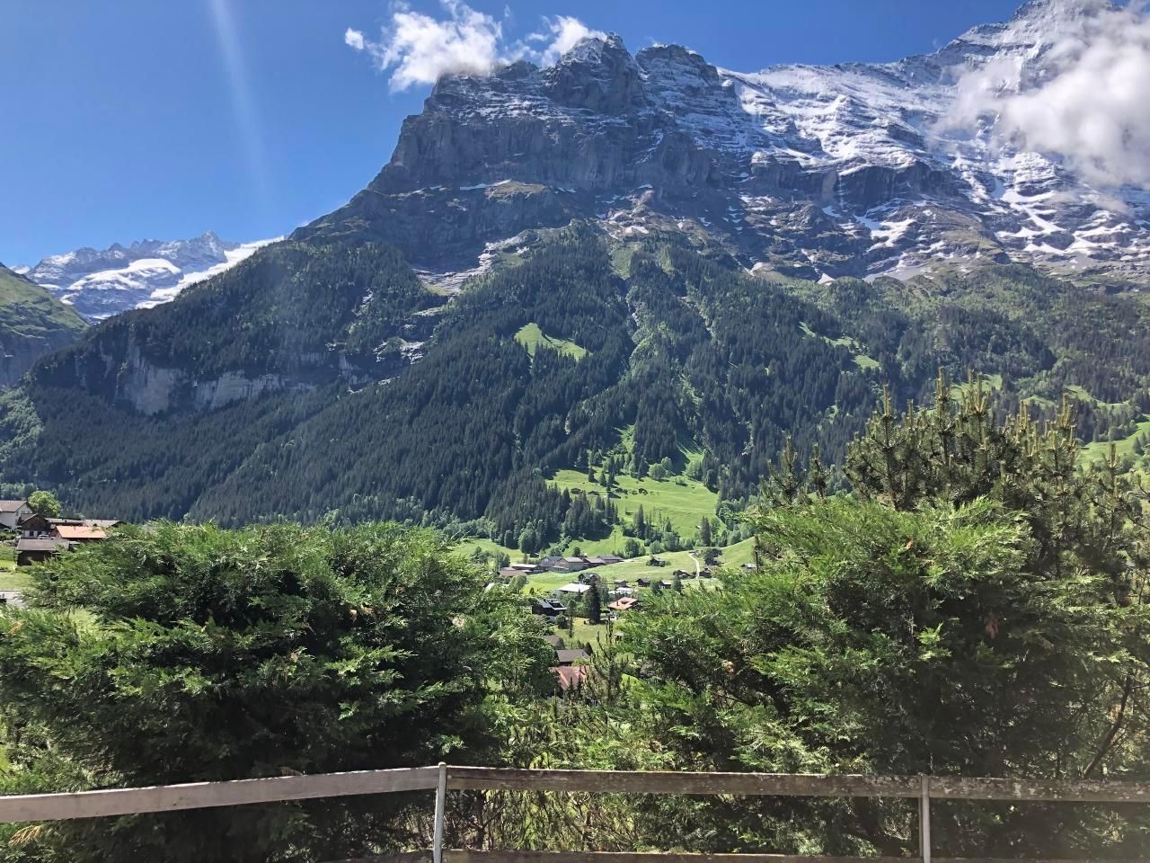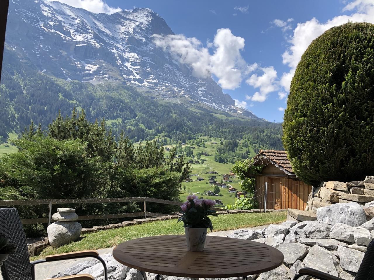 Direkter Zugang zum sonnigen Aussensitzplatz mit freier Sicht auf die Eigernordwand und die umliegenden Berge.