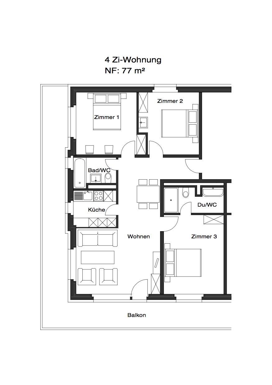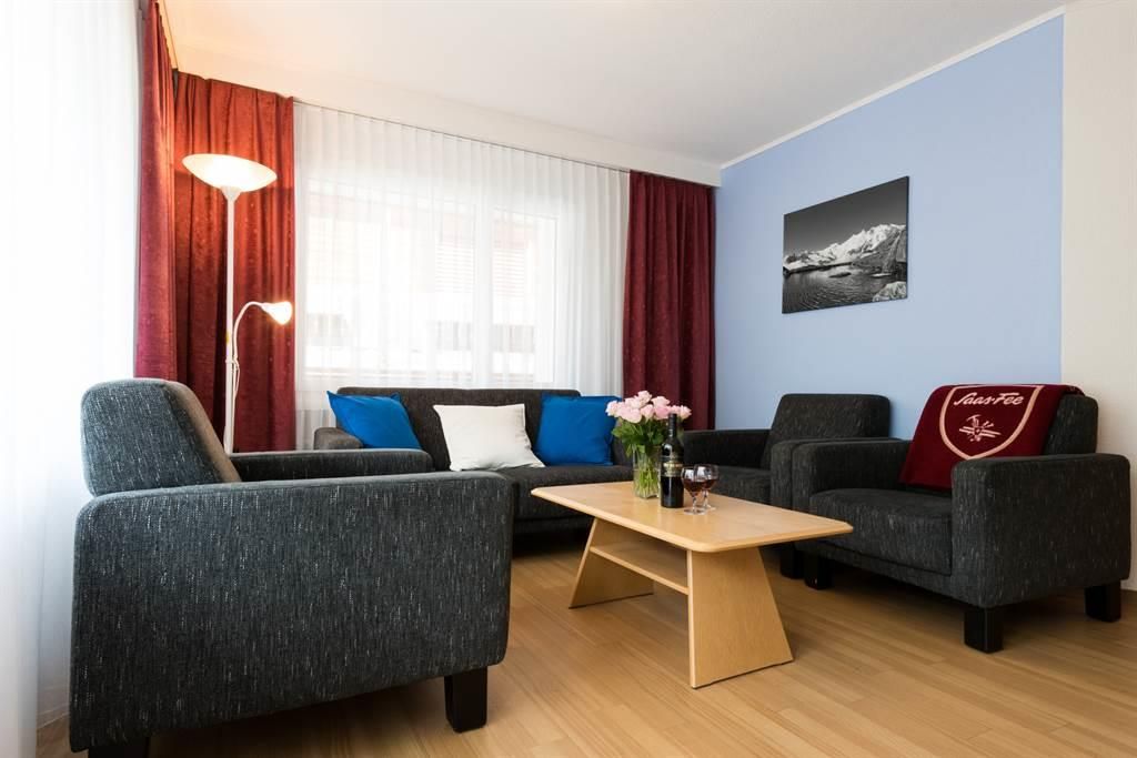 4 Zimmerwohnung (77m2) 1. OG / Nichtraucherwohnung, für Familien und ruhige Personen. Haustiere nicht erlaubt. 3 Schlafzimmer mit 2 Betten, geräumiges Wohnzimmer mit Polstergruppe, separater Küche mit 4 Kochplatten, Backofen, Geschirrspüler, Kühlschrank, Mikrowelle, Kapselkaffeemaschine und Wasserkocher. 1 Bad/WC,