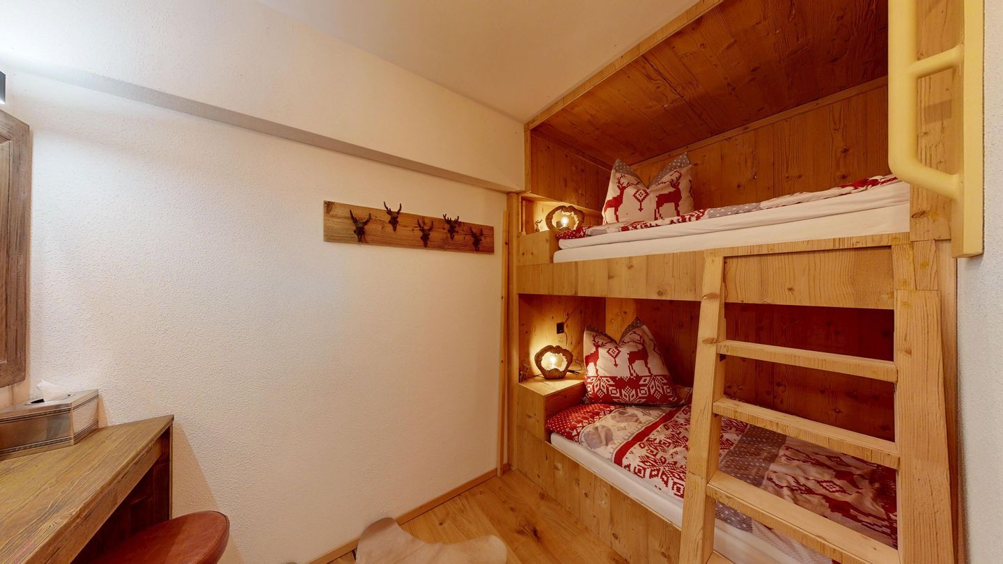 Zwei Schlafzimmer: eins mit grossem Doppelbett (Boxspring), das andere mit grossen Etagenbetten, bieten Platz für vier Personen. Das moderne Badezimmer mit Dusche, Waschtisch und WC ist funktional gestaltet.
