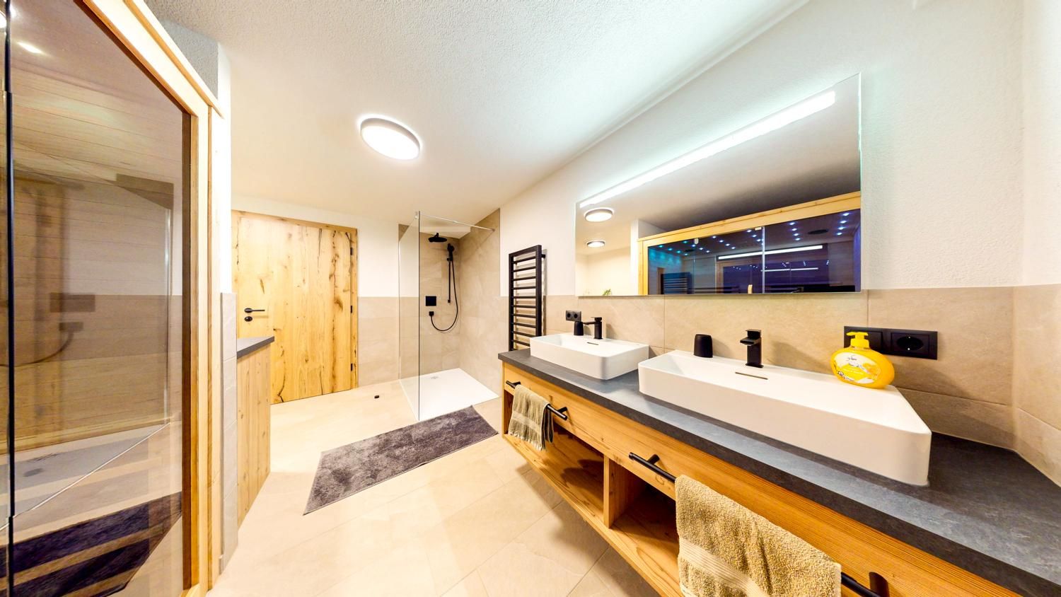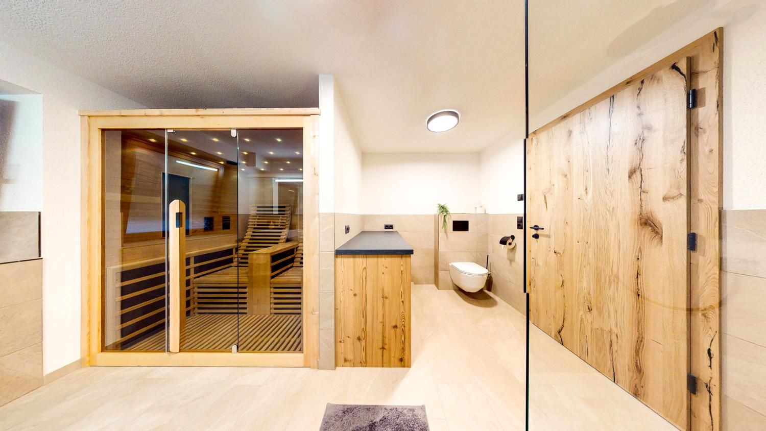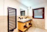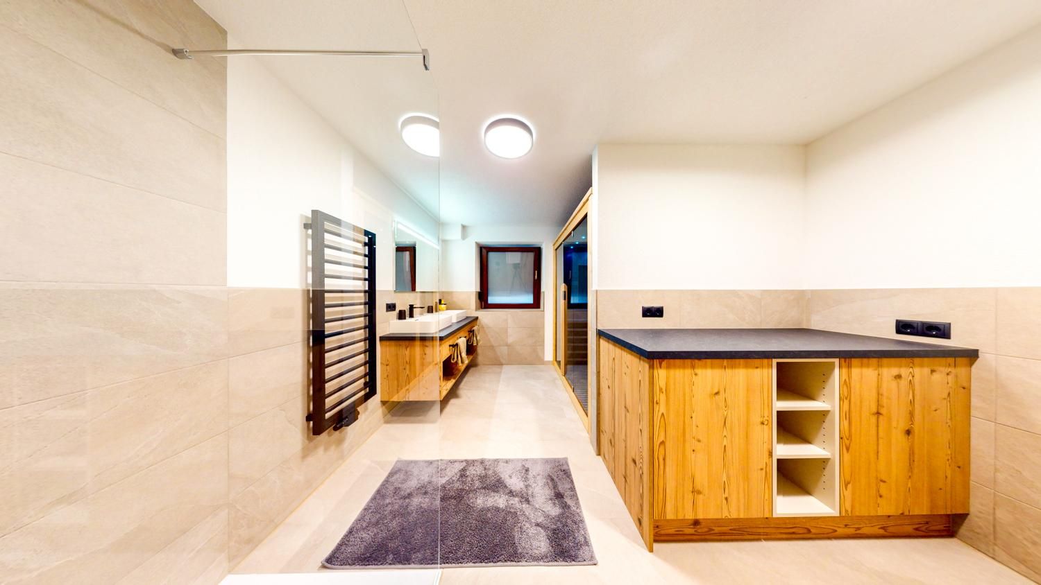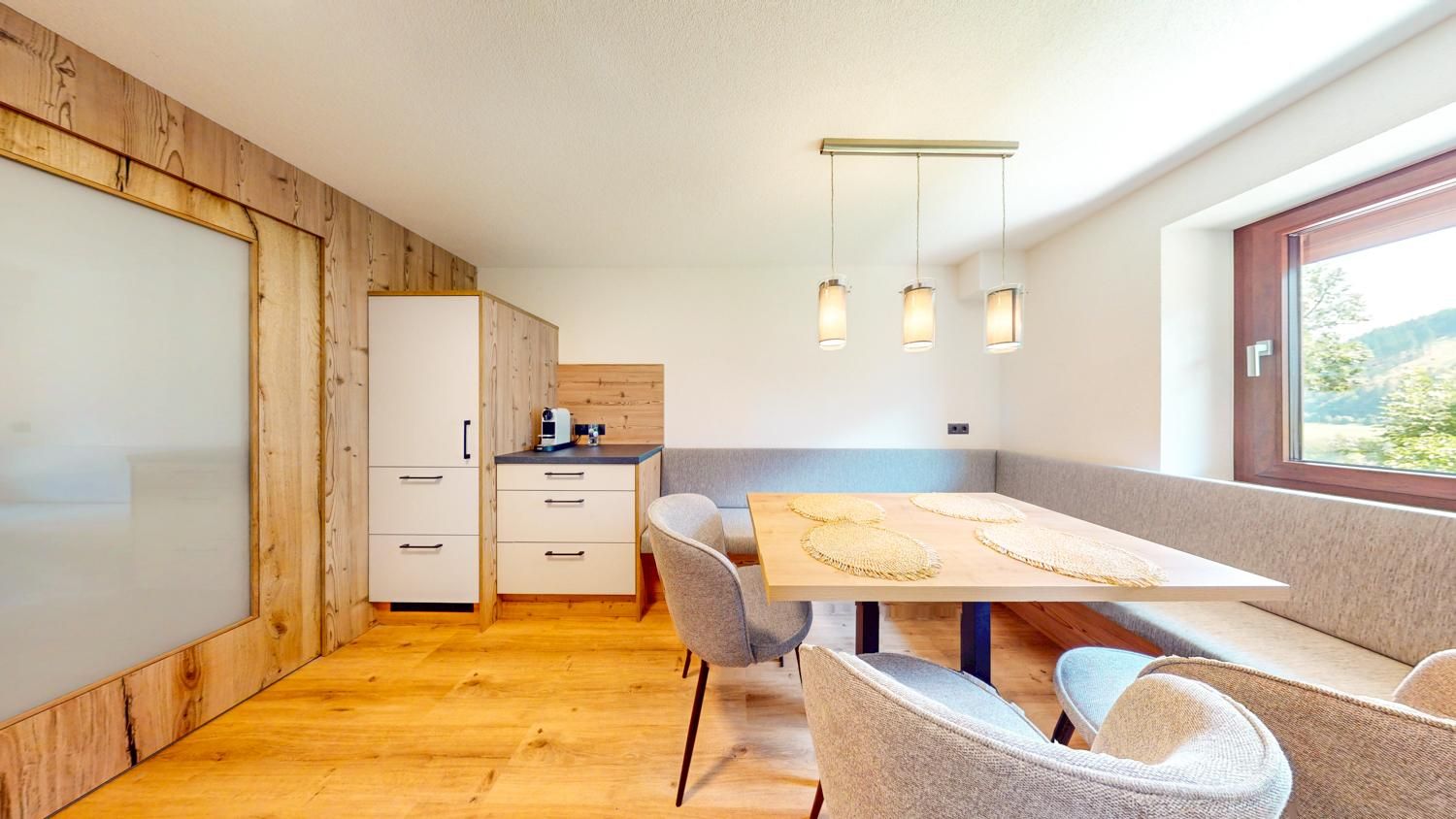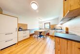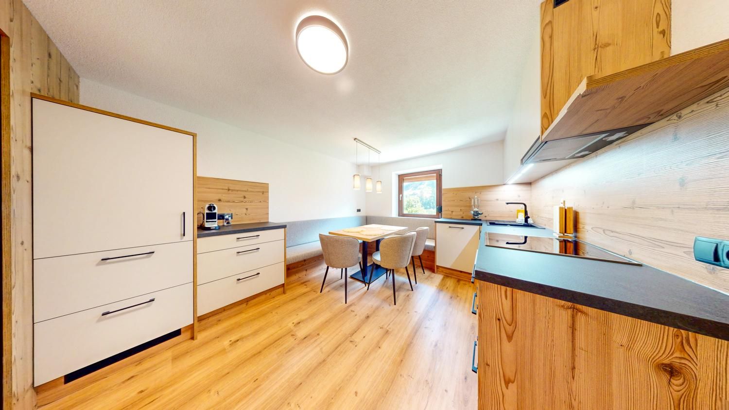 Das Apartment Weitblick (ca. 63 m²) besteht aus einem Doppelzimmer mit TV, einem Badezimmer mit Infrarotkabine sowie Dusche/WC und Haartrockner, einem gemütlichen Wohn-Essbereich mit offener, voll ausgestatteter Küche (4 Cerankochfelder, Backofen, Geschirrspüler, Kühlschrank mit Gefrierfach, Mikrowelle, Nespresso-Kapselmaschine, Wasserkocher, Toaster u. v. m.) sowie einem Wohnzimmer mit Ausziehcouch und TV (Schlafmöglichkeit für die 3. und 4. Person). Gartennutzung ist möglich.