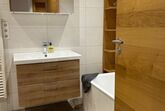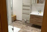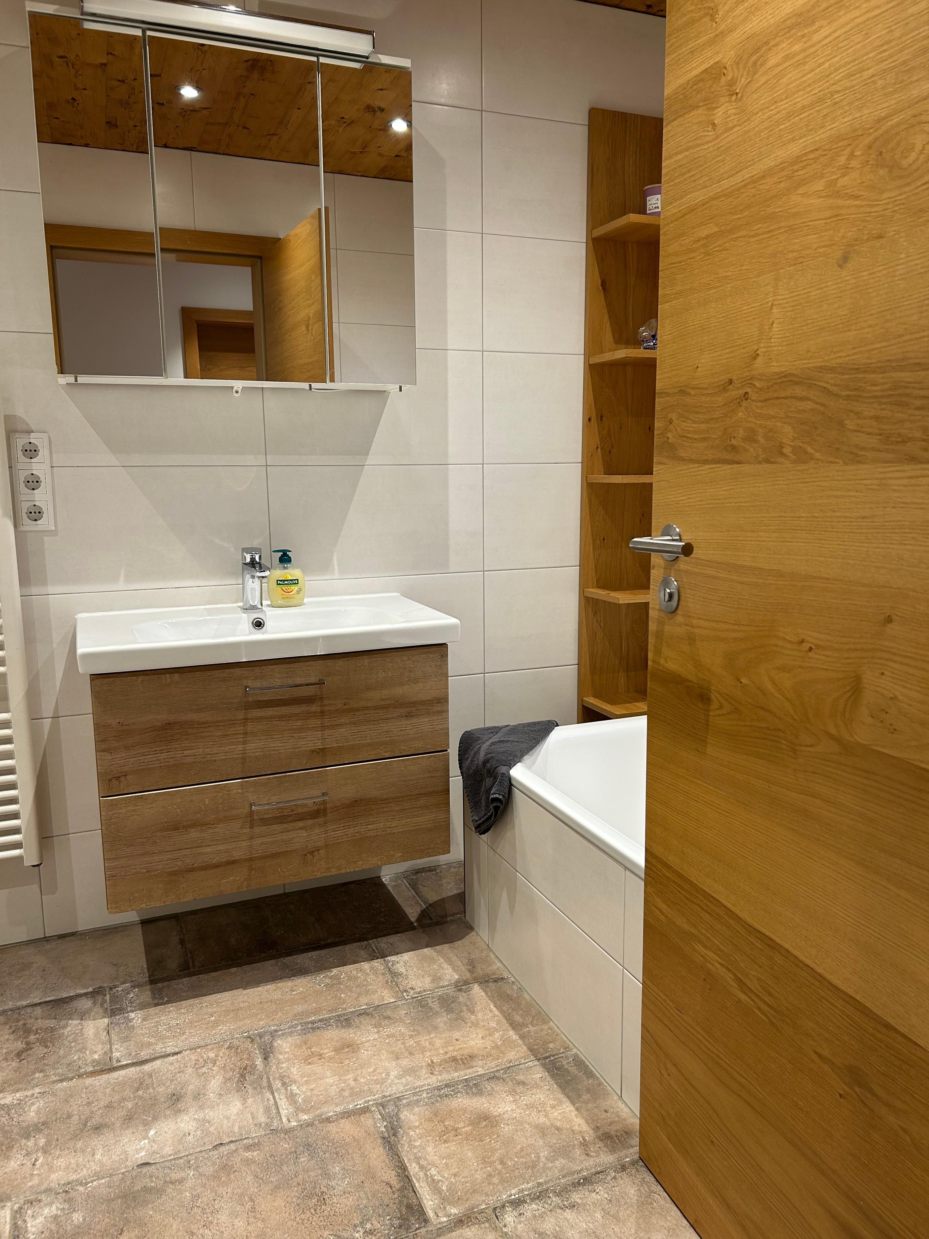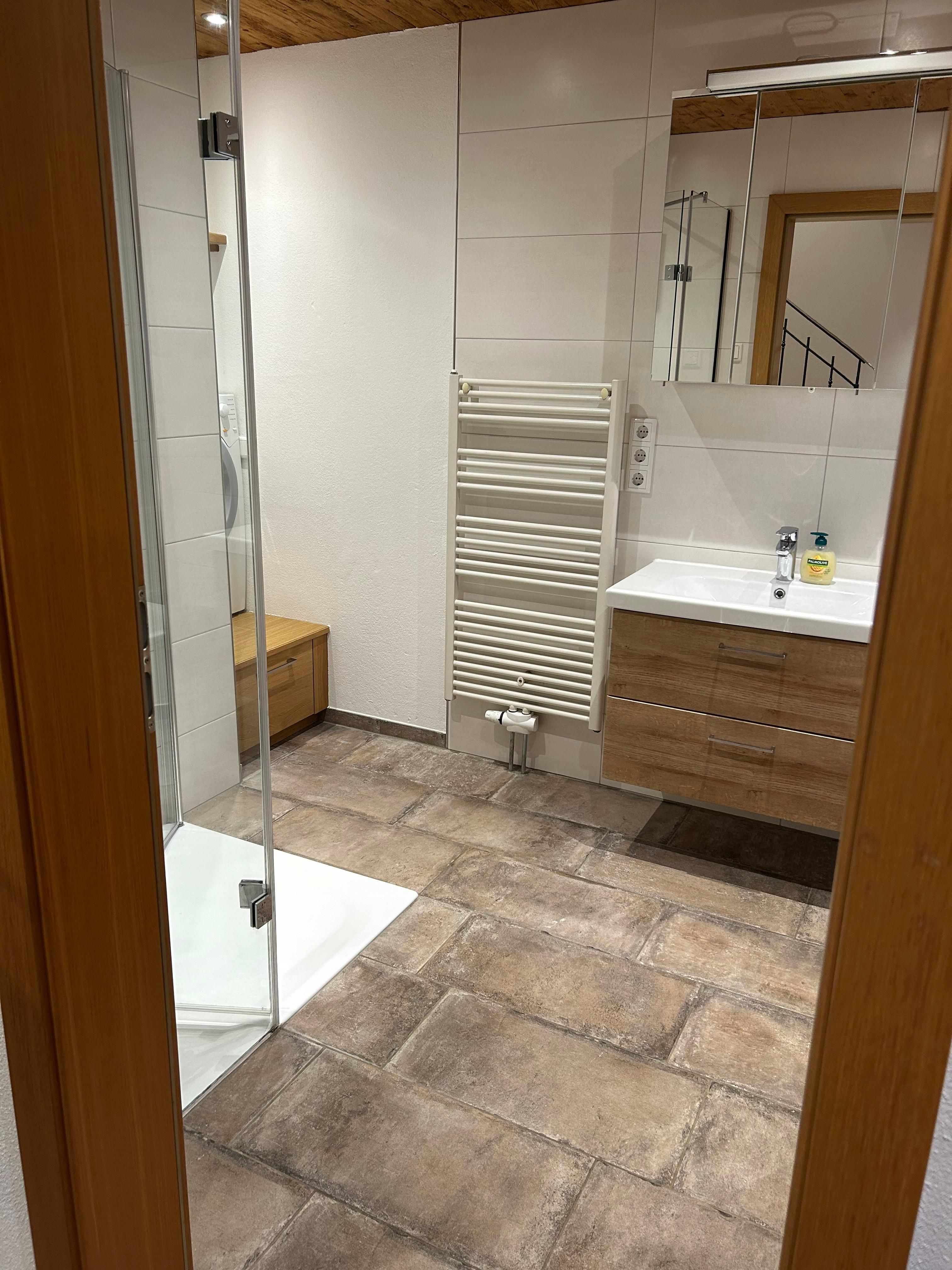 Das Bad ist ausgestattet mit Regendusche, Badewanne und Waschmaschine, dazu gibt es ein separates WC.
