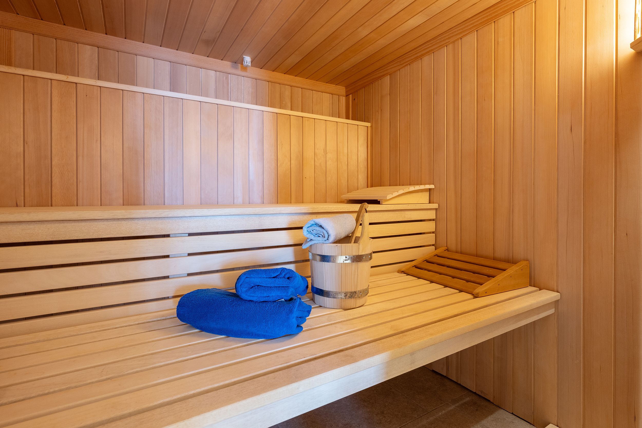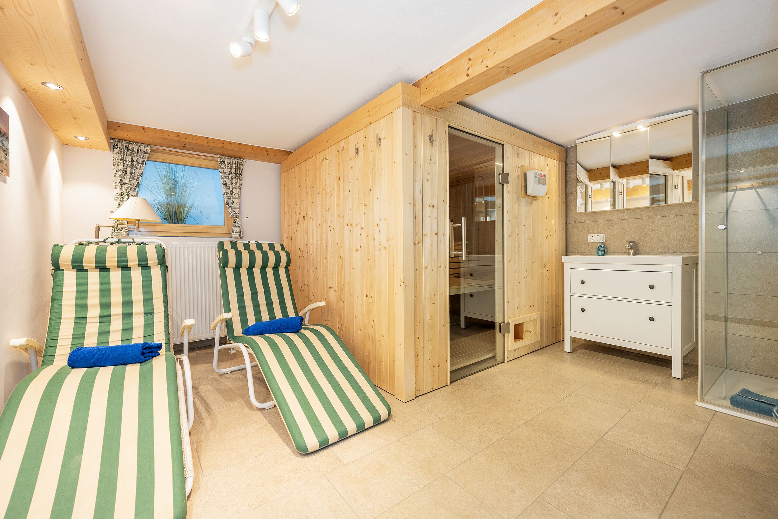 Nach einem aktiven Urlaubstag lädt die moderne Sauna mit eigener Dusche und kleinem Ruheraum zum Wohlfühlen ein.