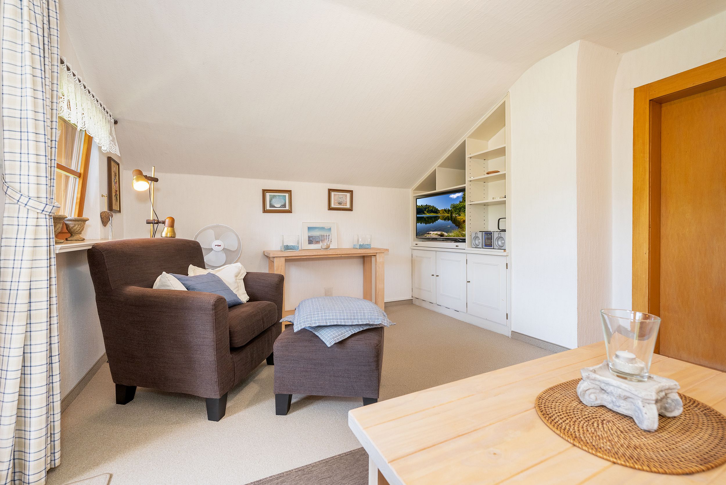 ein helles Wohnzimmer mit Fernseher
