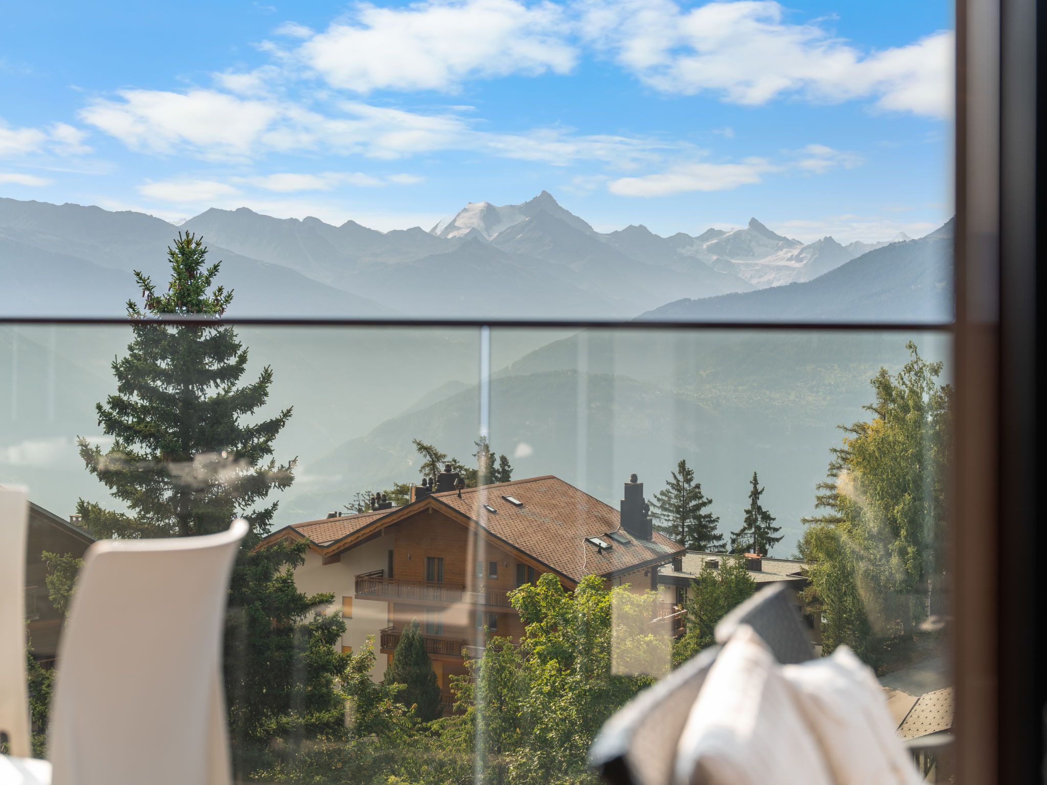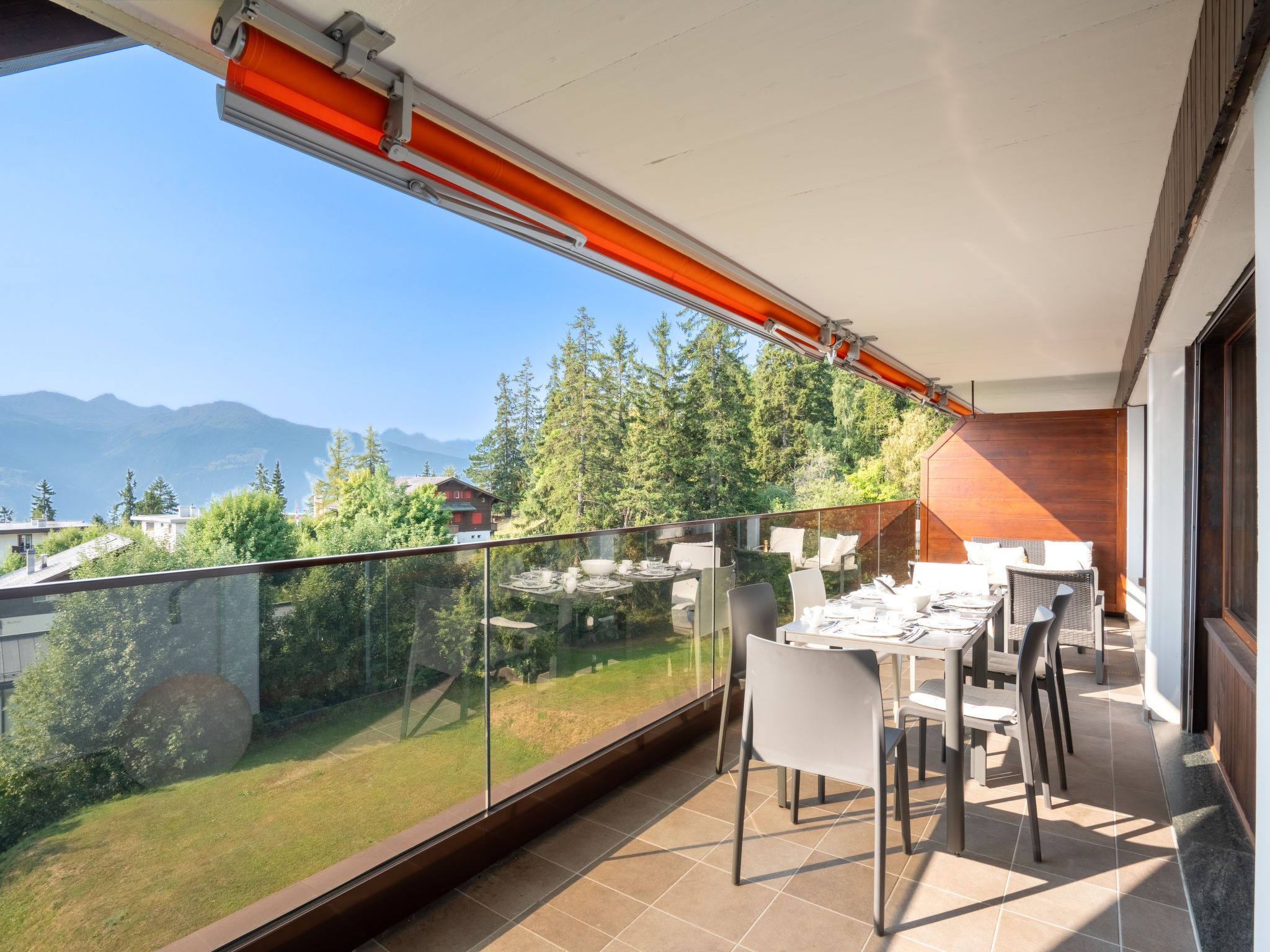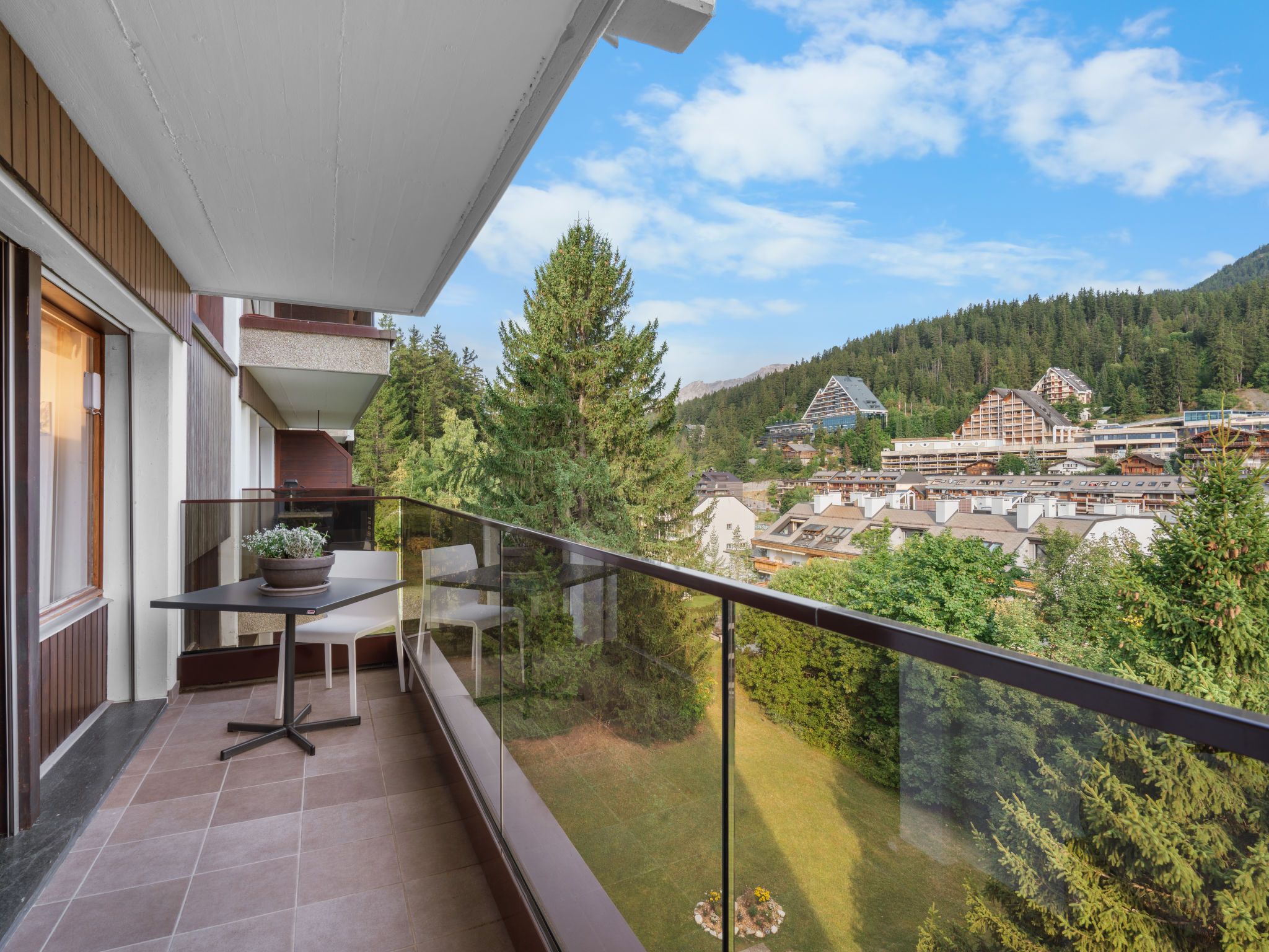 Victoria A 20, 4-Zimmer-Wohnung 100 m2 im 4. Stock. Geräumig, vollständig renoviert im Jahre 2015, sehr modern und luxuriös eingerichtet: Wohn-/Esszimmer mit Schwedenofen, DVD, Heimkino und elektrischem Rollladen. Ausgang zur Terrasse. 1 grosses Zimmer mit 1 franz. Bett (180 cm, Länge 200 cm), Bad/WC, Doppelwaschbecken und Kabel-TV. Ausgang zur Terrasse. 1 Zimmer mit Schiebetür mit 1 franz. Bett (160 cm, Länge 200 cm). 1 Zimmer mit Schiebetür mit 1 franz. Wandklappbett (140 cm, Länge 200 cm). Ausgang zum Balkon. Offene Küche (Backofen, Geschirrspüler, 4 Induktionskochplatten, Toaster, Wasserkocher, elektrische Kaffeemaschine, Kapseln für die Kaffeemaschine (Nespresso) extra, Racletteofen, Kombinationsmikrowelle, Fondue Set (Käse)). Dusche/WC. Balkon, Nordlage Terrasse 18 m2, Südlage. Terrassenmöbel, Balkonmöbel, Gartengrill (mobil), Sitzplatz. Herrliche Panoramasicht auf die Berge, das Tal, die Landschaft und die Ortschaft. Zur Verfügung: Bügeleisen, Babybett bis 2 Jahre, Haartrockner. Internet (WLAN, gratis). Blu-Ray Player. Bitte beachten: geeignet für Familien. Nichtraucher-Unterkunft.