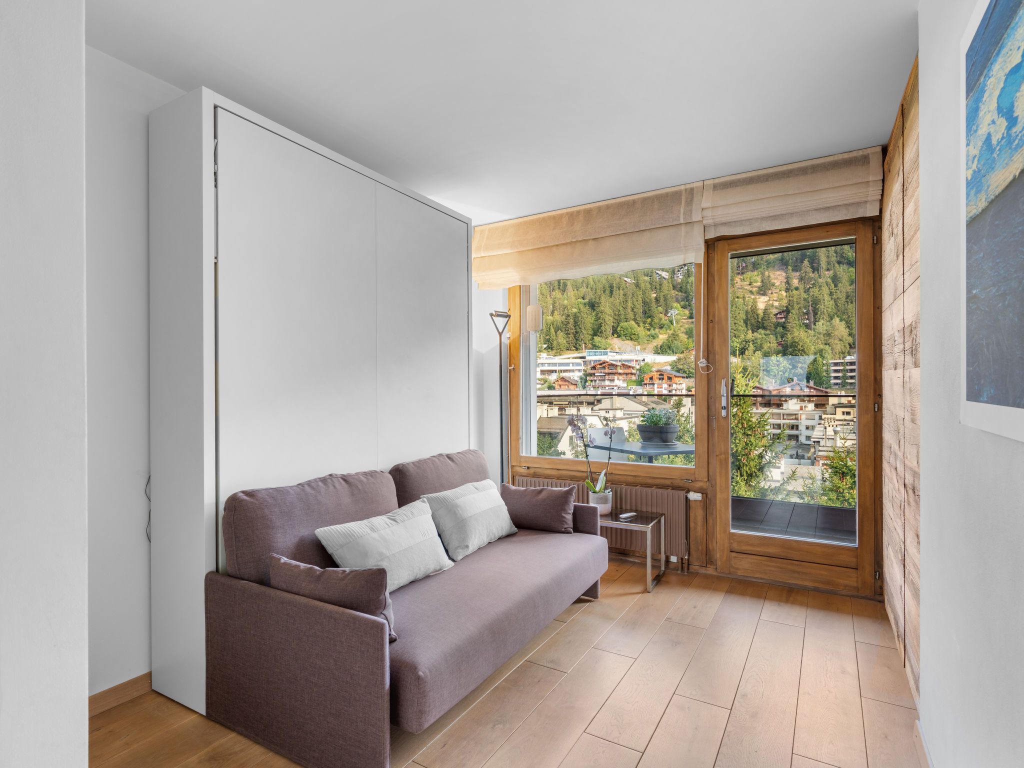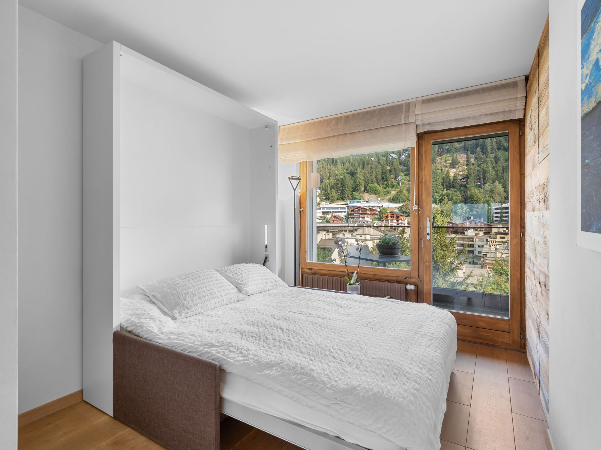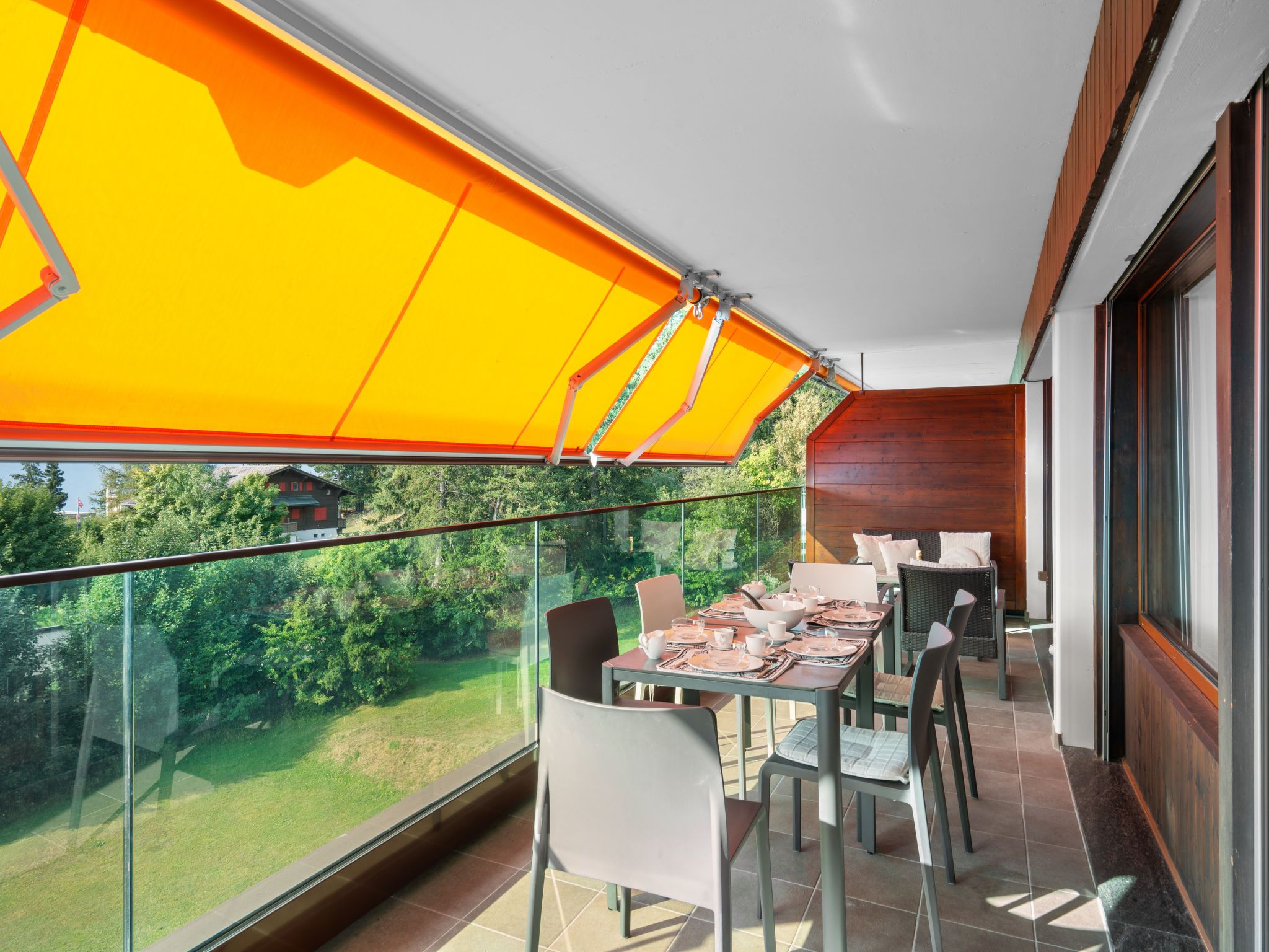 Victoria A 20, 4-Zimmer-Wohnung 100 m2 im 4. Stock. Geräumig, vollständig renoviert im Jahre 2015, sehr modern und luxuriös eingerichtet: Wohn-/Esszimmer mit Schwedenofen, DVD, Heimkino und elektrischem Rollladen. Ausgang zur Terrasse. 1 grosses Zimmer mit 1 franz. Bett (180 cm, Länge 200 cm), Bad/WC, Doppelwaschbecken und Kabel-TV. Ausgang zur Terrasse. 1 Zimmer mit Schiebetür mit 1 franz. Bett (160 cm, Länge 200 cm). 1 Zimmer mit Schiebetür mit 1 franz. Wandklappbett (140 cm, Länge 200 cm). Ausgang zum Balkon. Offene Küche (Backofen, Geschirrspüler, 4 Induktionskochplatten, Toaster, Wasserkocher, elektrische Kaffeemaschine, Kapseln für die Kaffeemaschine (Nespresso) extra, Racletteofen, Kombinationsmikrowelle, Fondue Set (Käse)). Dusche/WC. Balkon, Nordlage Terrasse 18 m2, Südlage. Terrassenmöbel, Balkonmöbel, Gartengrill (mobil), Sitzplatz. Herrliche Panoramasicht auf die Berge, das Tal, die Landschaft und die Ortschaft. Zur Verfügung: Bügeleisen, Babybett bis 2 Jahre, Haartrockner. Internet (WLAN, gratis). Blu-Ray Player. Bitte beachten: geeignet für Familien. Nichtraucher-Unterkunft.