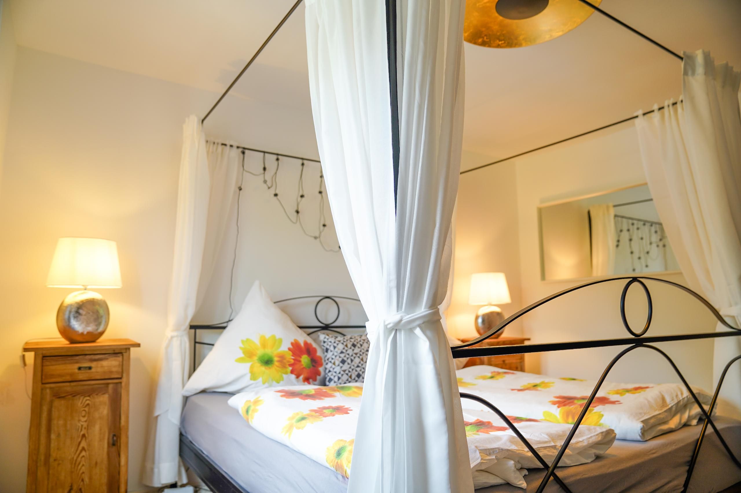 Vom Flur aus haben Sie Zugang zum Bad (Dusche und Badewanne), zur Gästetoilette, Nische im Flur für Waschmaschine und Trockner. Das Schlafzimmer verfügt über ein romantisches Himmelbett (180 cm breit), Schrank und Sitzmöbel. In der Wohnung liegt zentral die Luxusküche: E-Herd mit großem Ceranfeld, Klarstein-Dunstabzugshaube, Kaffee-Vollautomat, Backofen und Dampfgarer. Ein Esstisch bietet Platz für vier Personen. Zugang zum Balkon. In der kälteren Jahreszeit können Sie den Küchenherd einschüren und auf ihm kochen!
