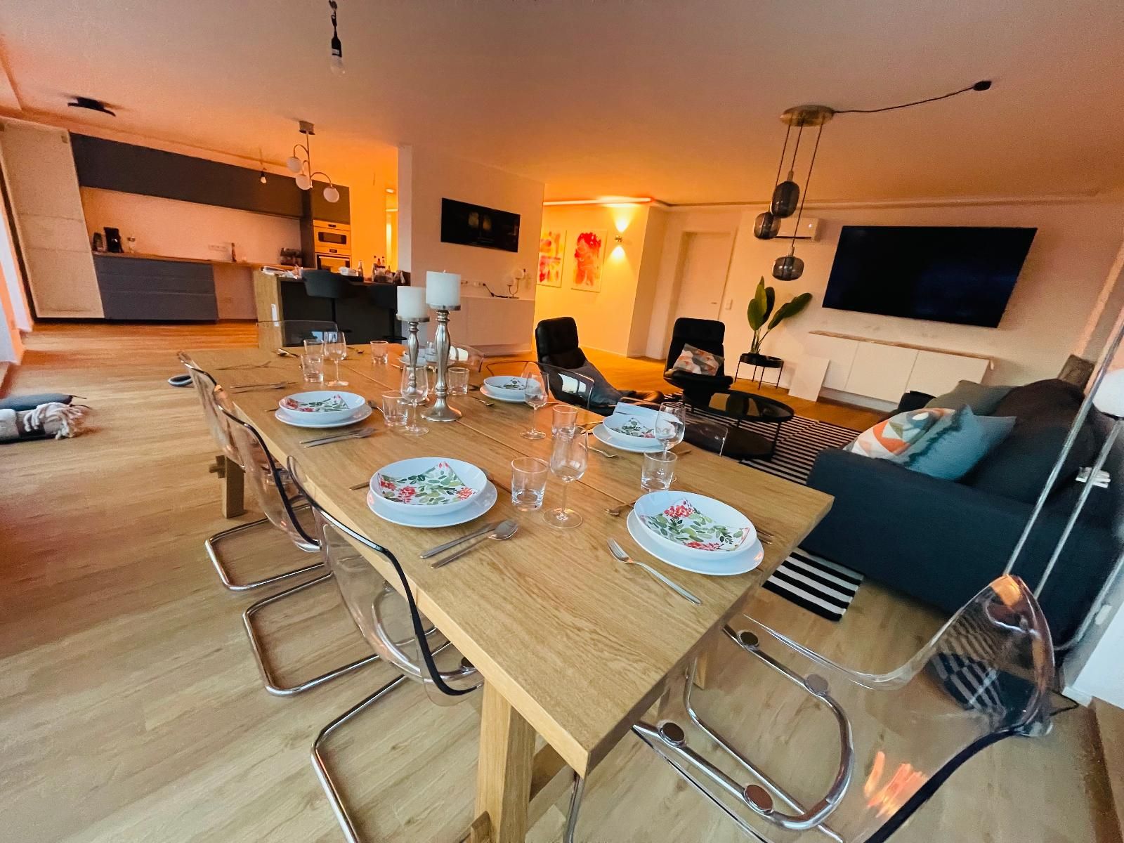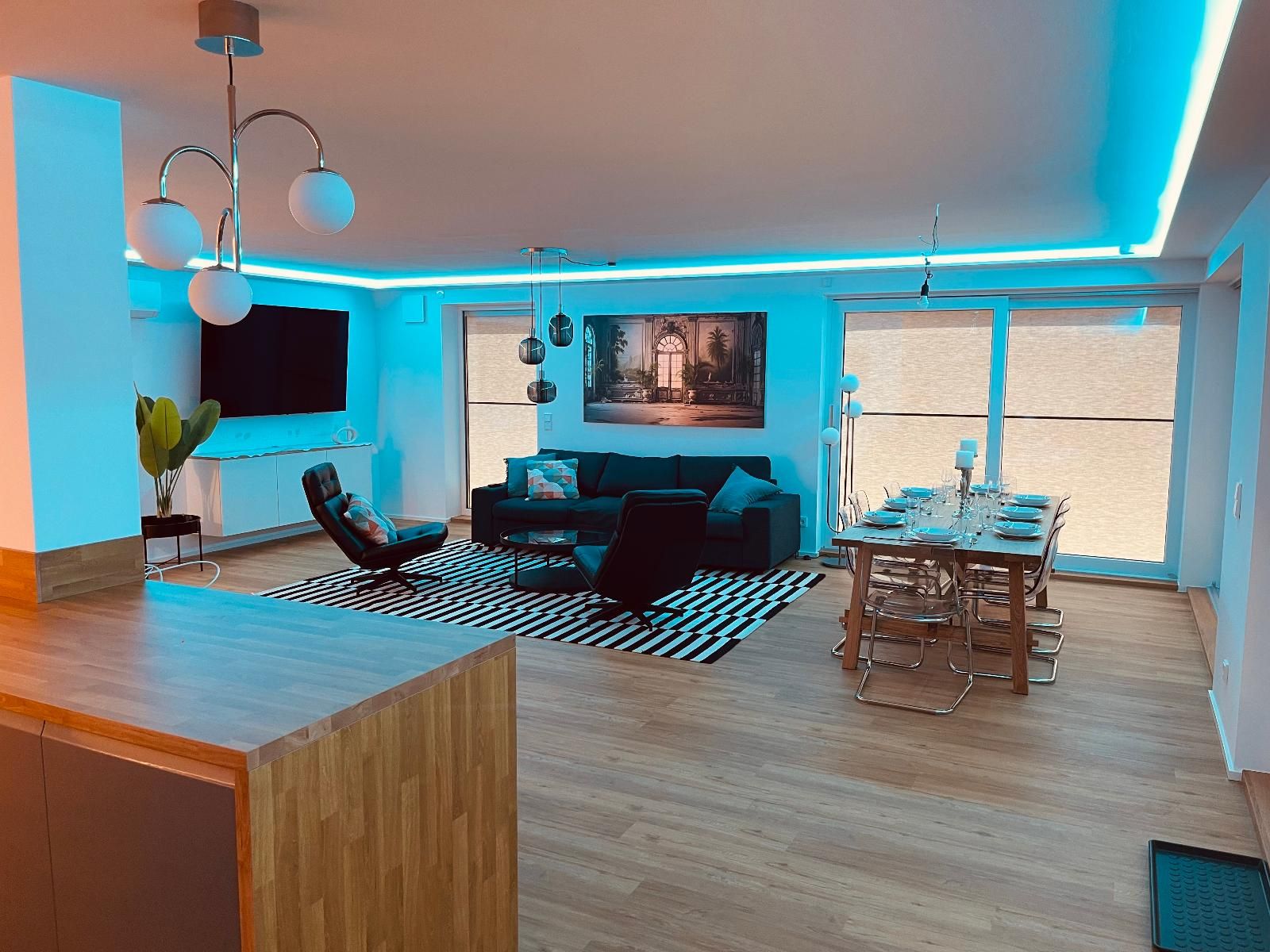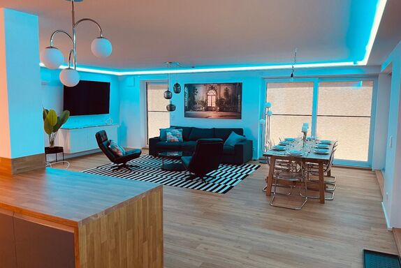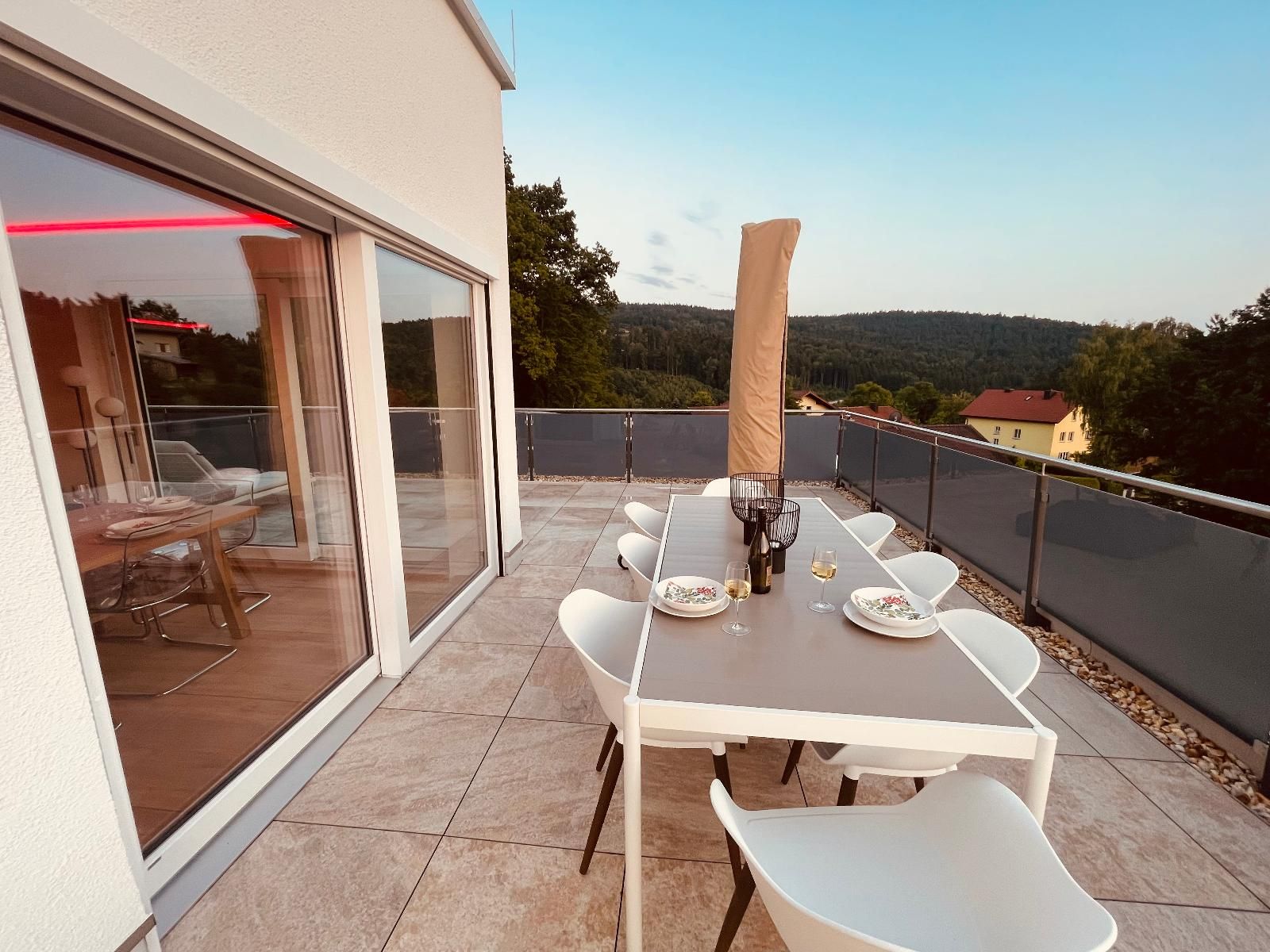 Das exklusive Penthouse in Waldkirchen bietet auf 256 m² modernsten Wohnkomfort für bis zu 8 Gäste – mit drei vollklimatisierten Schlafzimmern (1 Kingsize-, 2 Queensize-Betten), jeweils eigenem 55-Zoll-Smart-TV, Highspeed-LAN-Anschluss (1000 Mbit/s) und großzügigem Stauraum. Der offen gestaltete Wohnbereich begeistert mit einem 77-Zoll-OLED-TV, Soundbar und direktem Zugang zur spektakulären 270°-Panorama-Dachterrasse – dem Highlight der Unterkunft, wo Sie in der Lounge entspannen, am großen Esstisch im Freien speisen oder unvergessliche Sonnenuntergänge über dem Bayerischen Wald genießen können. Ab Januar 2026 erwartet Sie dort zudem ein moderner Whirlpool für bis zu fünf Personen – perfekt für romantische Abende unter dem Sternenhimmel. Die voll ausgestattete Küche mit Bardurchreiche, Weingläsern und hochwertigen Geräten lässt keine Wünsche offen. Jalousien, Beleuchtung und Klimaanlage sind dank Smart-Home-Technologie zentral oder via App steuerbar, klassische Schalter sind ebenfalls vorhanden. Das Masterbad ist offen ins Schlafzimmer integriert – bitte berücksichtigen Sie dies bei Ihrer Buchung. Weitere Highlights: Badewanne, Waschmaschine, Trockner, Haartrockner, WLAN, kostenlose Parkplätze direkt vor Ort (3 Stellplätze), gemeinsamer Fitnessraum im Gebäude, Selbst-Check-in und Langzeitaufenthalte möglich. Die Lage ist ideal – direkt neben der bekannten Penninger Destillerie mit spannenden Führungen, bayerischer Spezialitätenverkostung und gemütlichem Restaurant. Der kostenlose Citybus hält direkt vor der Tür („Erlenhain“) und bringt Sie bequem in die Innenstadt. Naturfreunde starten ihre Wanderung auf dem beliebten Saußbachklamm-Rundweg direkt am Haus – ein echtes Paradies für Genießer, Entdecker und Ruhesuchende gleichermaßen.