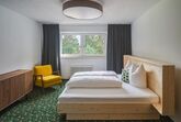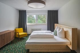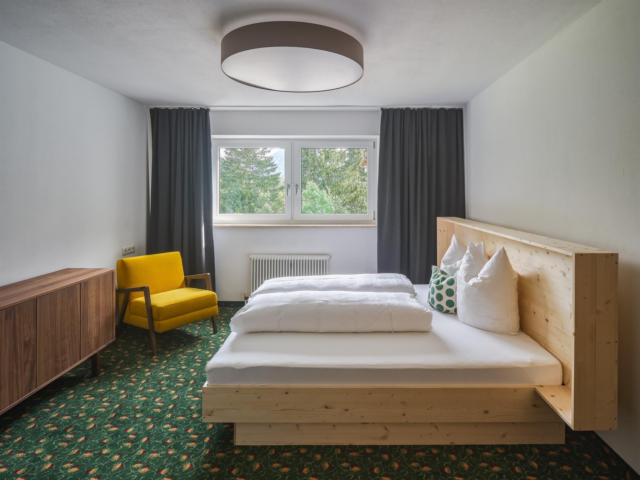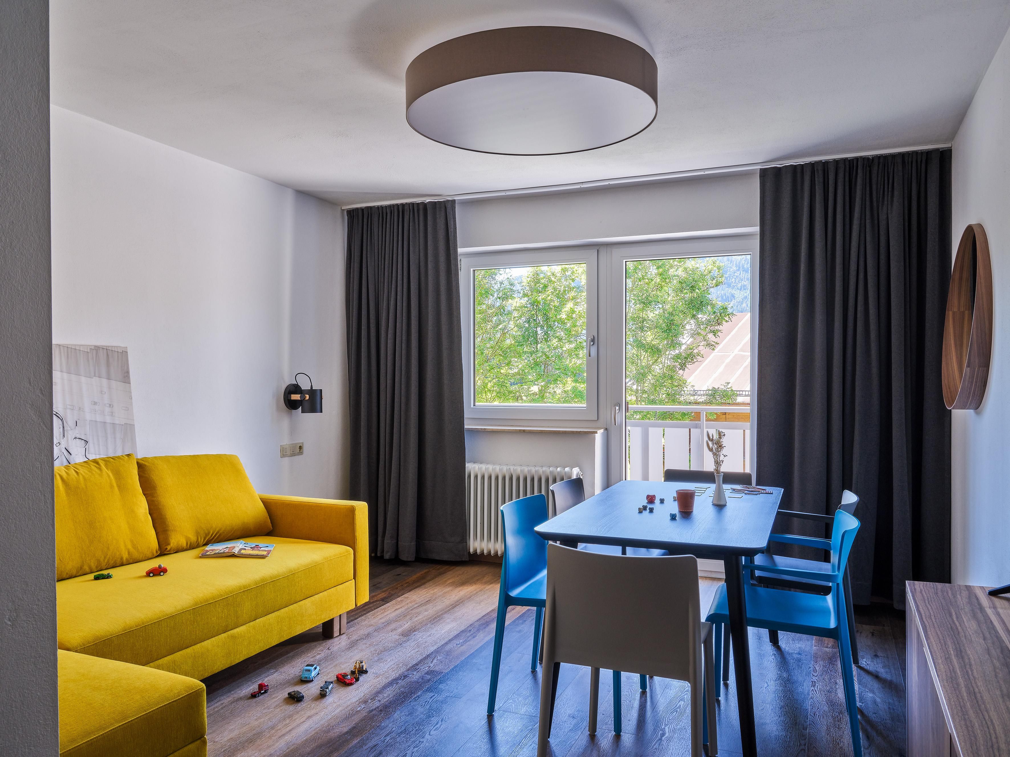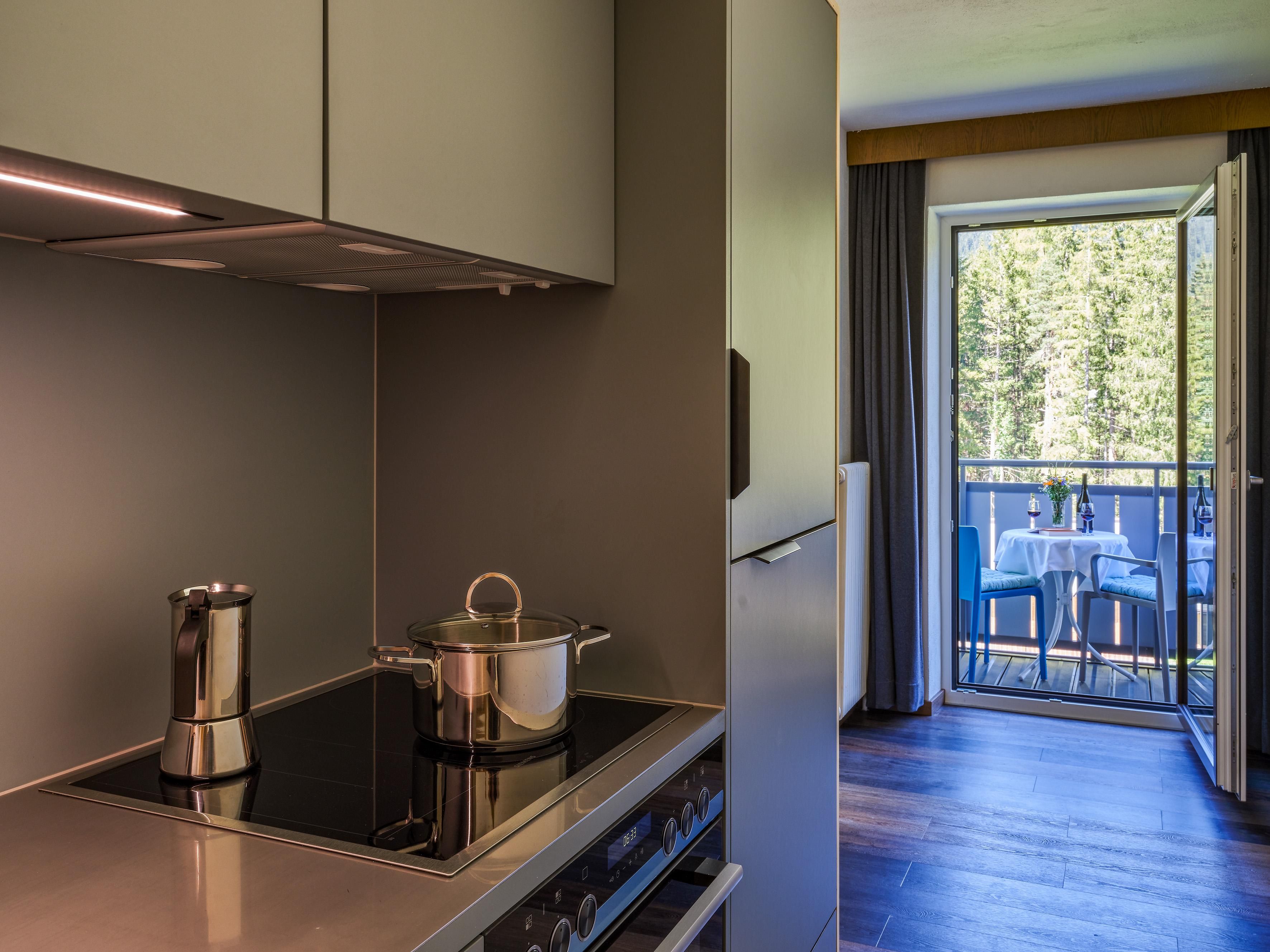70 m2 große Apartments, verfügen jeweils über 2 abgetrennte Schlafzimmer, 1 Wohnraum mit Ausziehcouch und 3 Bäder. Diese Apartments bieten viel Platz und Privatsphäre für jeden, sowie einen großzügigen Balkon mit Wald- und Wiesenaussicht, sowie Blick auf die Berge.