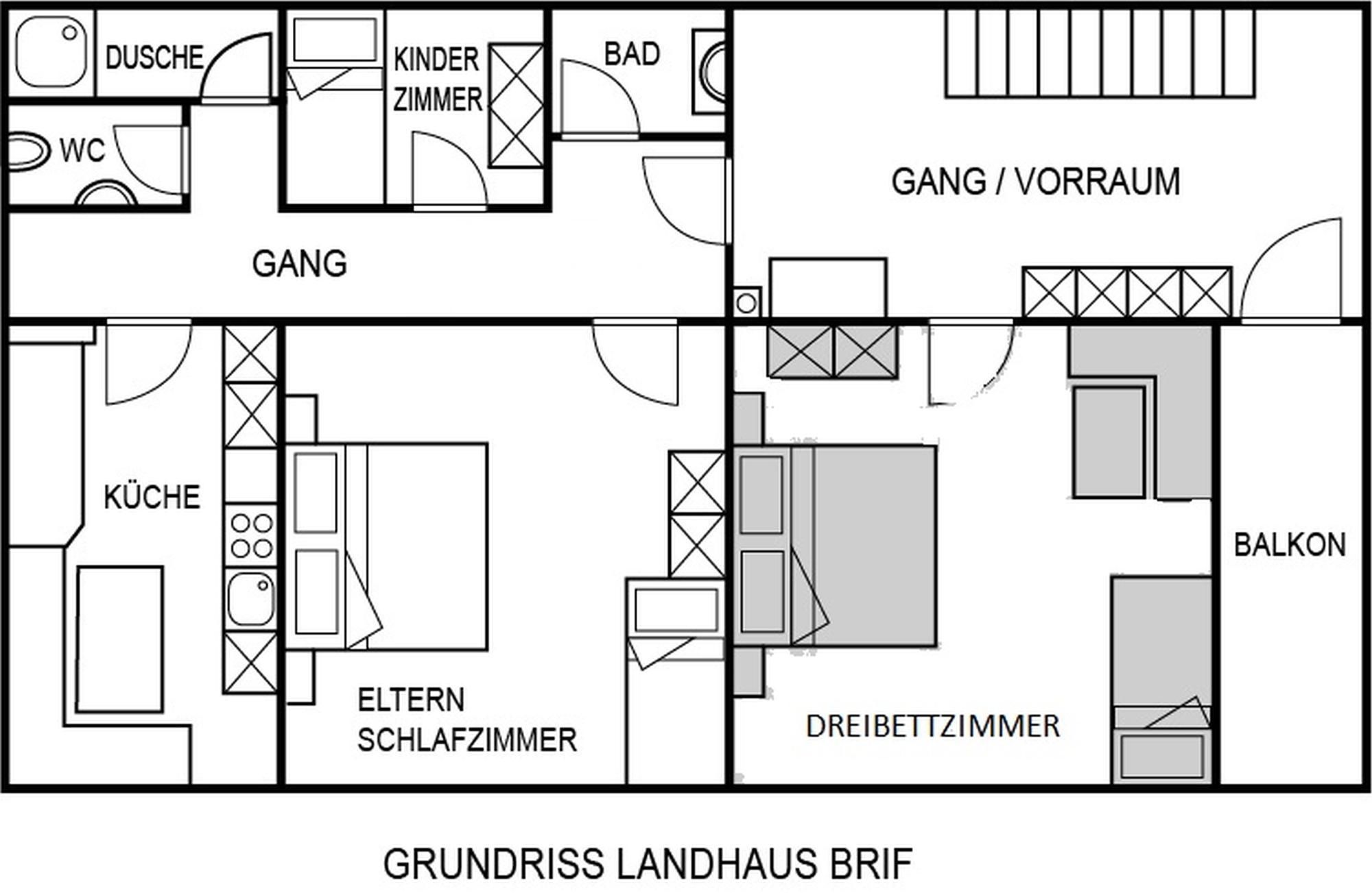 • 1 Dreibettzimmer, 1 Doppelzimmer, 1 Einzelzimmer, Wohnküche, Badezimmer, Dusche, WC