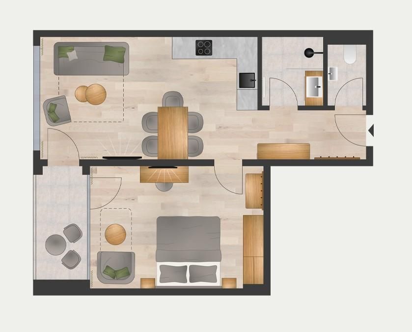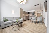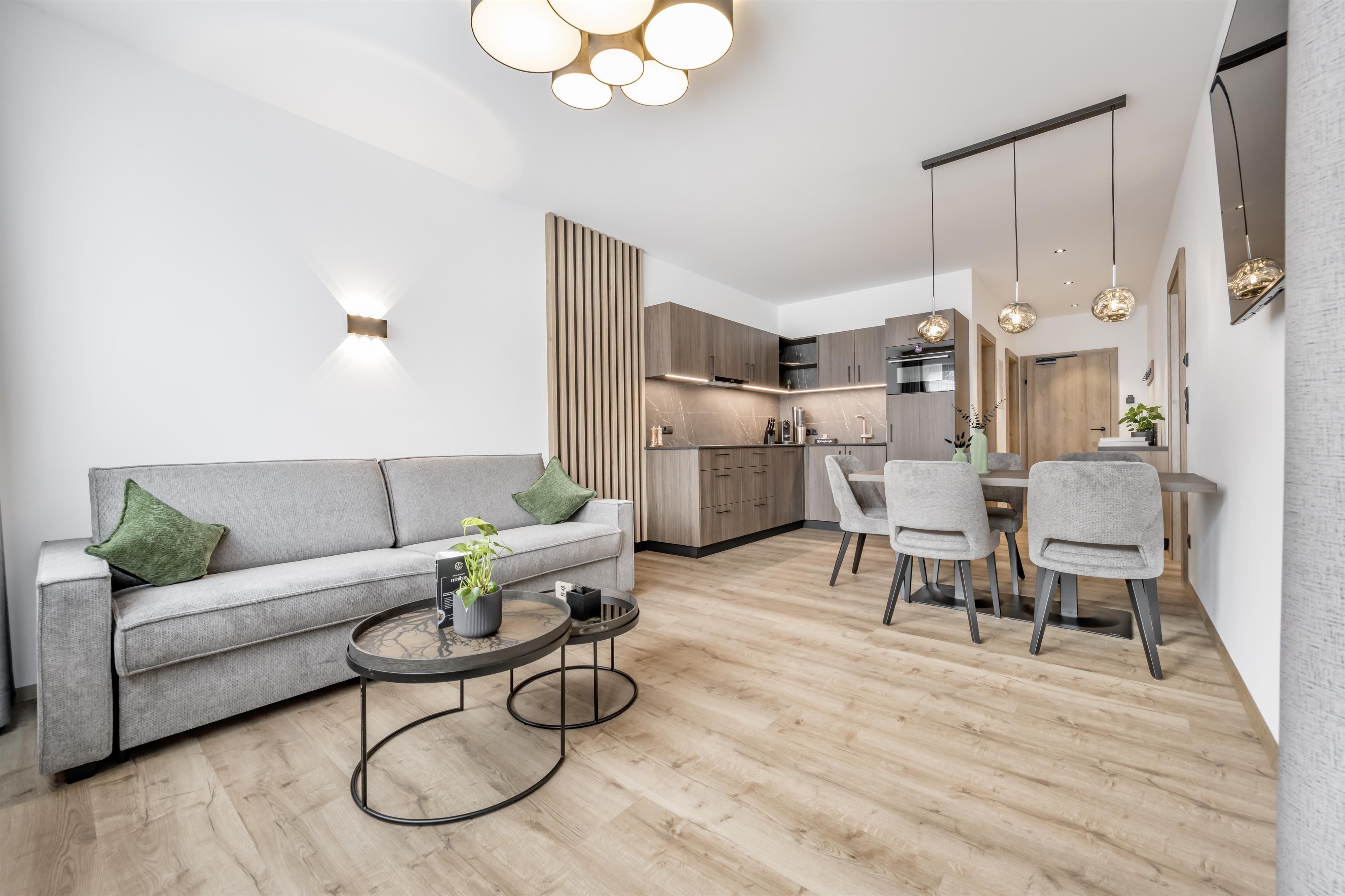 Apartment mit ca. 49 m² - perfekt für Paare oder Family-Time mit Kids: 1 Doppelzimmer mit Premium-Boxspringbett, TV in allen Räumen, komplett ausgestattete High-End-Designer-Wohnküche mit Panoramafenster & Loggia, ausziehbarer Komfort-Couch (Schlafmöglichkeit für 2 weitere Personen), Mikrogrill, Kühlschrank/Gefrierfach, Wasserkocher mit Teeauswahl, Toaster, Soda-Stream, Nespresso-Kaffeemaschine mit Starterpaket, Spülmaschine mit Geschirrtabs, Cerankochfeld uvm. Hochwertiges Badezimmer mit Dusche, Haarföhn und separatem WC.