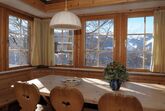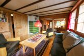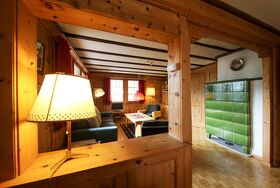 Das grosse, arvenholzgetäfelte Wohn-Esszimmer bietet einen herrlichen Blick auf Parsenn. Der Bereich ist ausgestattet mit Satelliten-TV, einer gemütlichen Eckbank sowie einer Polstergarnitur. Der wunderschöne Kachelofen vermittelt eine heimelige Atmosphäre. Die moderne Küche ist vollständig ausgestattet und verfügt auch über eine Mikrowelle, einen Toaster, Fondue-Geschirr, einen Mixer sowie für die Kaffeezubereitung einen Wasserkocher, Cafétiere und Kaffeefilter.