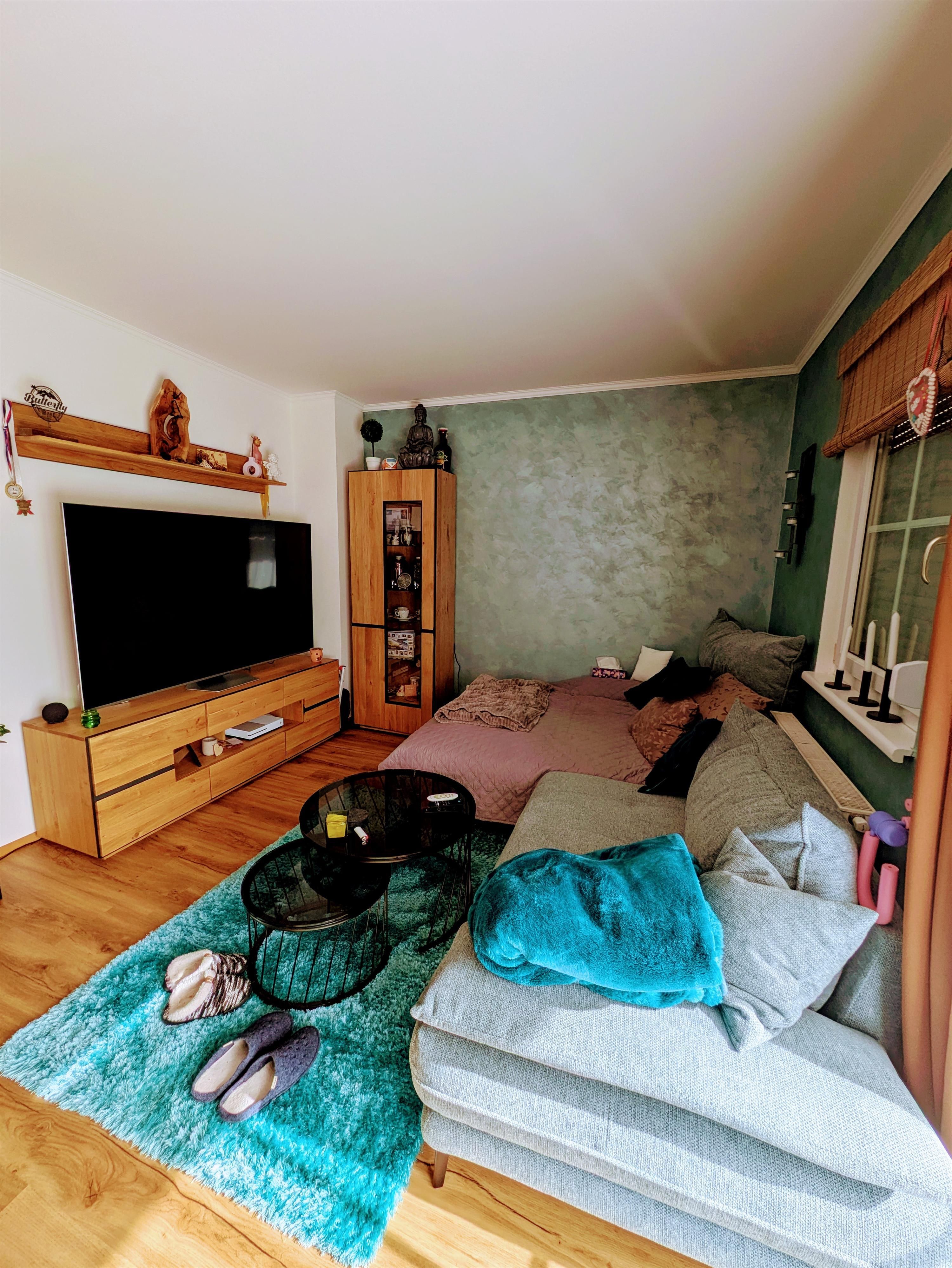 Im Wohnzimmer befindet sich ein großes Sofa (nicht ausziehbar aber mit Liegefläche)
