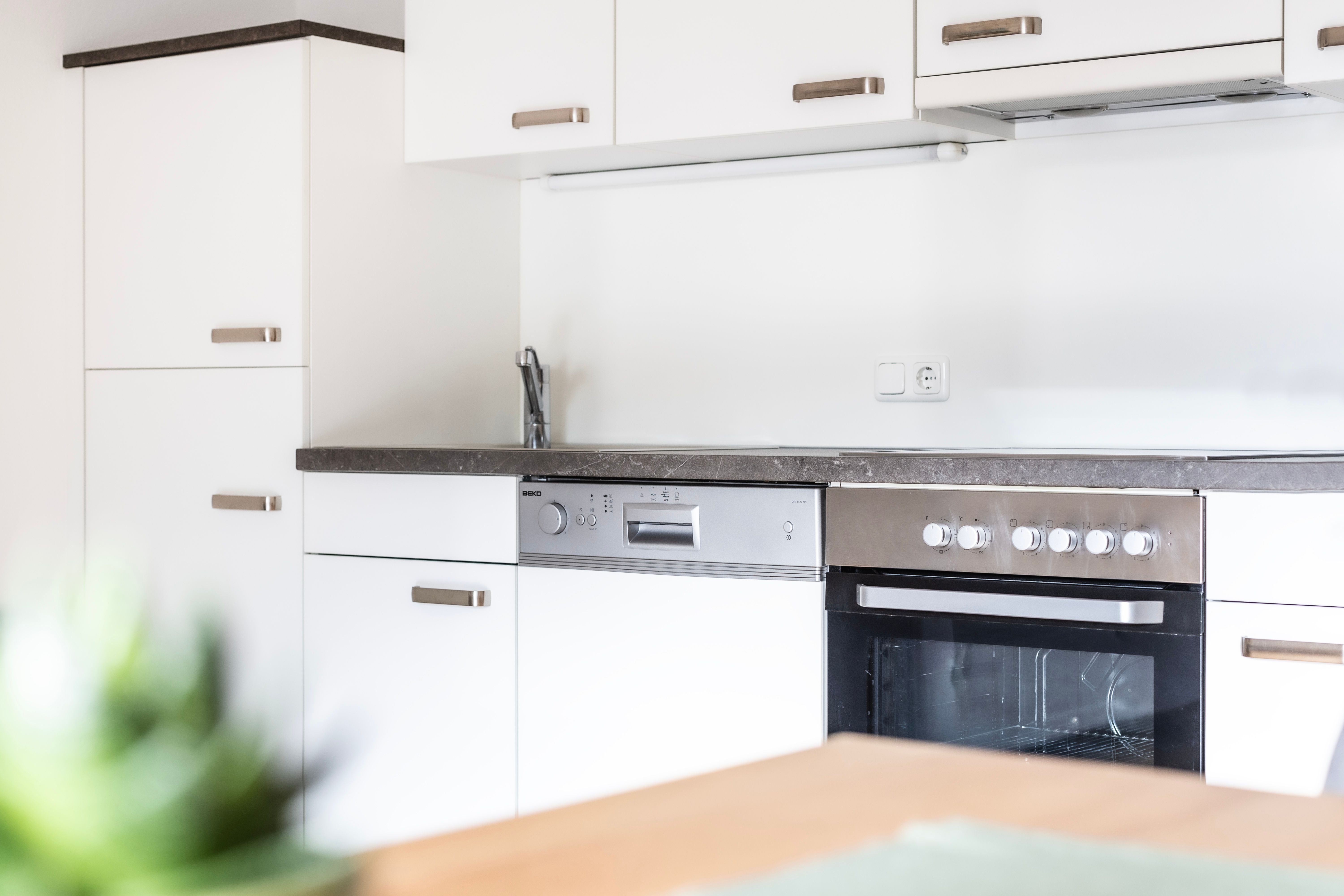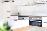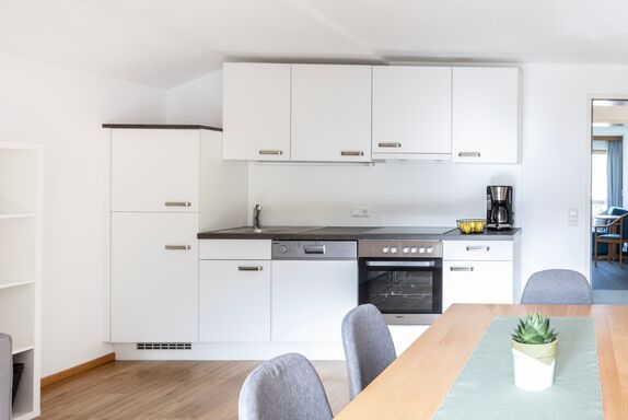 Die modernen Küchen sind voll ausgestattet und verfügen über einen großen Esstisch, Cerankochfeld, Backofen, Mikrowellenherd, Spülmaschine, Flatscreen TV, Couch und Balkon.