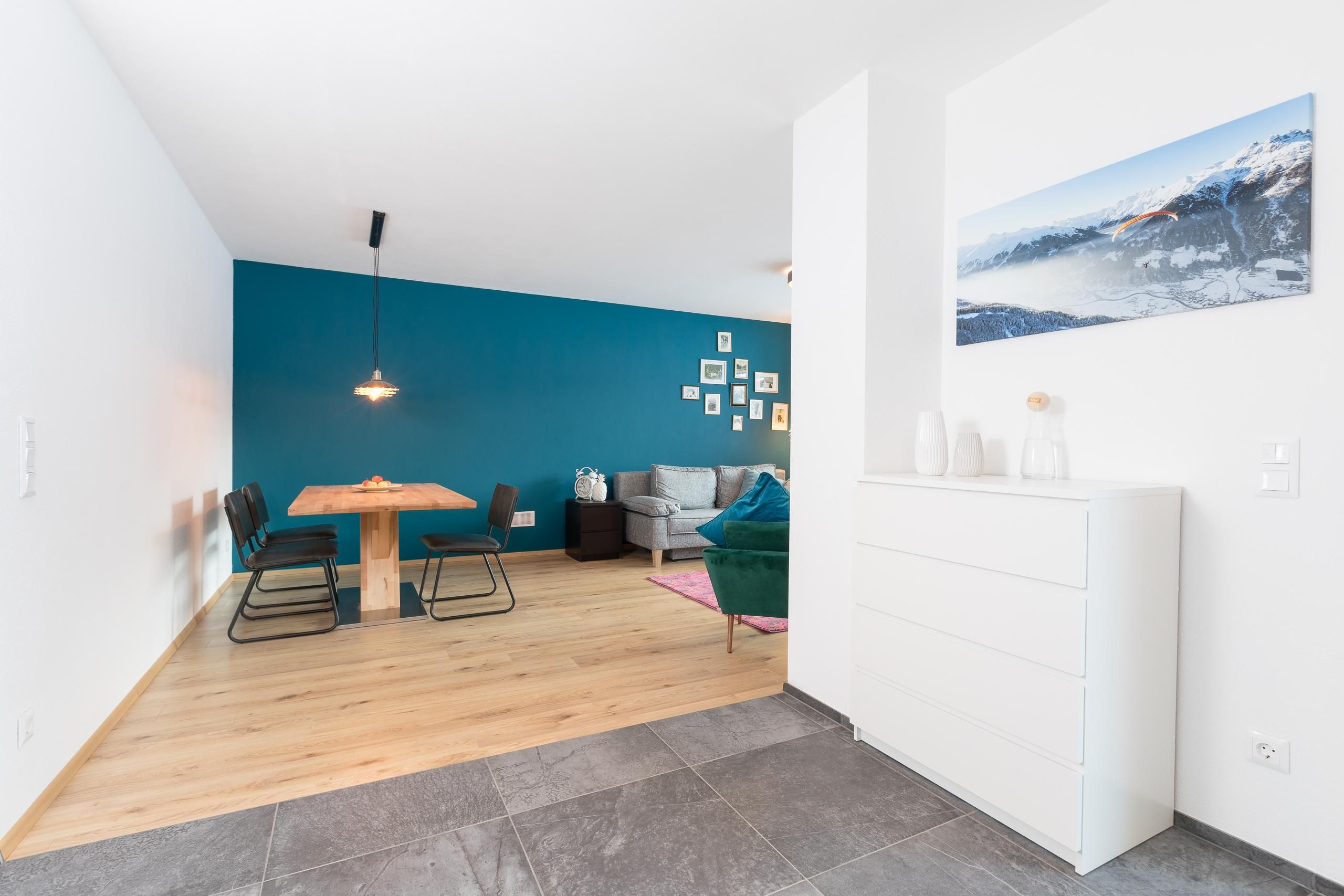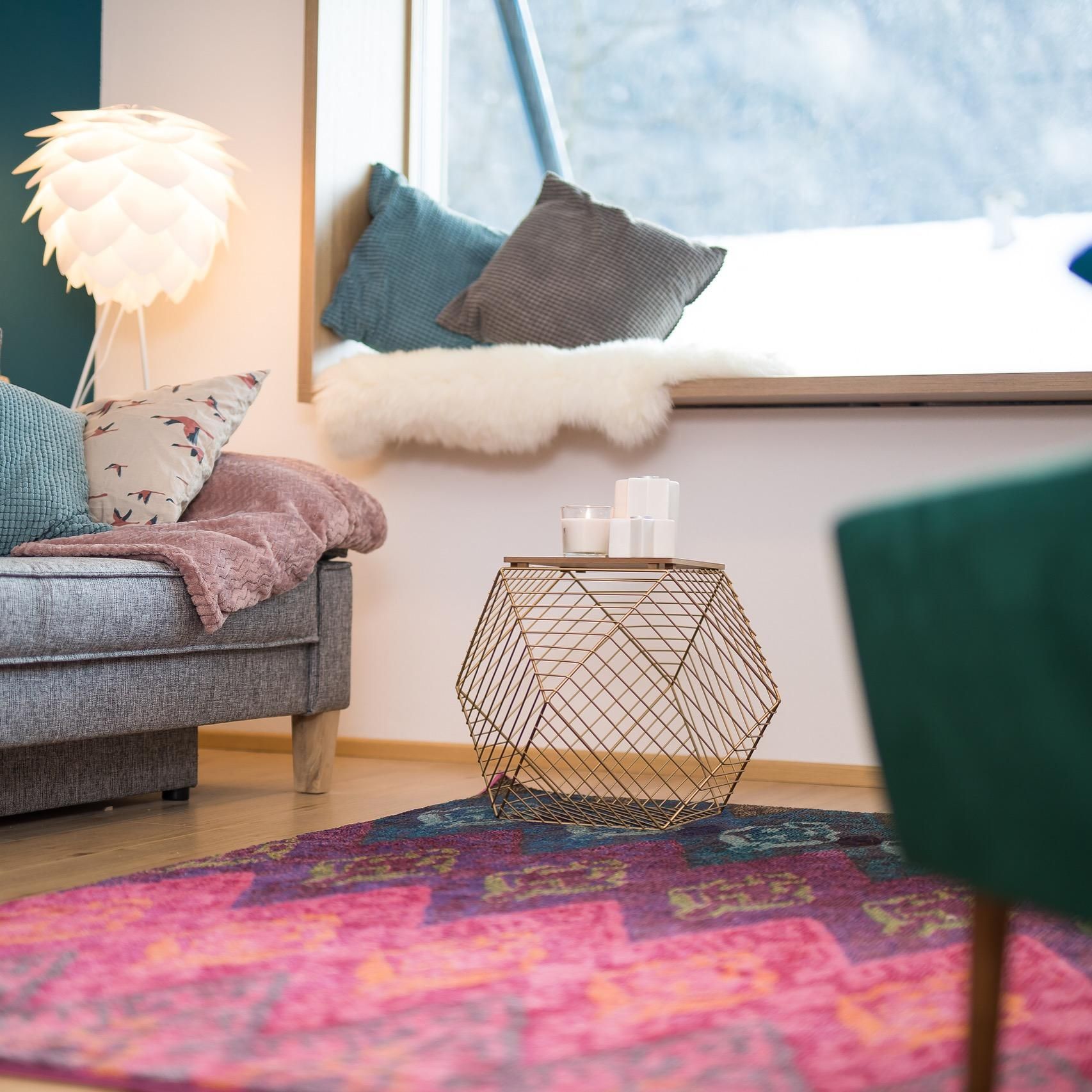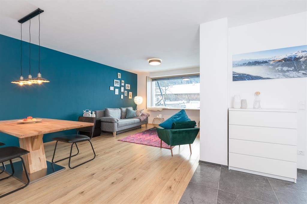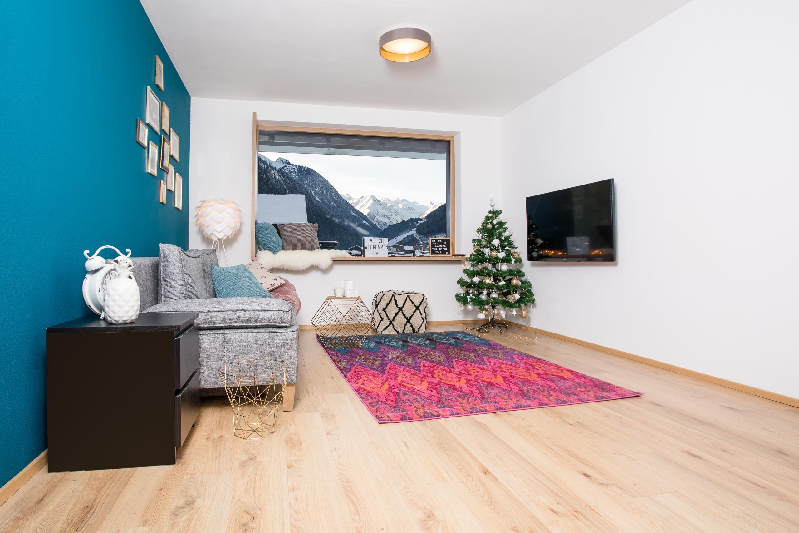Im großen Wohnbereich findet sich der Esstisch, und das Herz der Wohnung das Lümmelfenster mit Panoramablick zum Stubaier Gletscher sowie die ausziehbare Couch.
