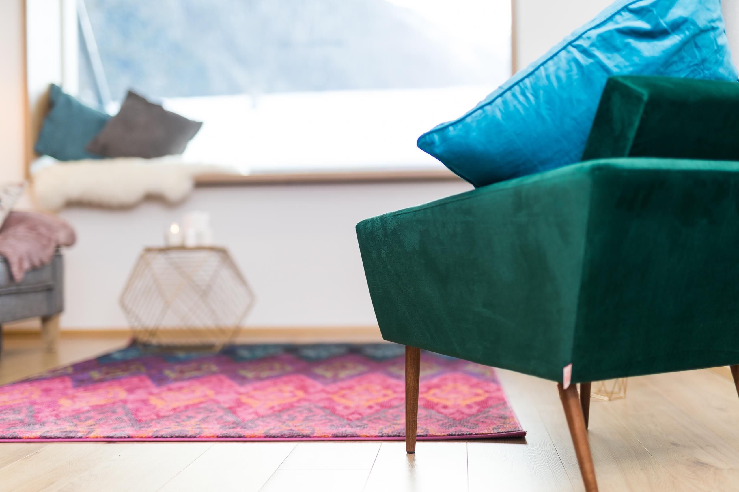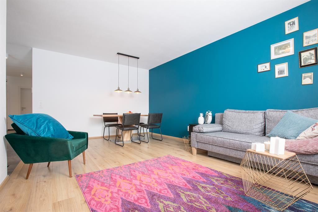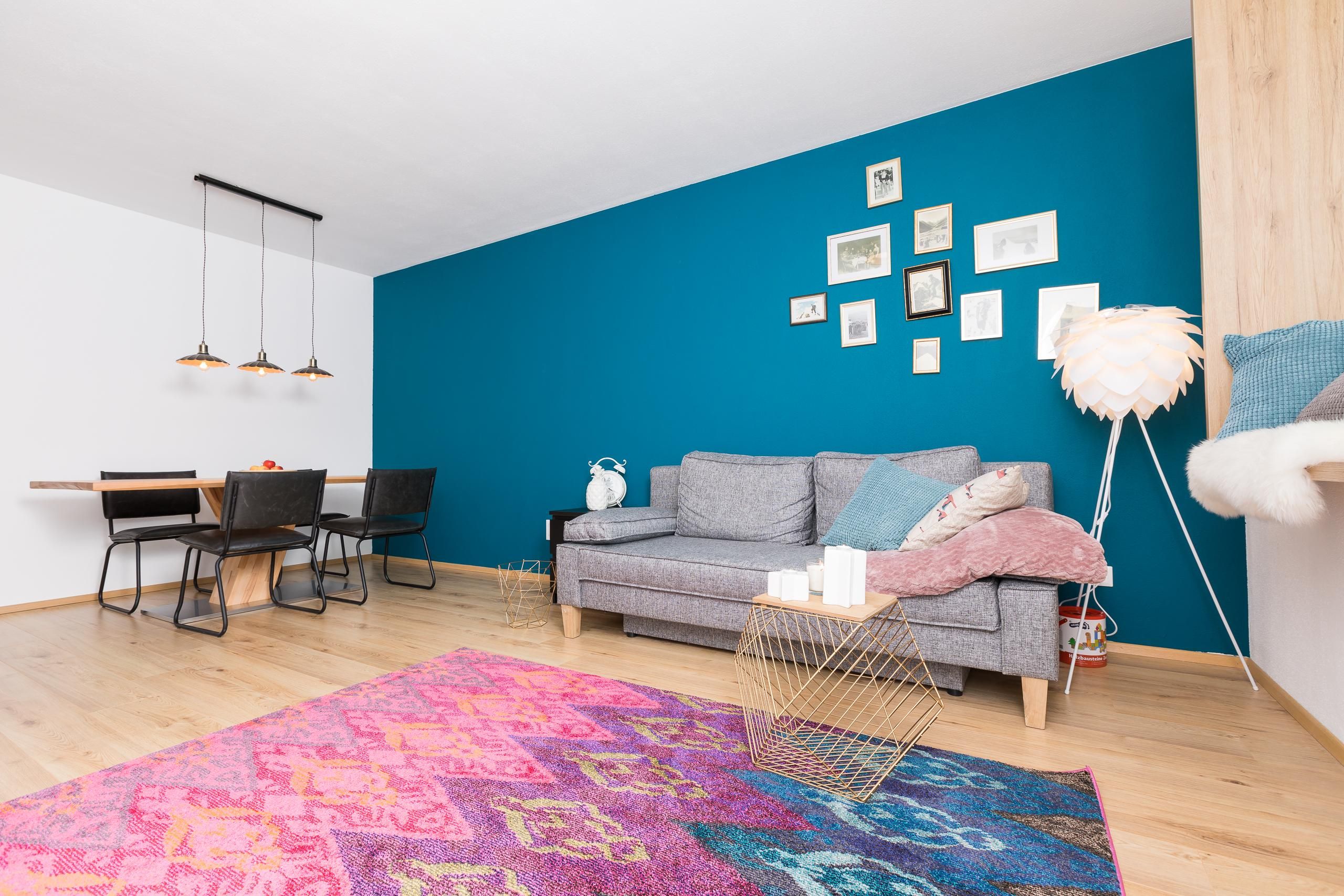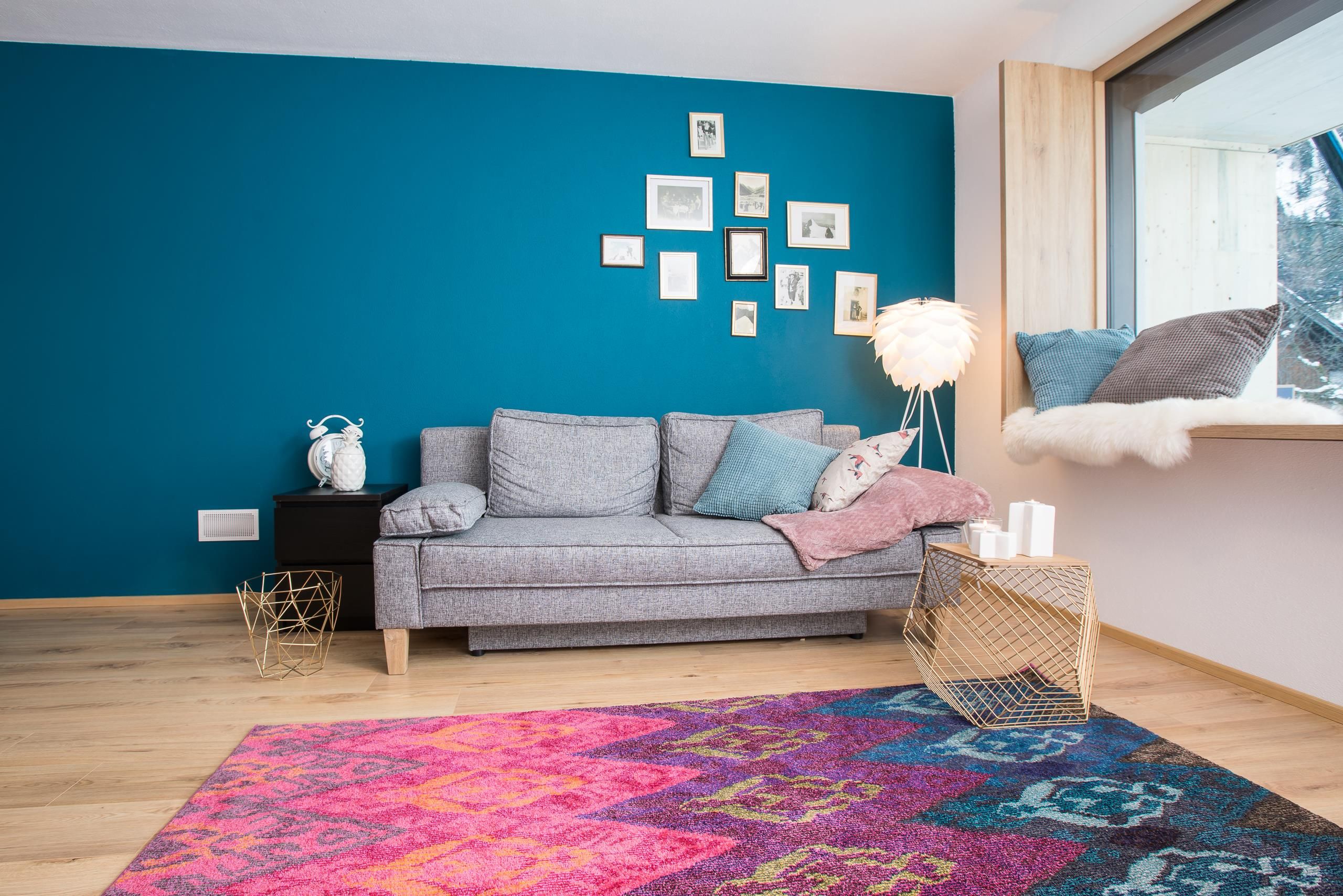 Im großen Wohnbereich findet sich der Esstisch, und das Herz der Wohnung das Lümmelfenster mit Panoramablick zum Stubaier Gletscher sowie die ausziehbare Couch.