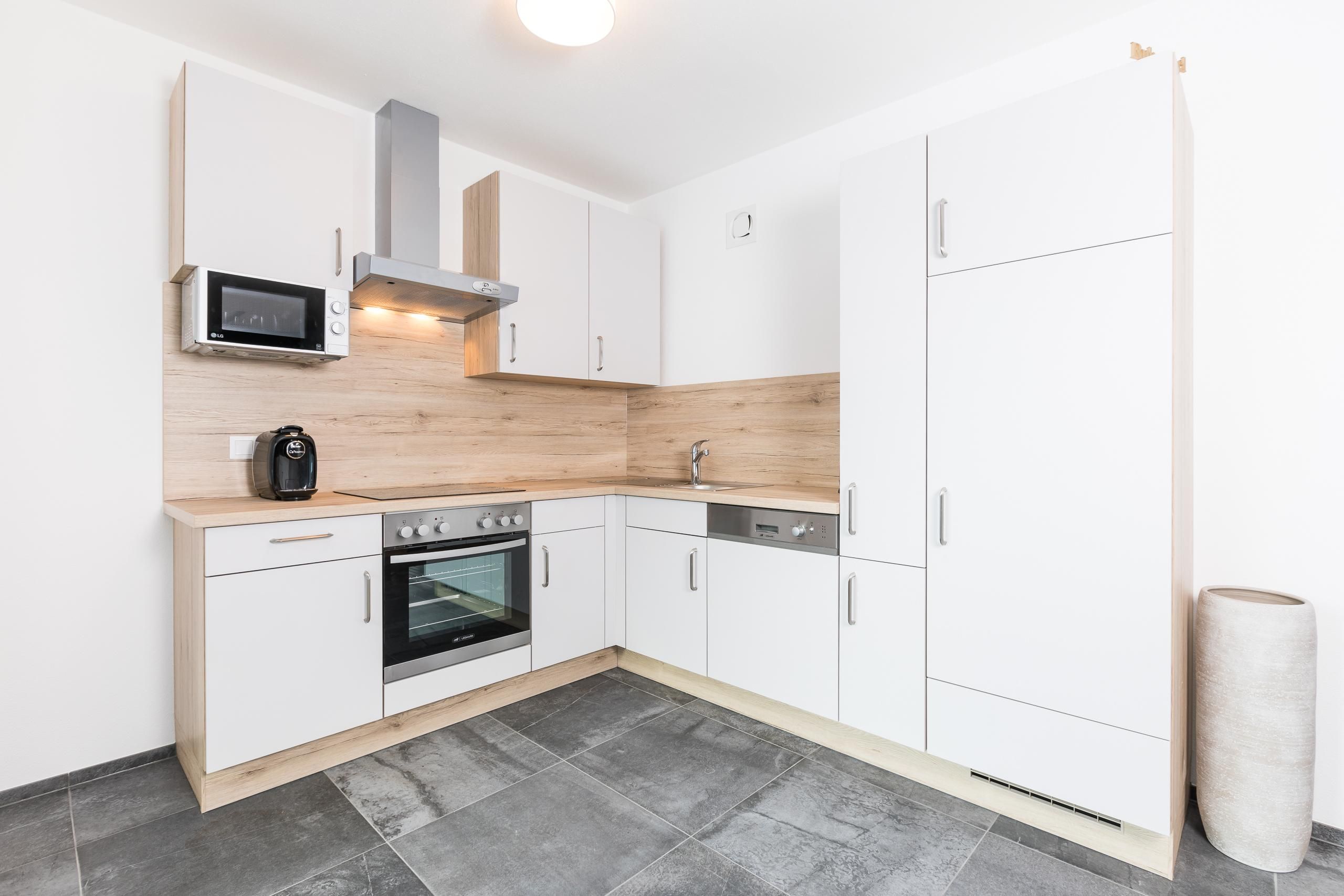 Die Wohnküche ist vollausgestattet mit Microwelle, Backrohr und Geschirrspüler.