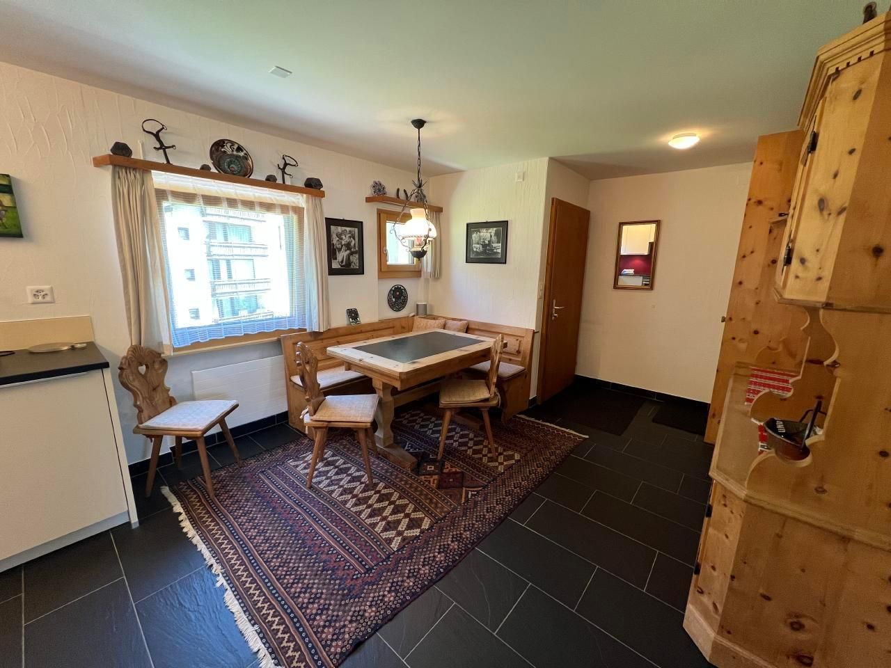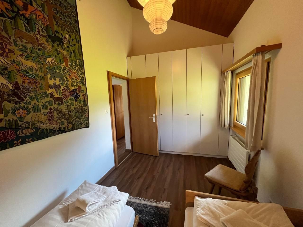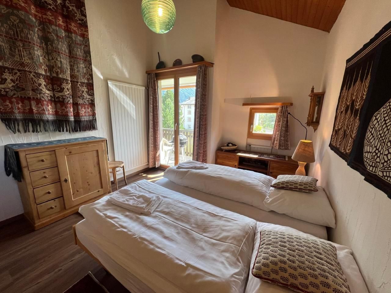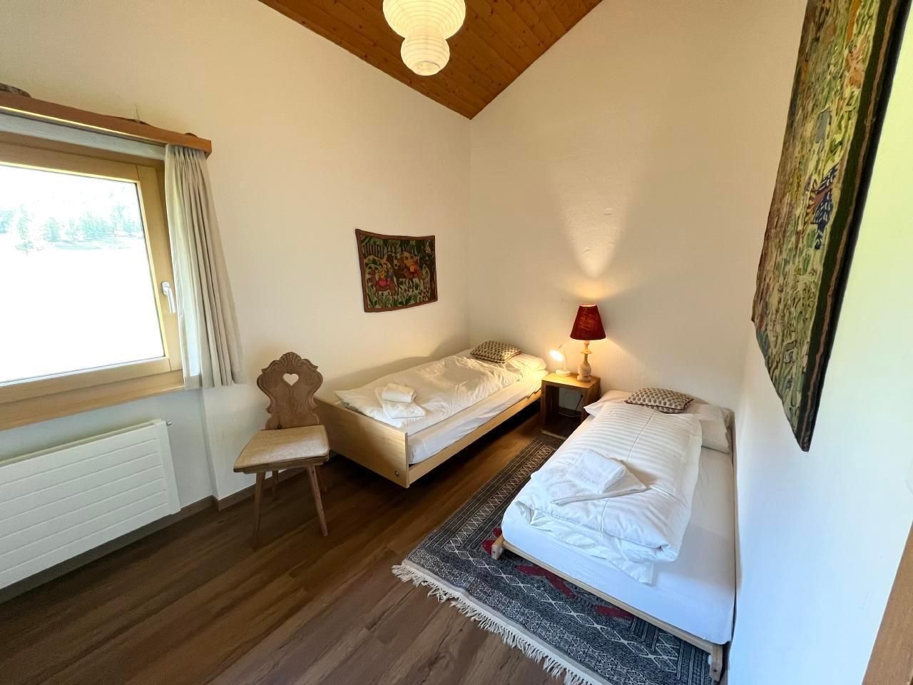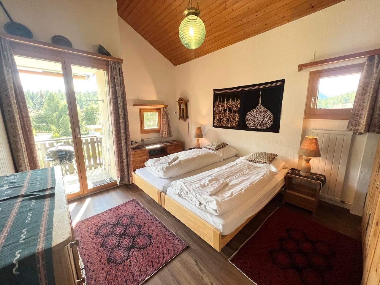 **Innenbereich:** Die Wohnung ist kinderfreundlich gestaltet und verfügt über ein einladendes Wohn-/Esszimmer mit Zugang zum Balkon sowie zwei Schlafzimmer - eines mit Doppelbett und das andere mit zwei Einzelbetten. Die moderne und gut ausgestattete Küche bietet alles, was Sie für die Zubereitung köstlicher Mahlzeiten benötigen, inklusive Wasserkocher und Nespressomaschine. Das Badezimmer ist mit einer Badewanne ausgestattet. Des Weiteren steht eine Gemeinschafts-Waschmaschine sowie ein Skiraum und ein Wachsraum zur Verfügung.