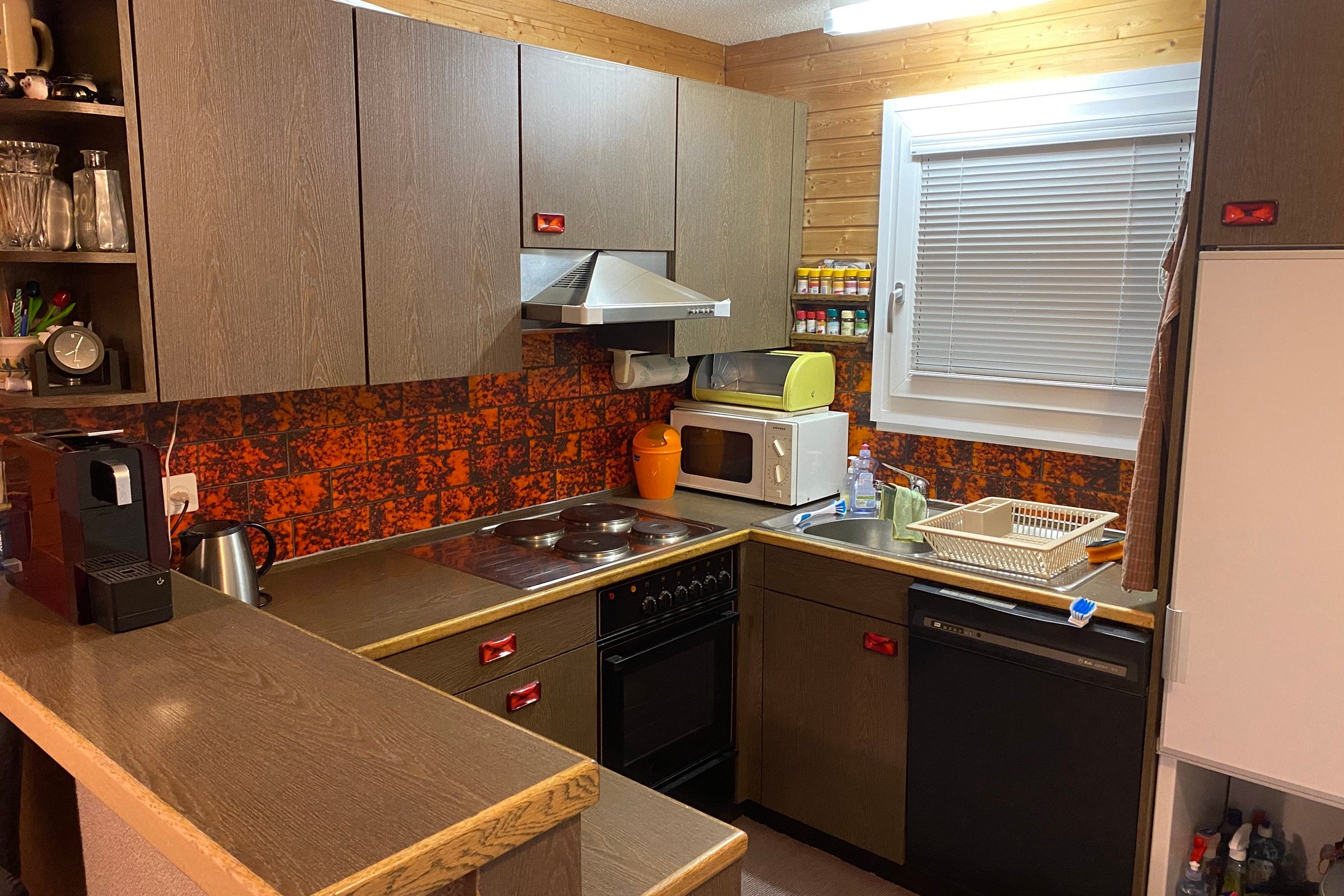 Die offene, komplett ausgestattete Küche verfügt über einen Kochherd, einen Backofen, einen Geschirrspüler, eine Delizio-Kaffeemaschine, einen Kühlschrank, eine Mikrowelle, einen Wasserkocher und einen Toaster.