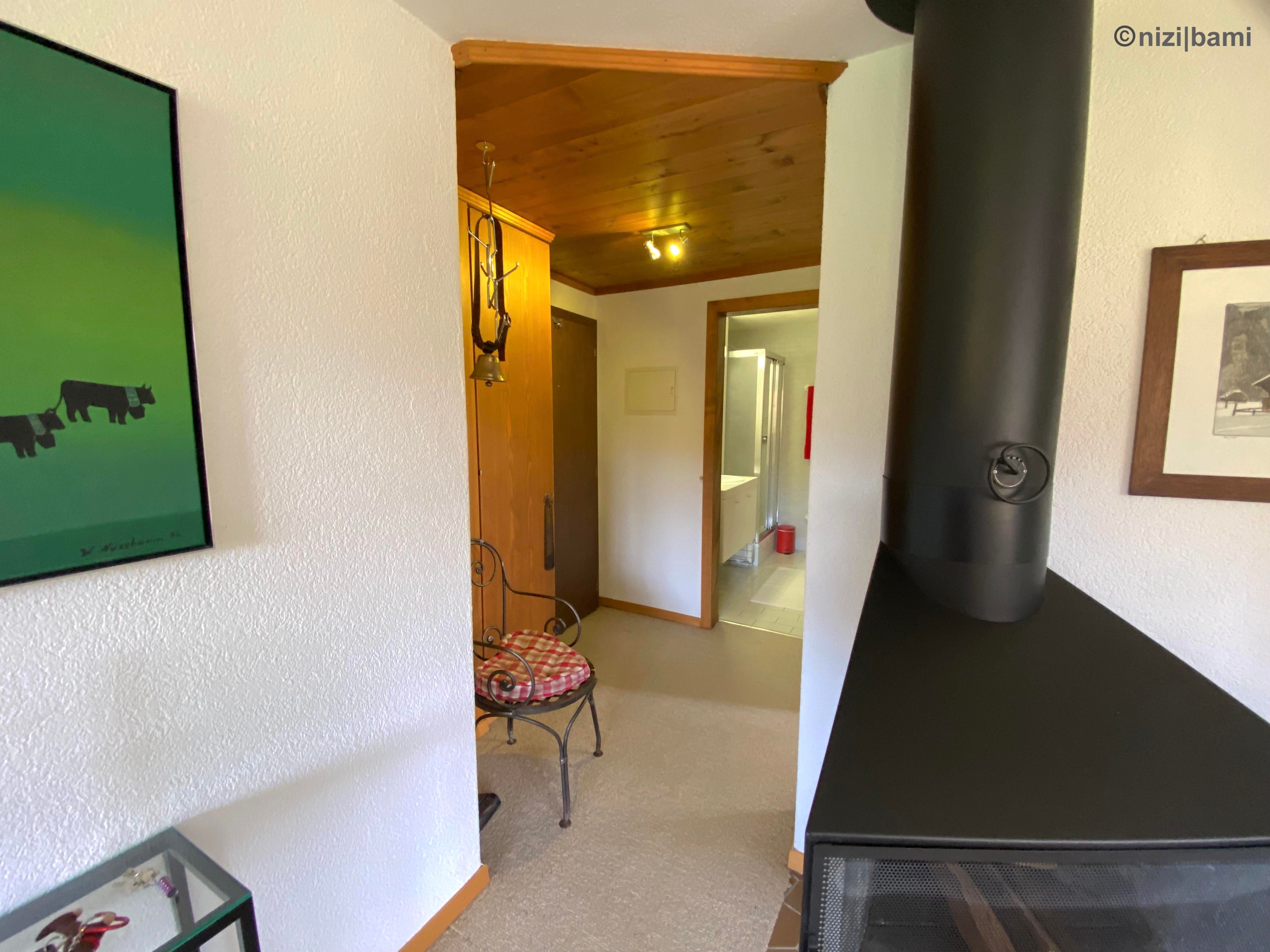 Gepflegte, ruhige und an sonniger Lage gelegene 2,5-Zimmer-Wohnung, zirka 50 m², im Erdgeschoss eines Chalets mit insgesamt 6 Wohnungen.