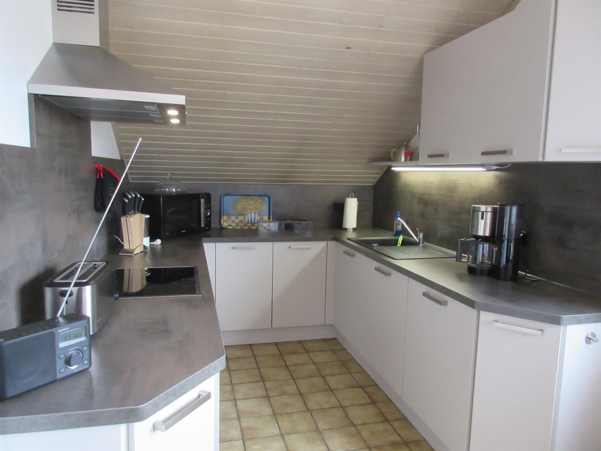• komplett eingerichtete Küche mit Esstisch und 4 Stühlen, sowie Elektroherd mit Backofen, Geschirrspülmaschine, Kühlschrank, Kaffeemaschine, Mikrowelle, Toaster, Digitalradio
