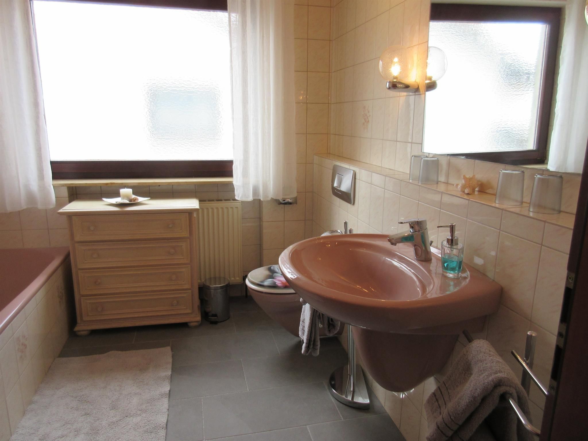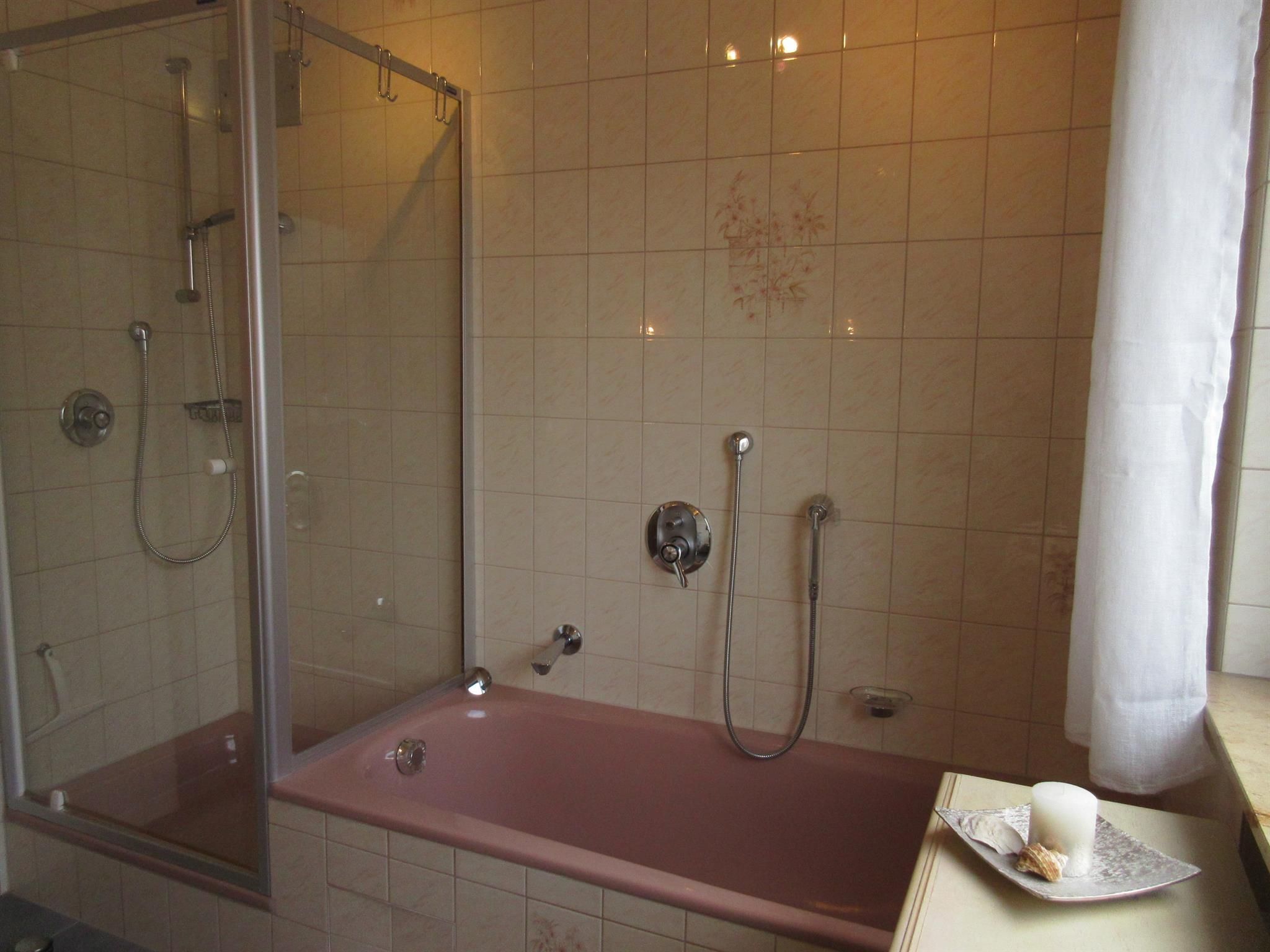 • Bad mit Waschbecken - Dusche - Badewanne - WC - großes Fenster