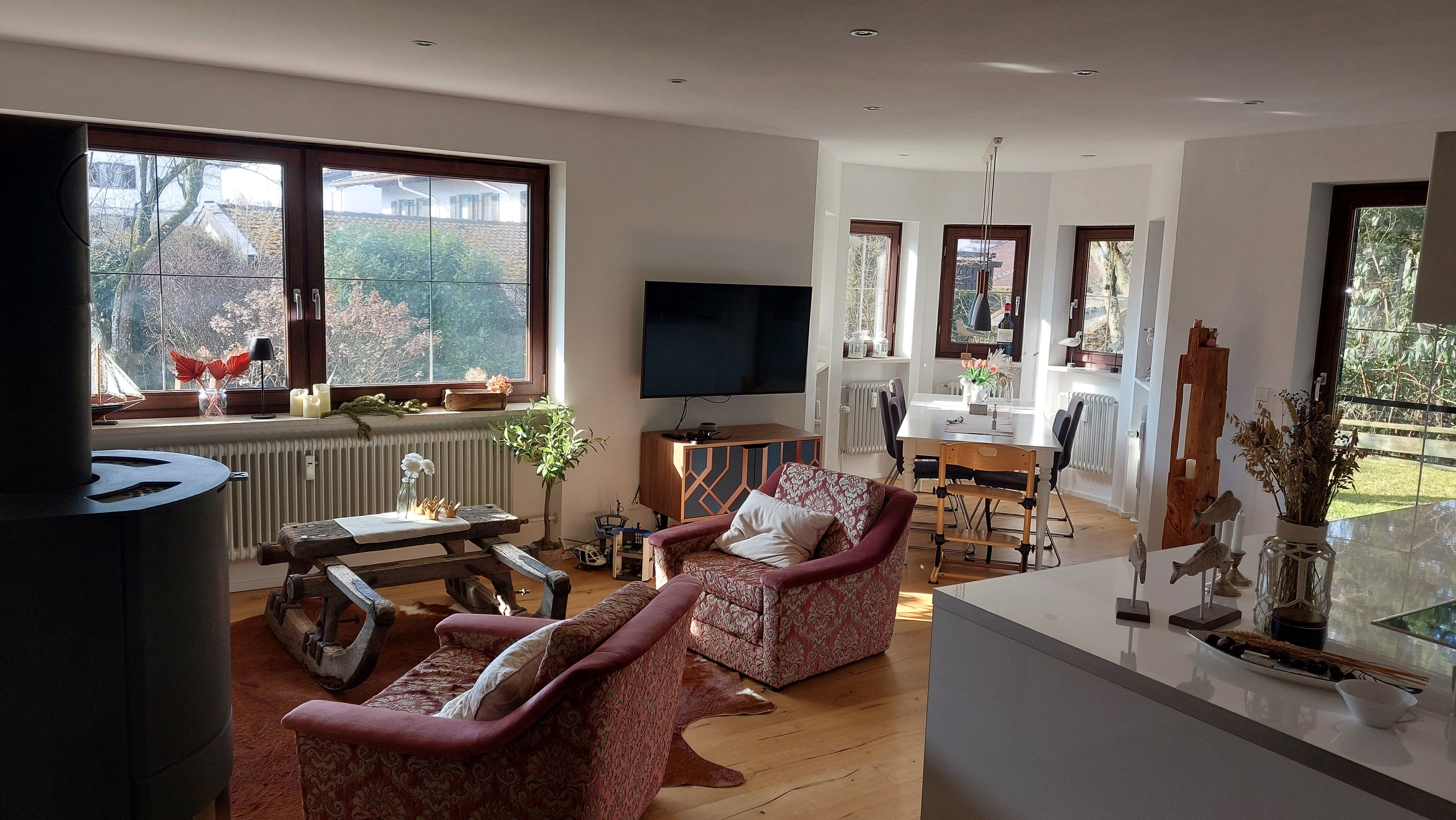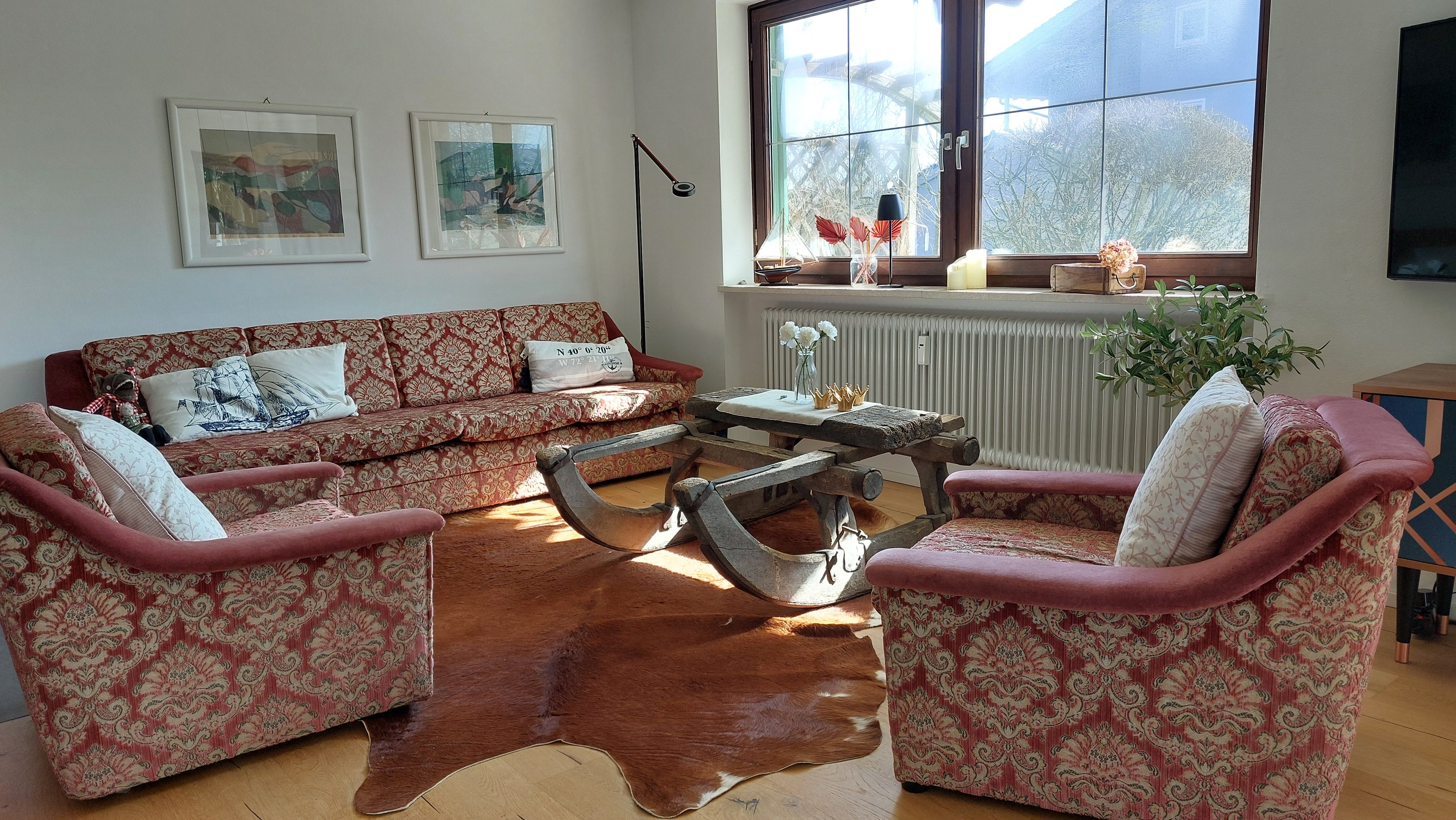 • Wohnbereich mit Charme – Modern und urig zugleich, lädt er mit einem antiken Holzschlitten als Couchtisch auf einem Kuhfell und einem Flachbildfernseher zum Entspannen ein. Der Blick ins Grüne und auf den Garten sorgt für eine besonders entspannte Stimmung.