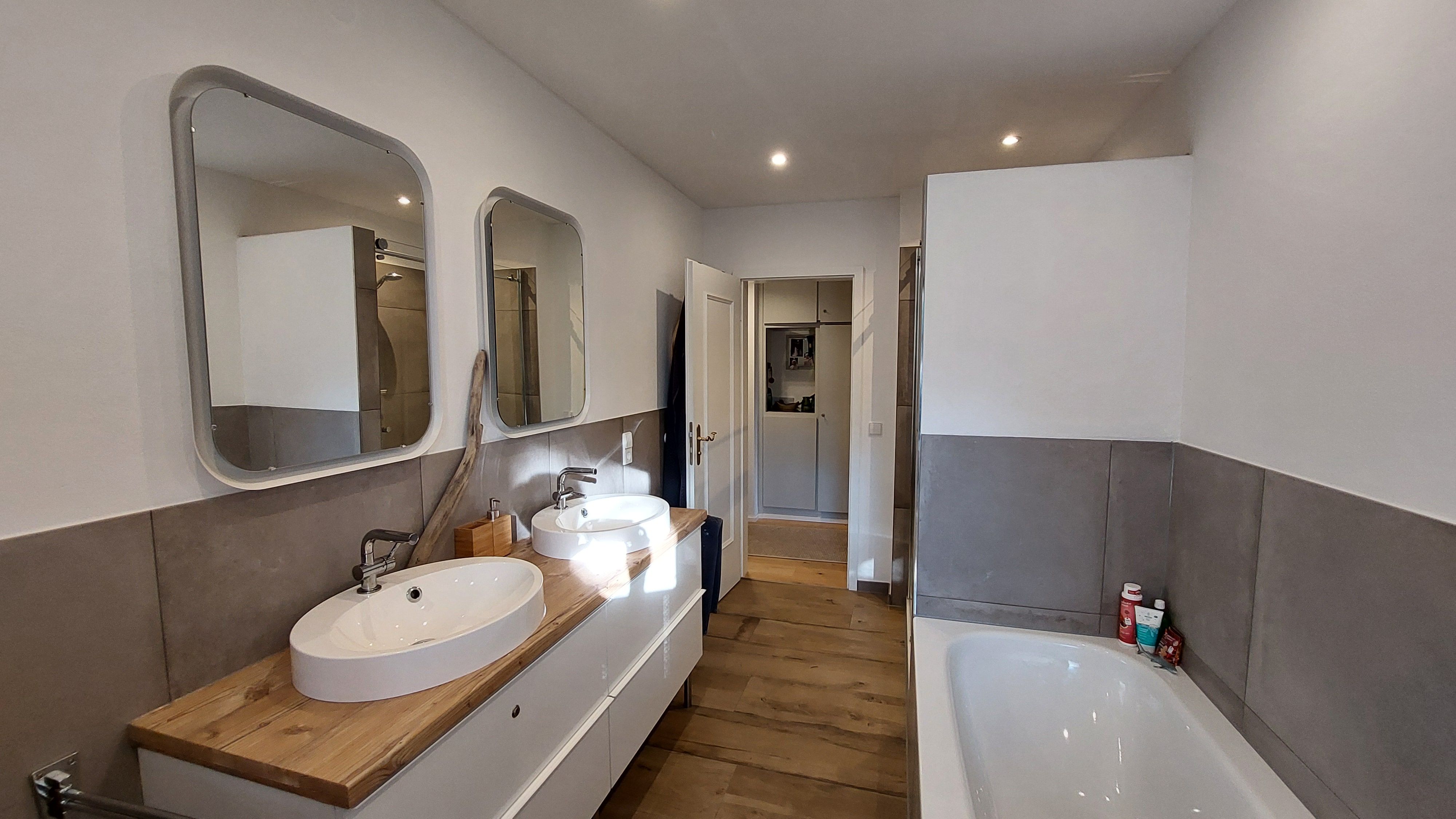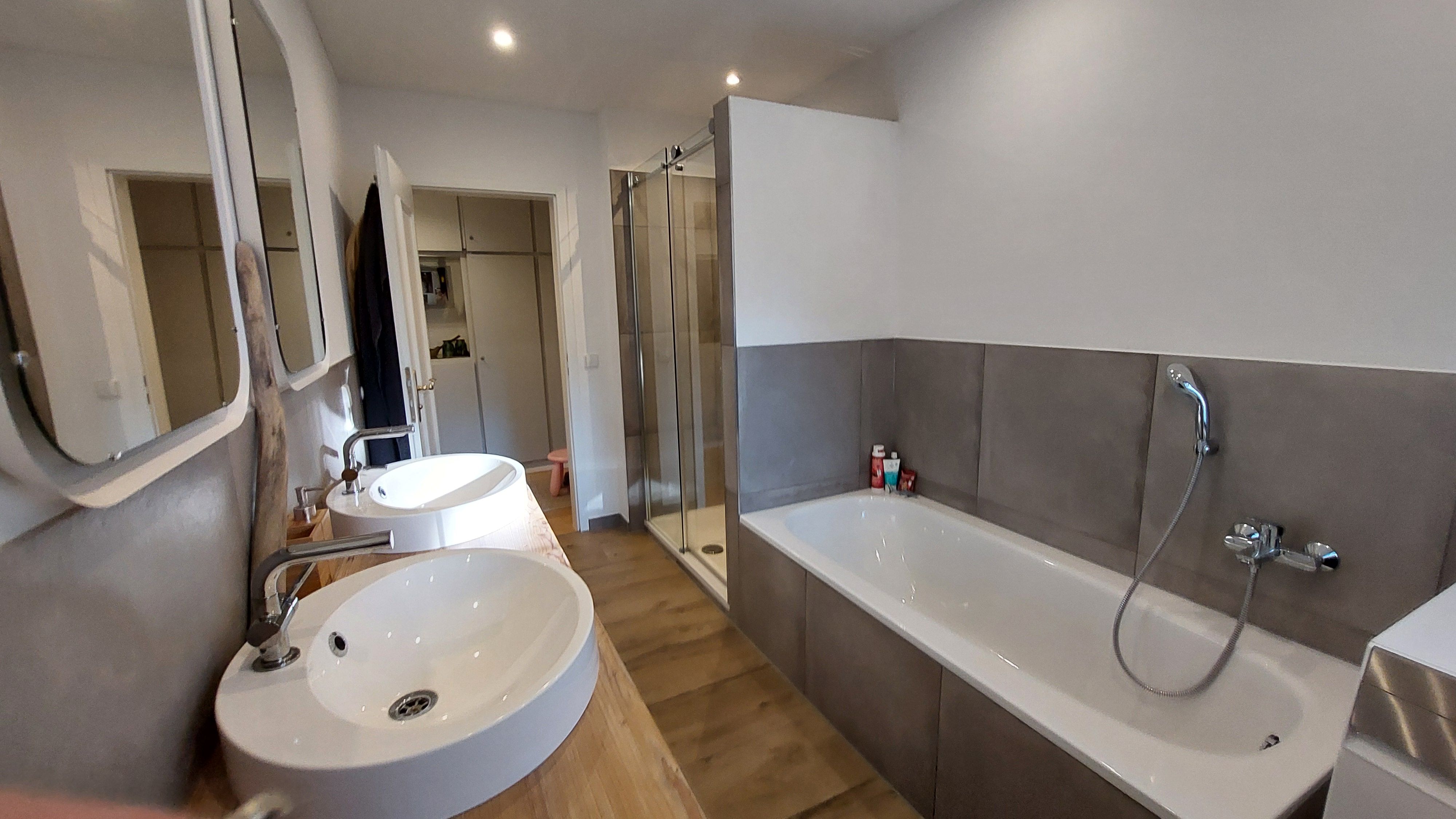 • Modernes Badezimmer – Mit Dusche, Badewanne und Doppelwaschbecken ausgestattet, um Ihnen maximalen Komfort zu bieten.