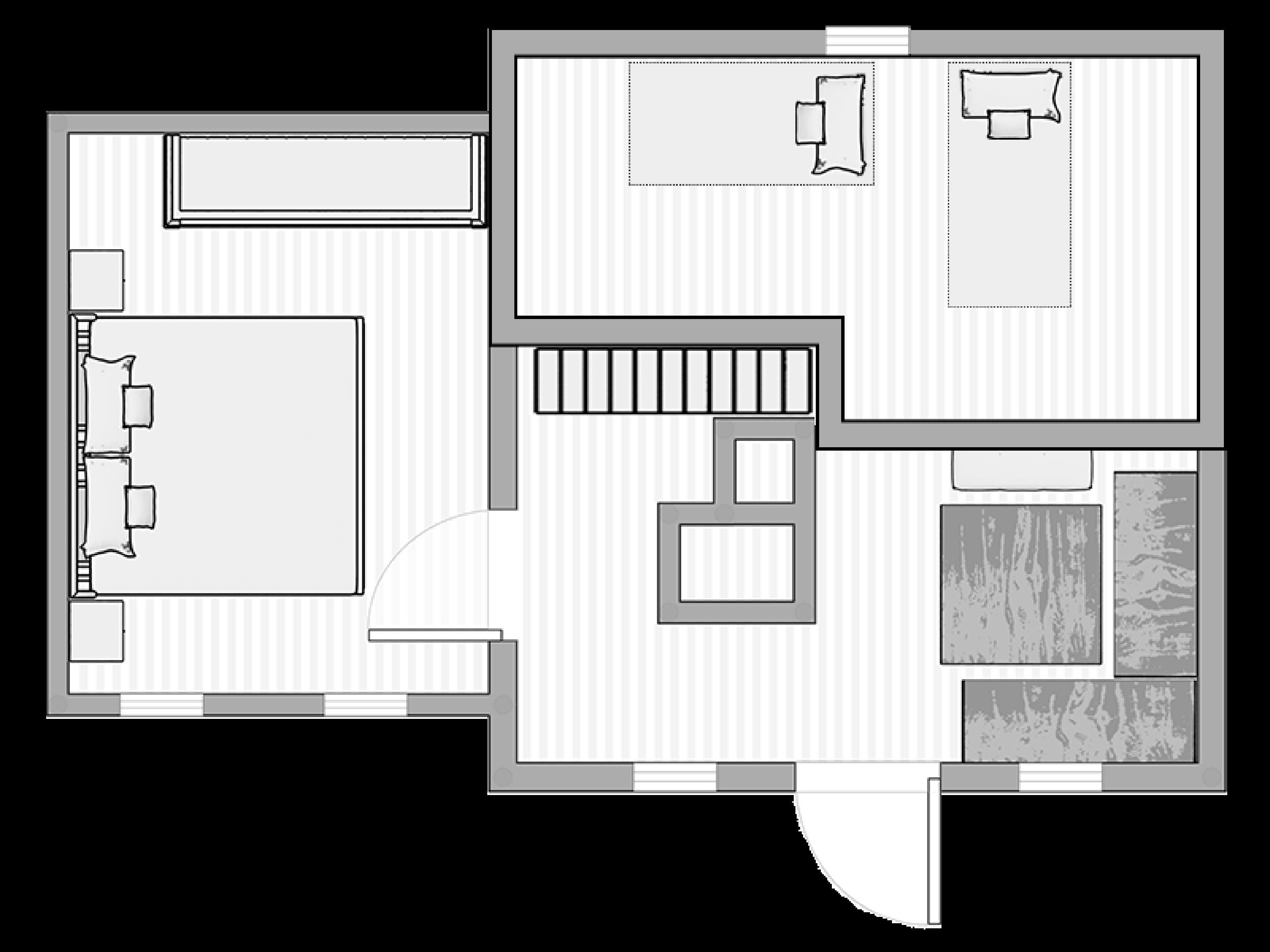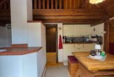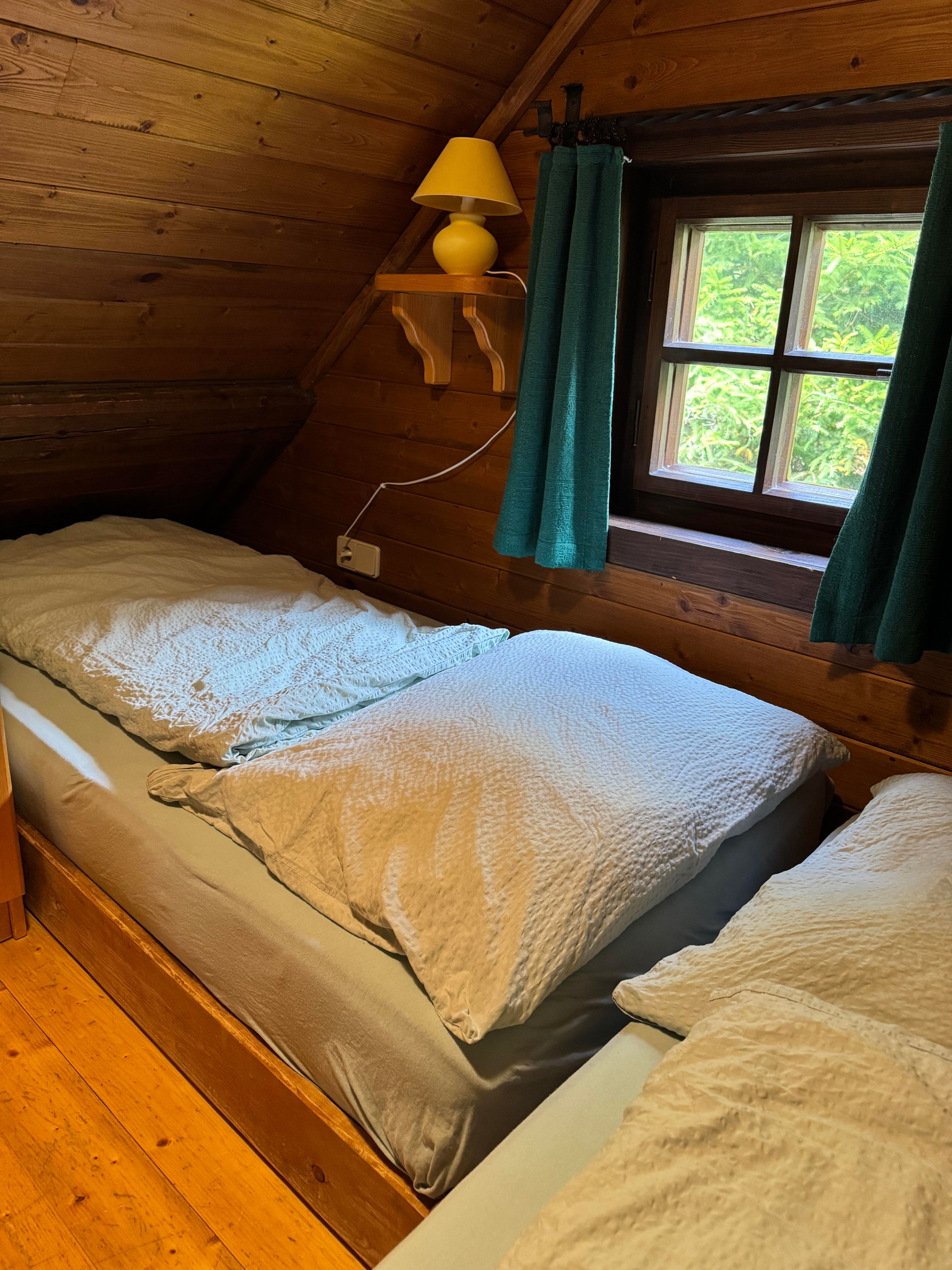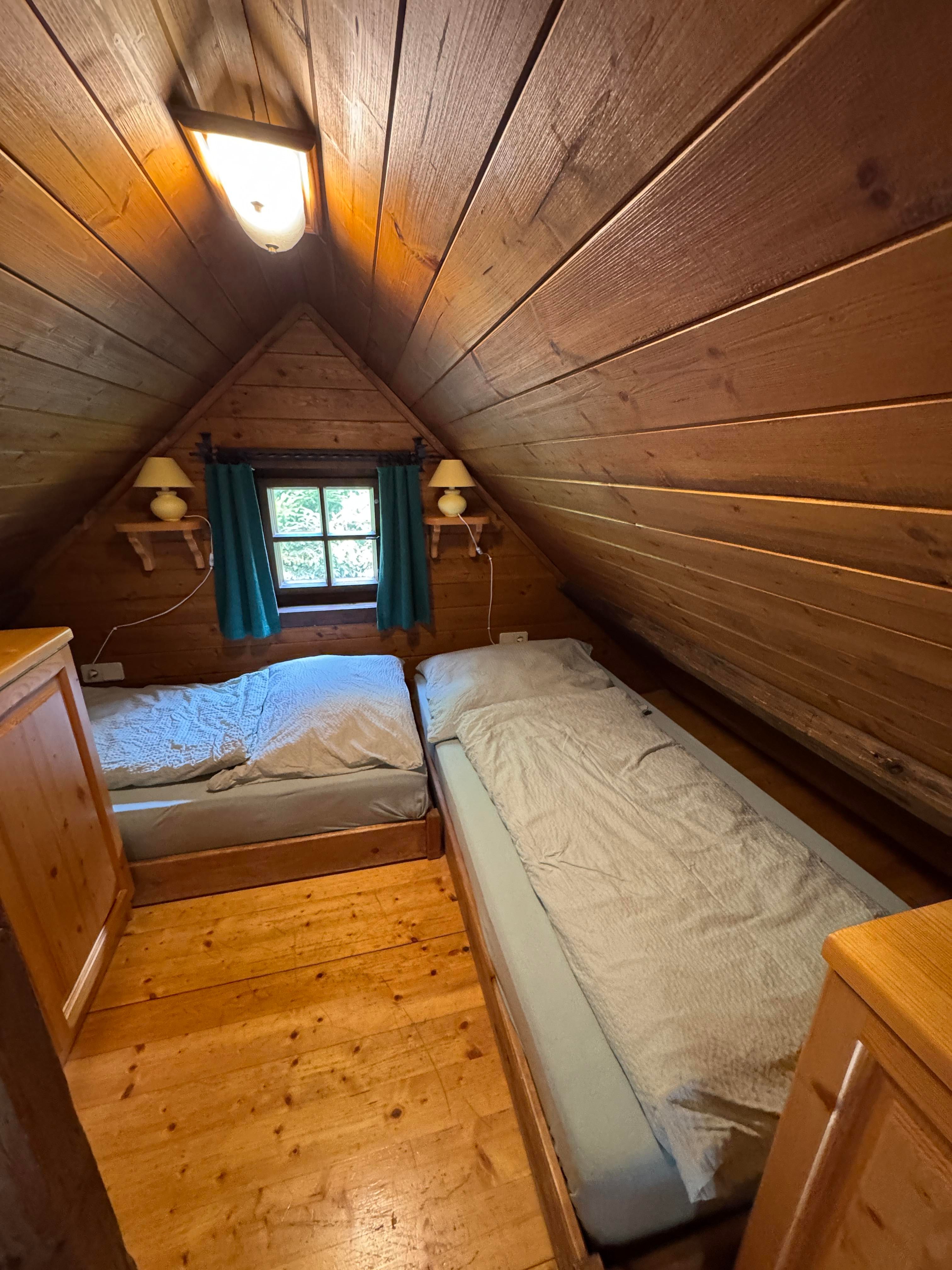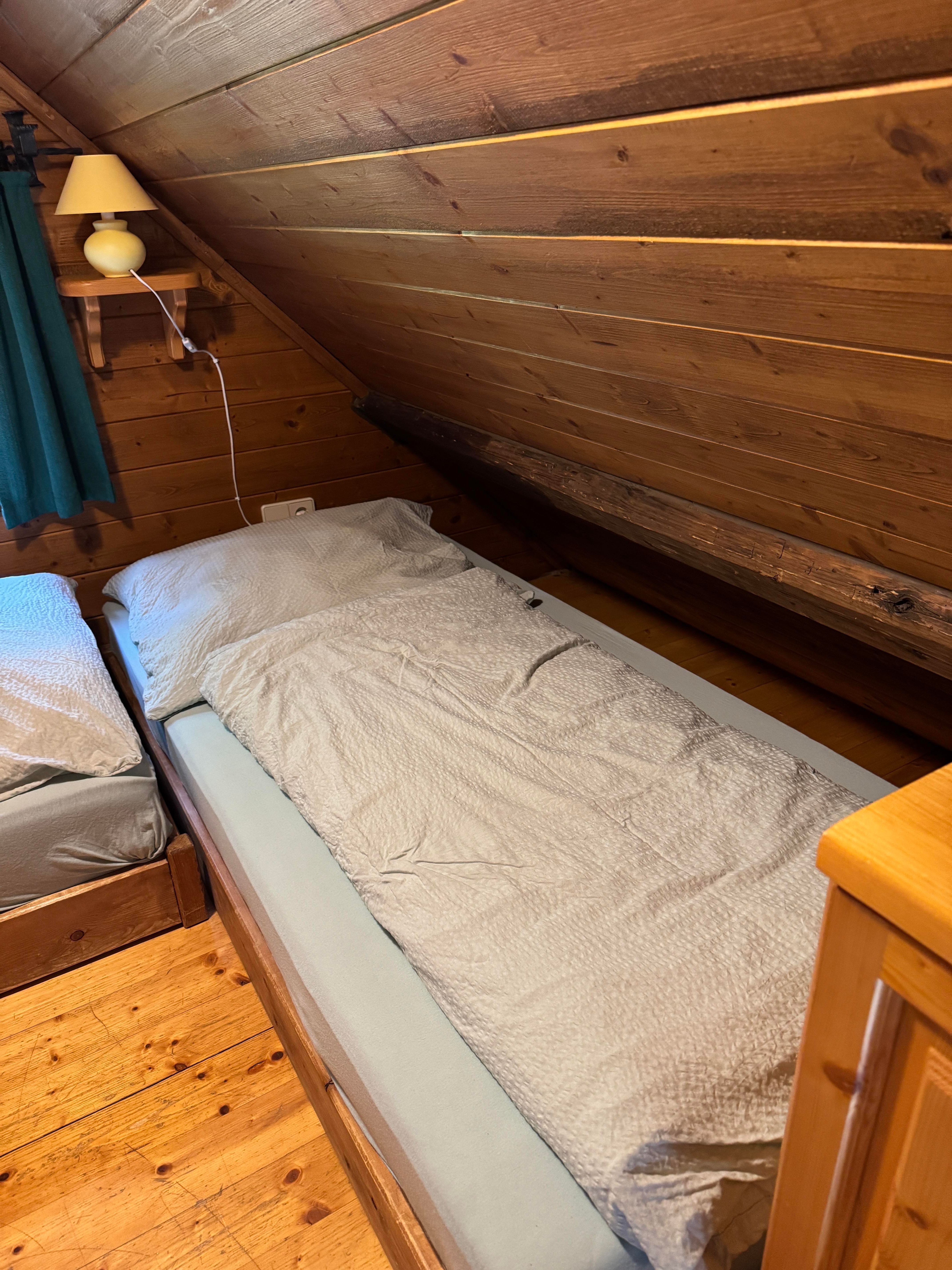 Über eine Treppe gelangen Sie zur offenen Galerie, die mit zwei Einzelbetten ausgestattet ist – ideal für Kinder oder zusätzliche Gäste.