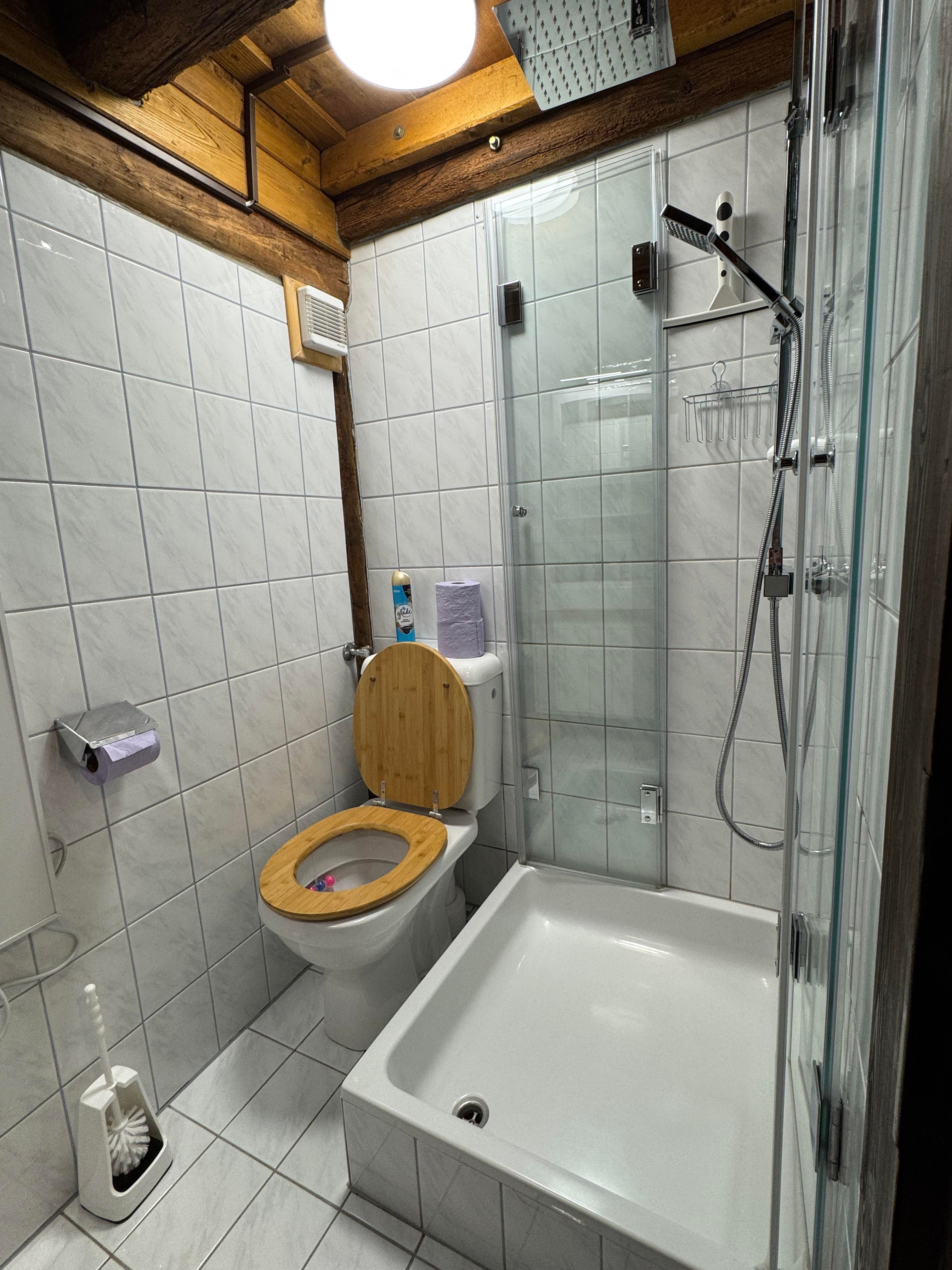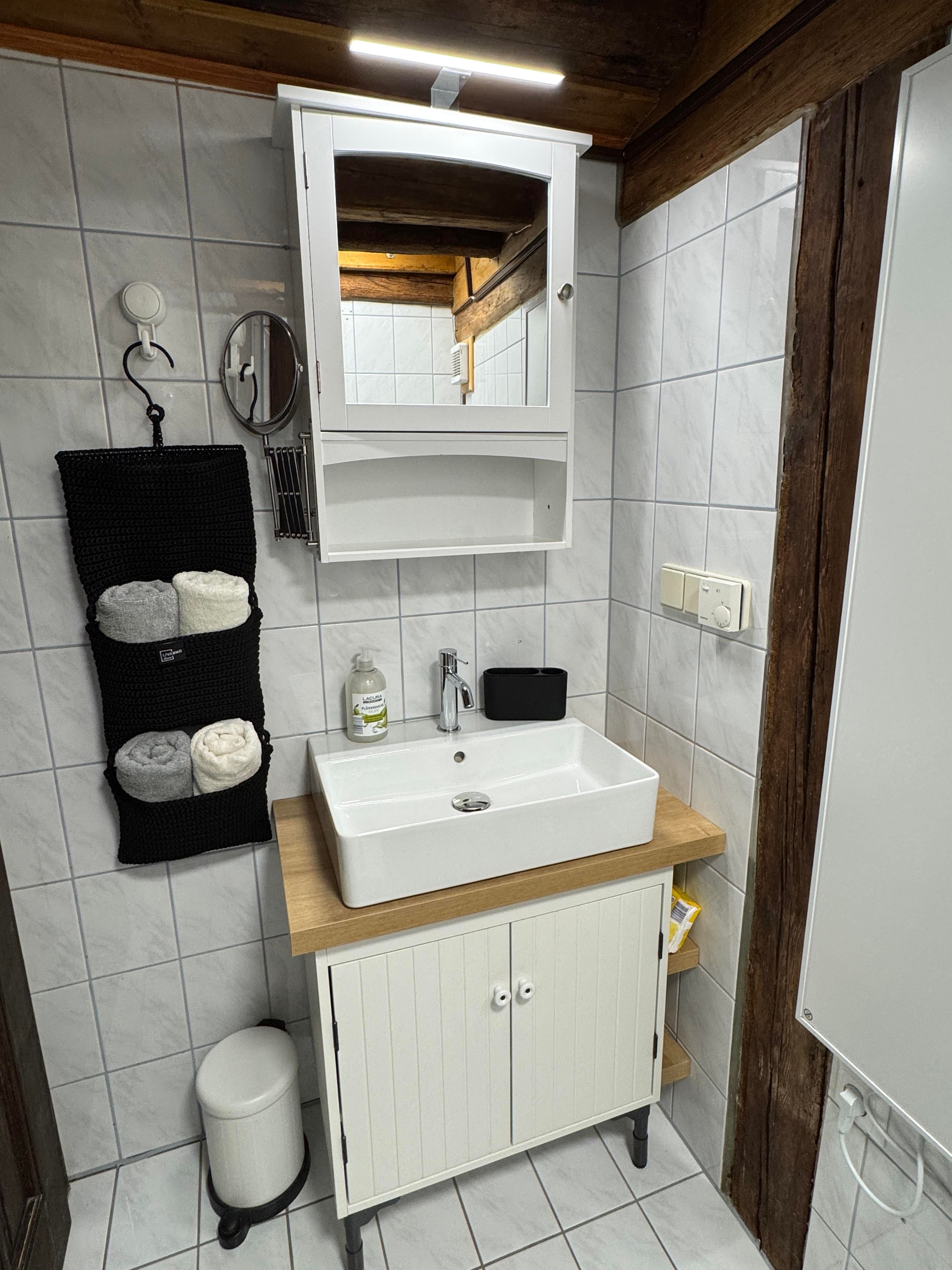 Im Erdgeschoß befinden sich ein freundlicher Eingangsbereich, ein Badezimmer mit WC, ein offener Wohn- und Essbereich sowie ein Schlafzimmer mit Doppelbett.