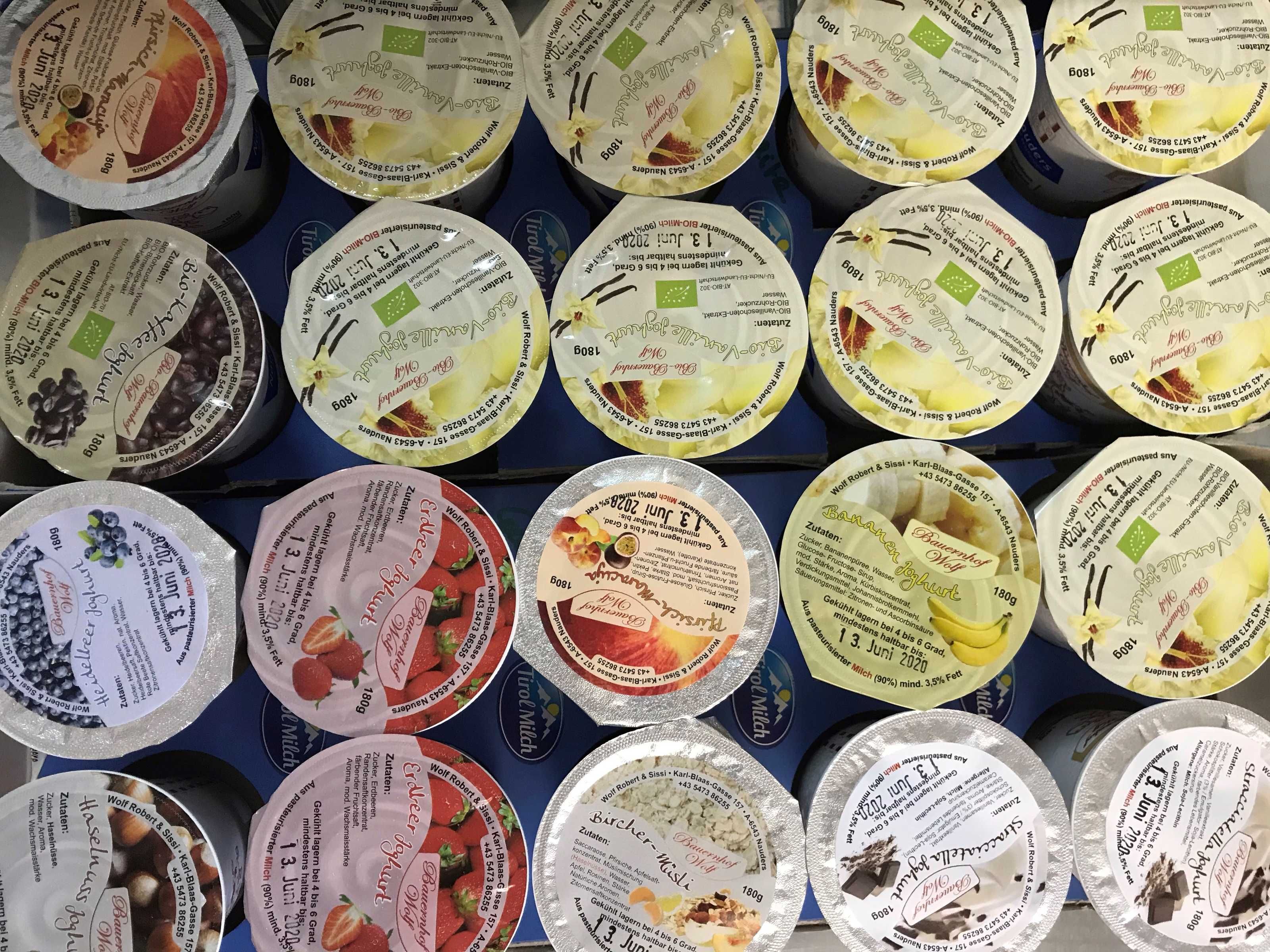 Wie es sich für einen richtigen Bauernhof gehört, gibt es natürlich auch eigene Hofprodukte wie Milch, versch. Sorten Joghurt und Topfen.