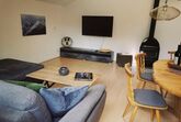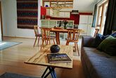 Großzügiger Wohn- und Kochbereich mit direktem Zugang zu wunderschöner Sonnenterasse. Moderne vollausgestattete Küche (Kühlschrank, Spül- und Kaffeemaschine, Wasserkocher, Herd und Ofen) mit eleganter Theke Richtung Esstisch. Wohnzimmer mit einladender Sitzecke, ausziehbar als Schlafcouch für 2 Personen, großer Flachbildschirm mit Sateliten-TV.